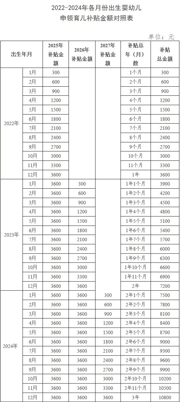 (1)对于2025年1月1日及以后出生的婴幼儿,可连续申领3年补贴,共计10800元。