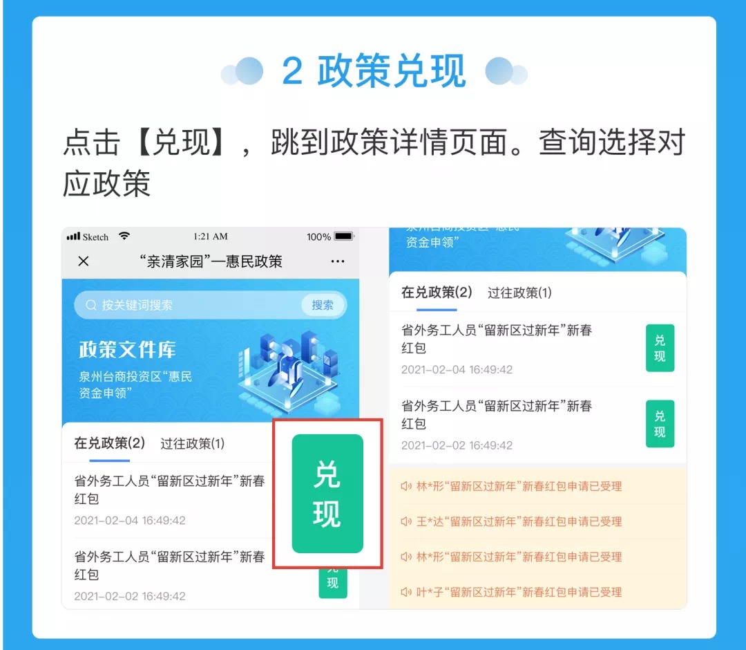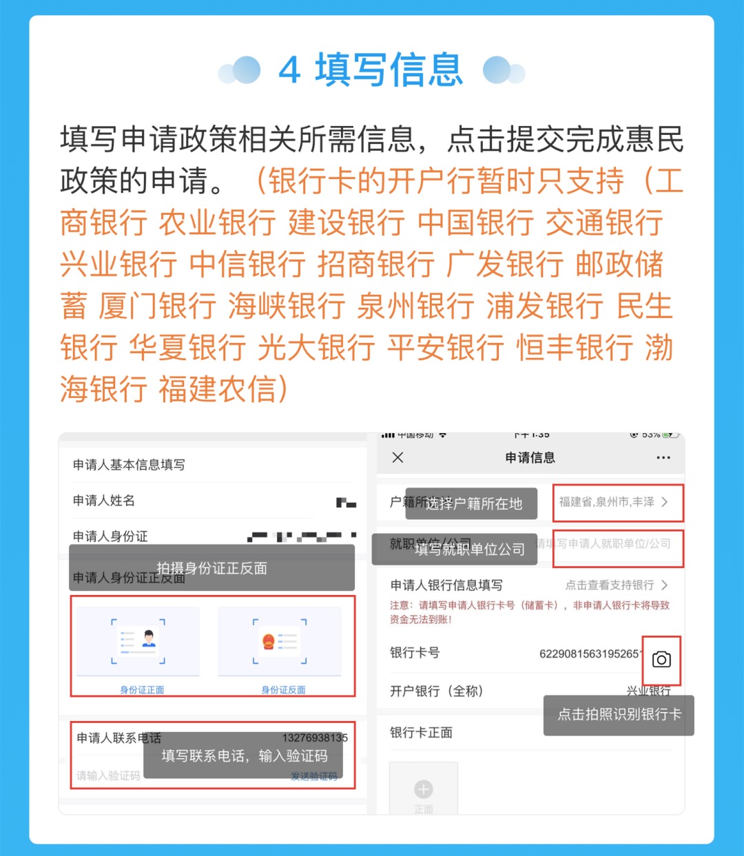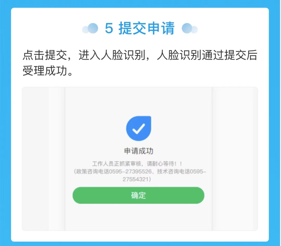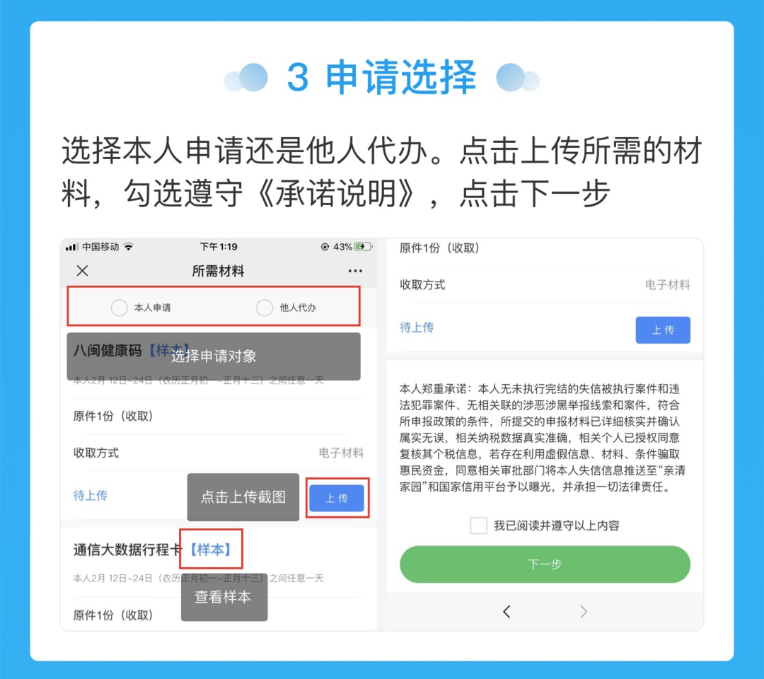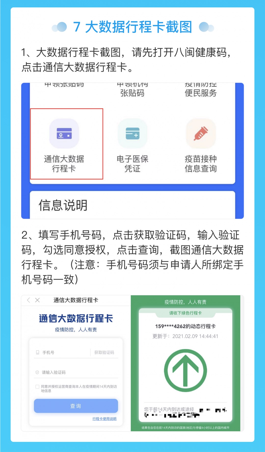 (2)提交申请:符合条件的省外务工人员通过“泉州台商投资区行政服务中心”微信公众号“亲清家园”平台提交:本人居民身份证(正反面图片)和本人2月12日-24日(农历正月初一-正月十三)之间任意一天的“八闽健康码”和“通信大数据行程卡”截图。