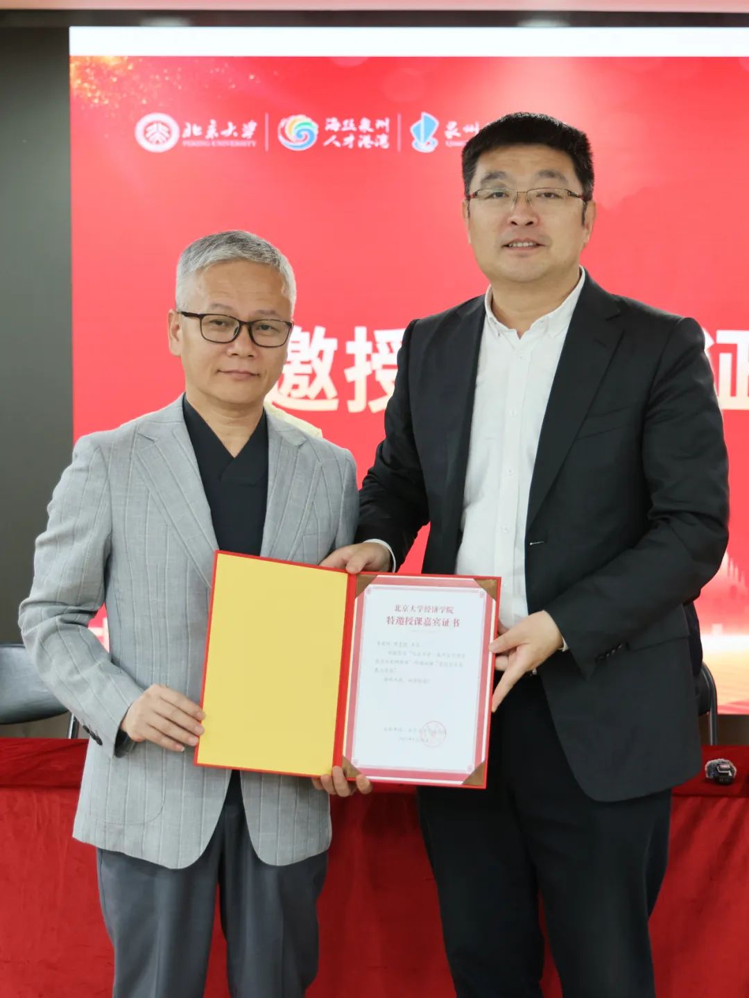 开班式上,学员代表黄泽忠、邱臻彧发言,他们表示将珍惜研修班难得的学习机会,认真钻研课程内容,力求将所学的先进理念和专业知识精准转化为推动企业创新发展的务实举措,以实际行动助力自身企业在行业竞争中实现新突破。开班仪式上,北京大学经济学院院长张辉为泉州晋江市政协副主席、晋江市工商联主席、劲霸男装(上海)有限公司董事长洪忠信颁发特邀授课嘉宾证书