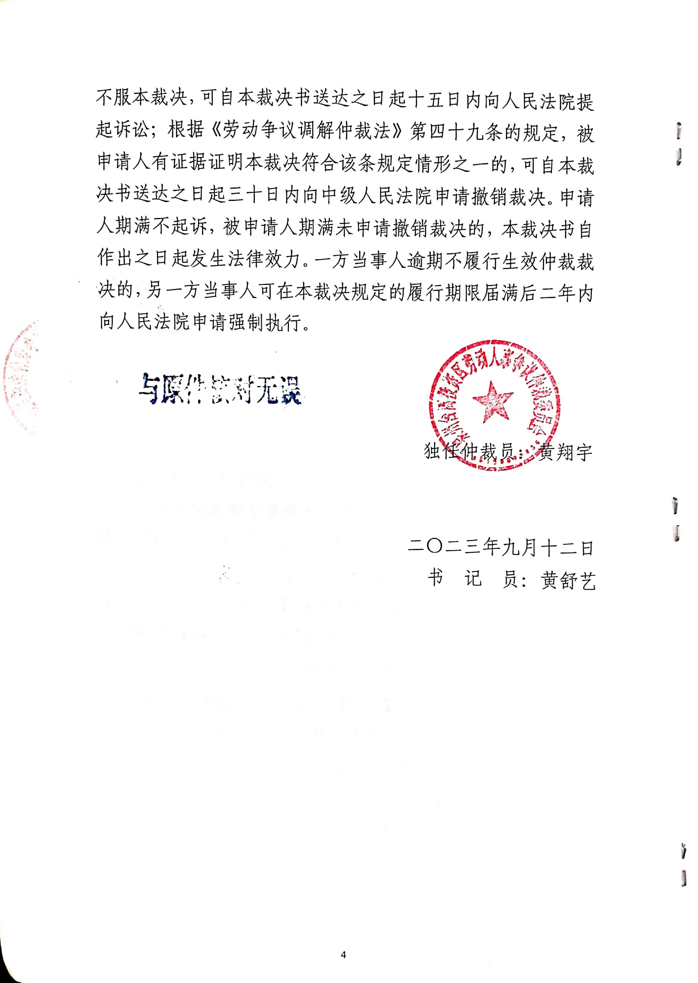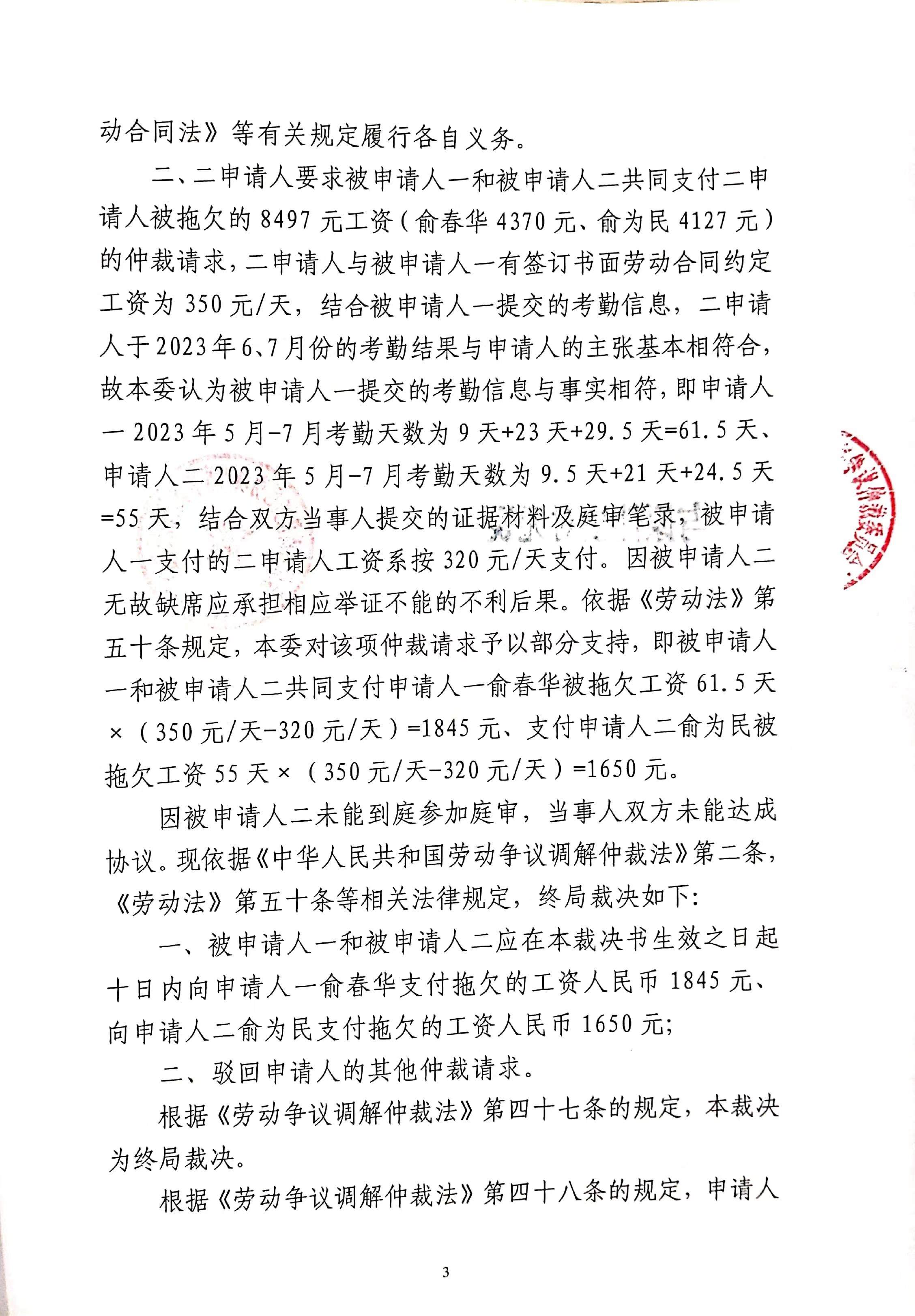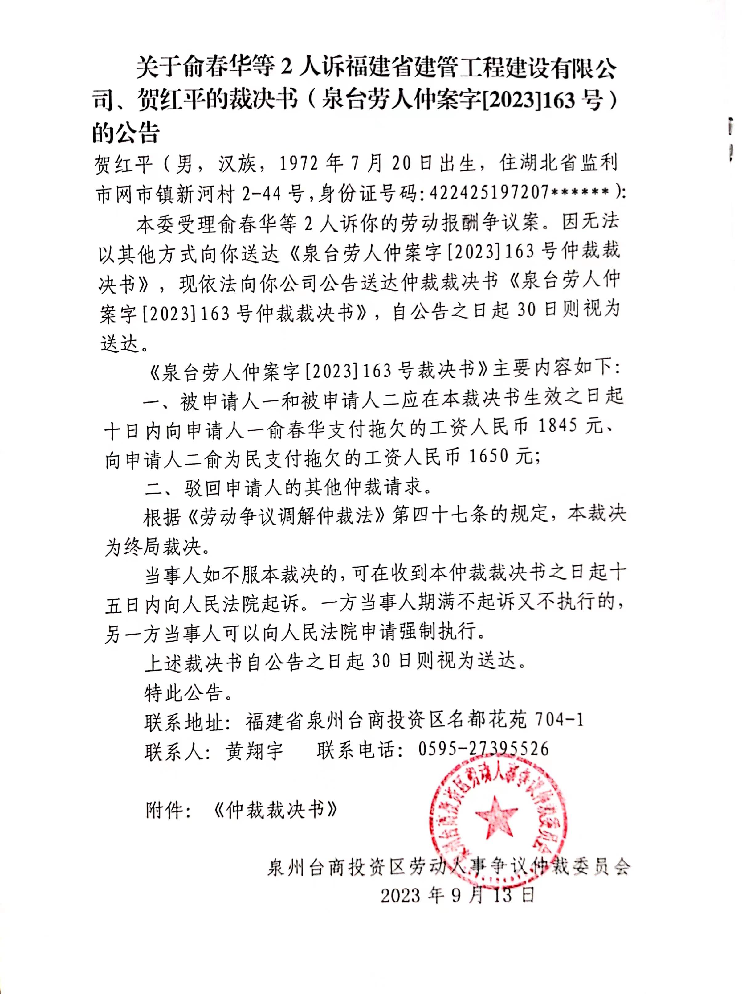 关于俞春华等2人诉福建省建管工程建设有限公司、贺红平的裁决书(泉台劳人仲案字[2023]163号)的公告