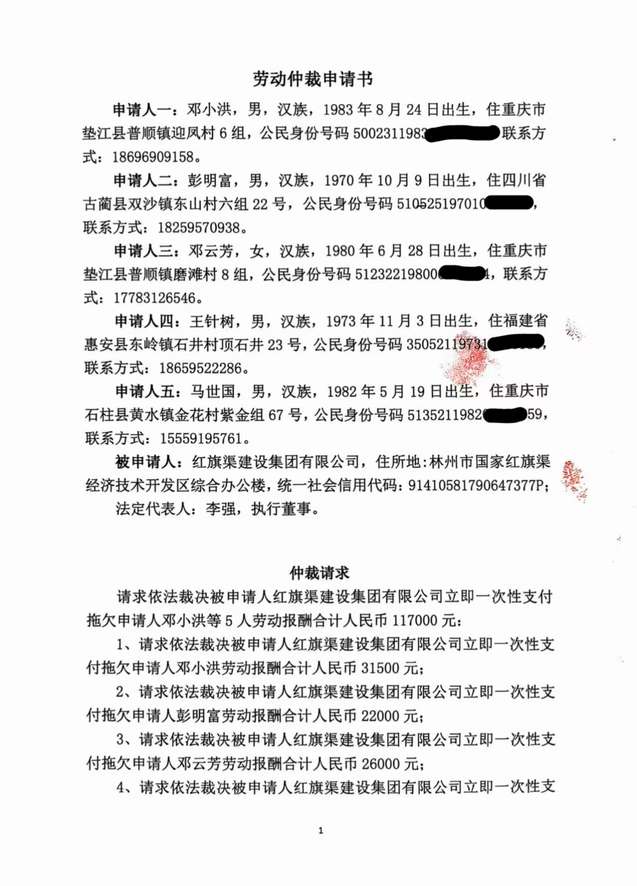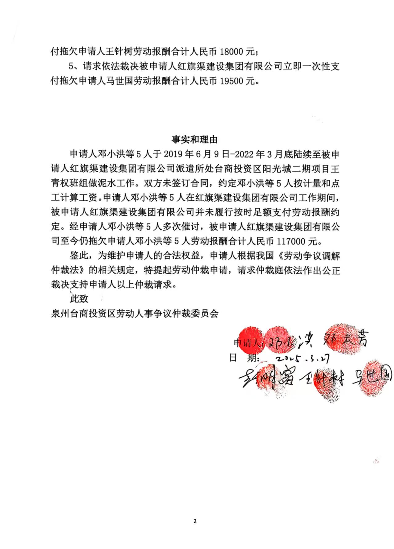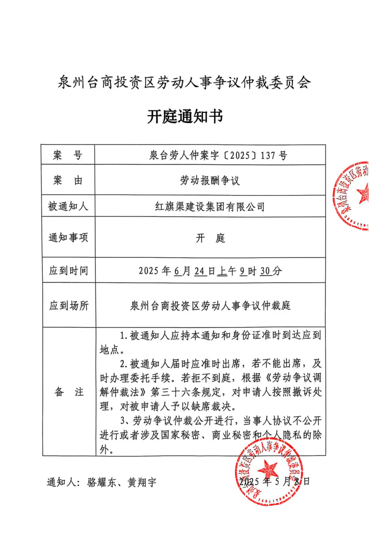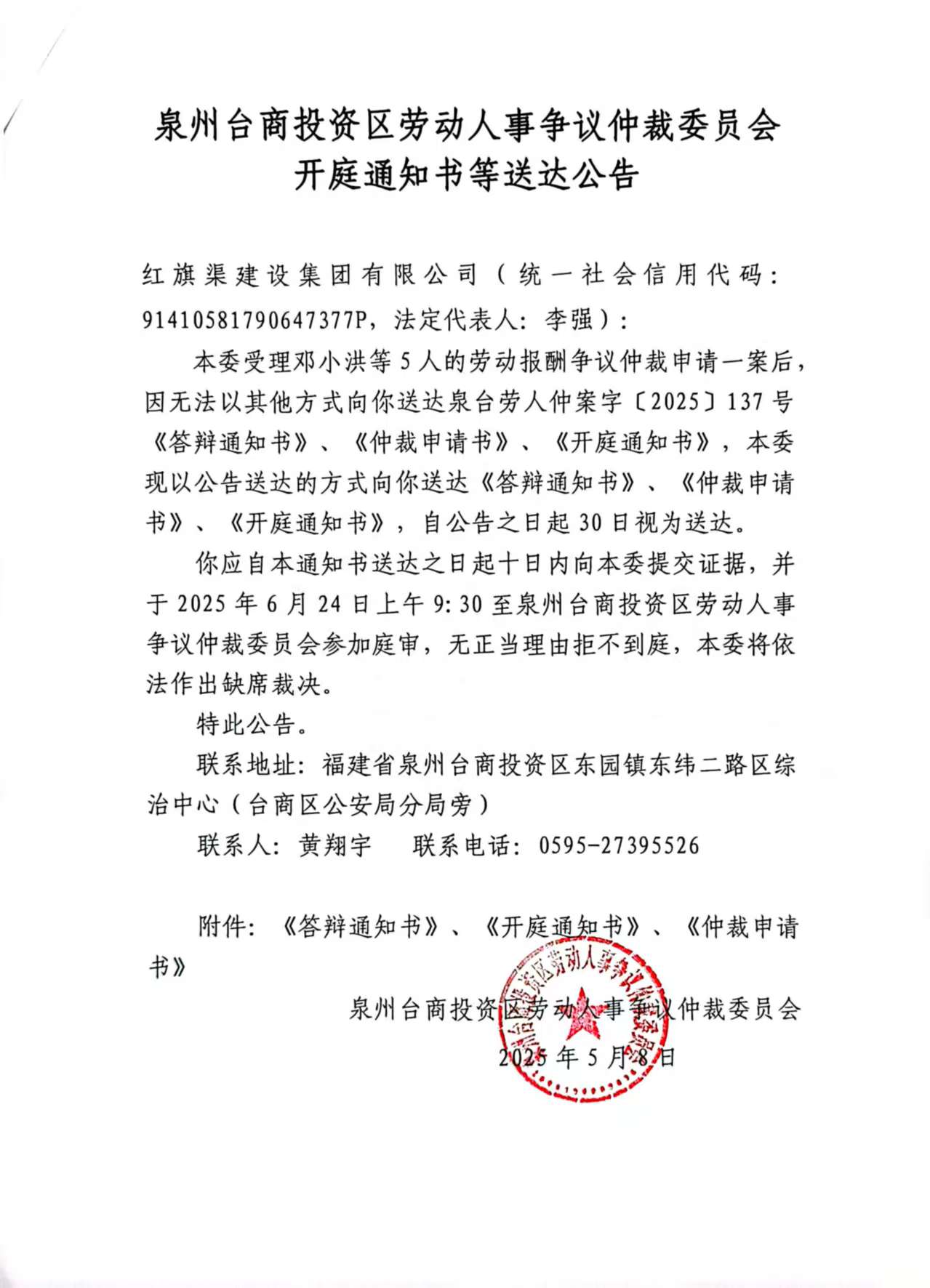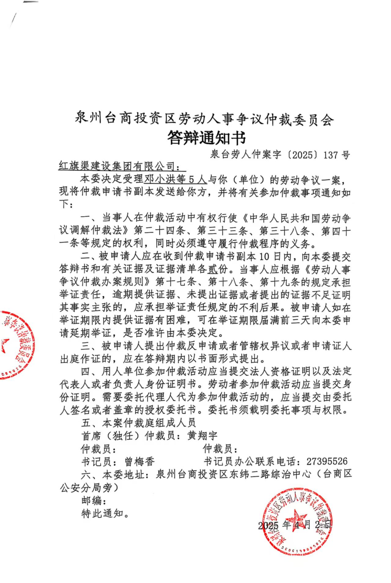 关于邓小洪等5人诉红旗渠建设集团有限公司(泉台劳人仲案字[2025]137号)仲裁文书的公告