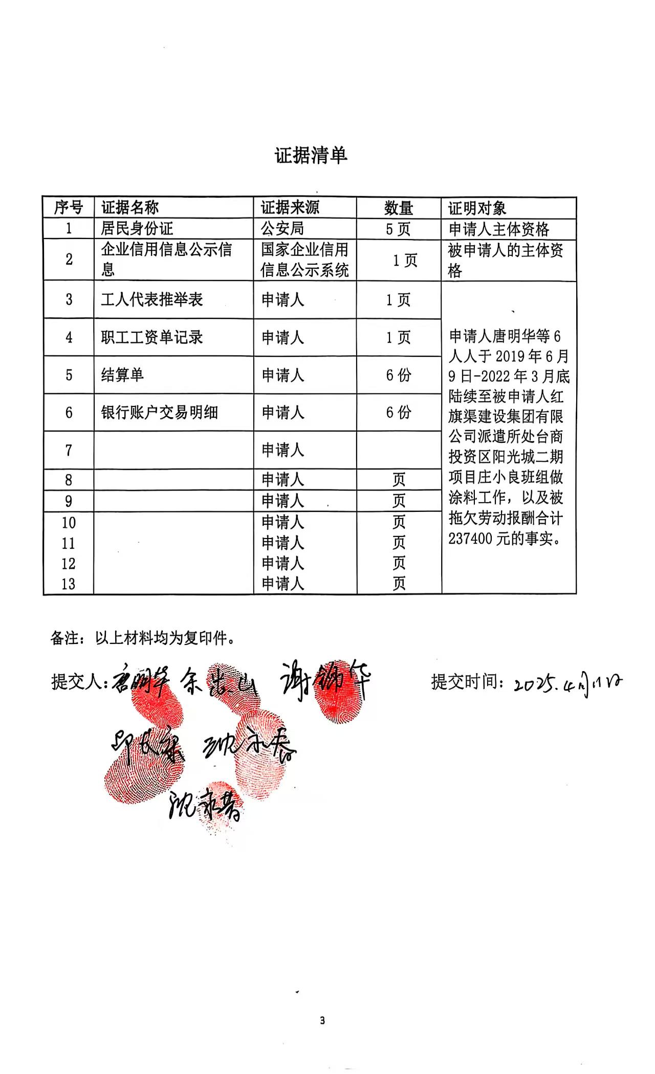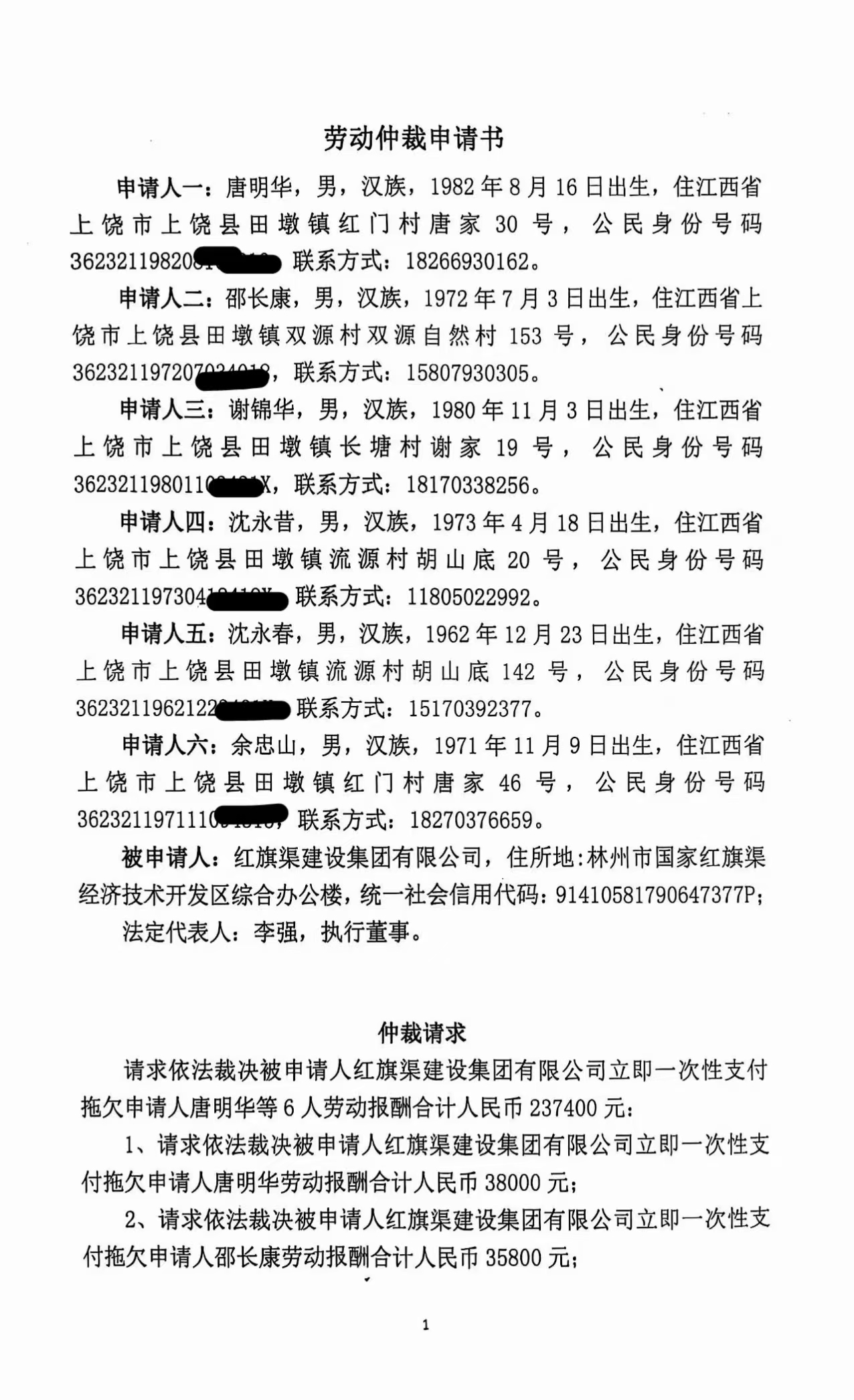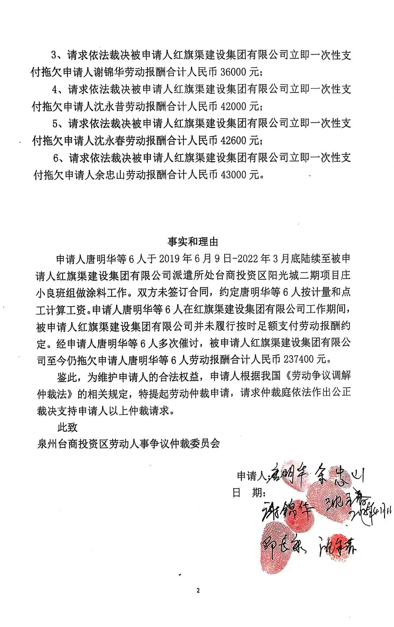关于唐明华等6人诉红旗渠建设集团有限公司(泉台劳人仲案字[2025]157号)仲裁文书的公告