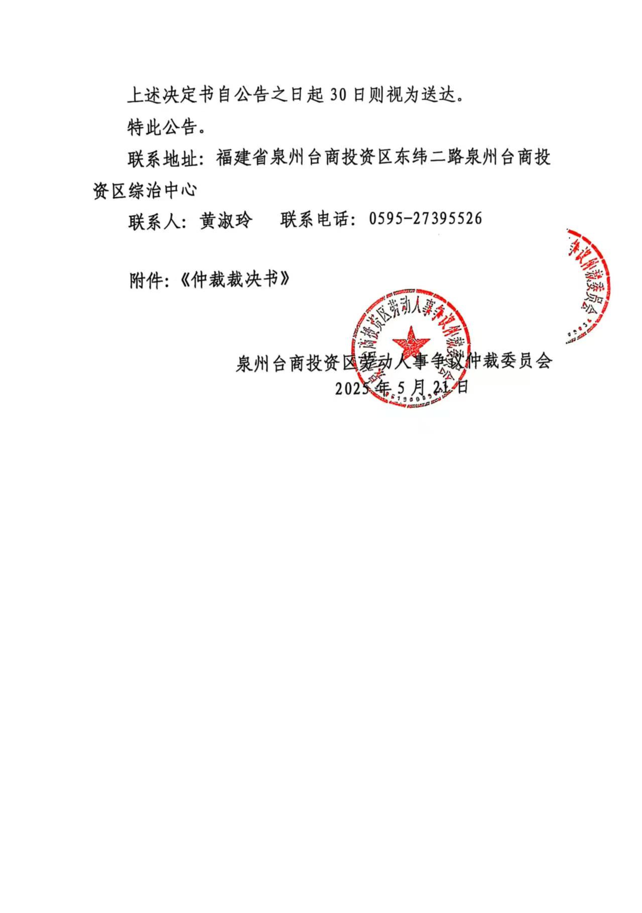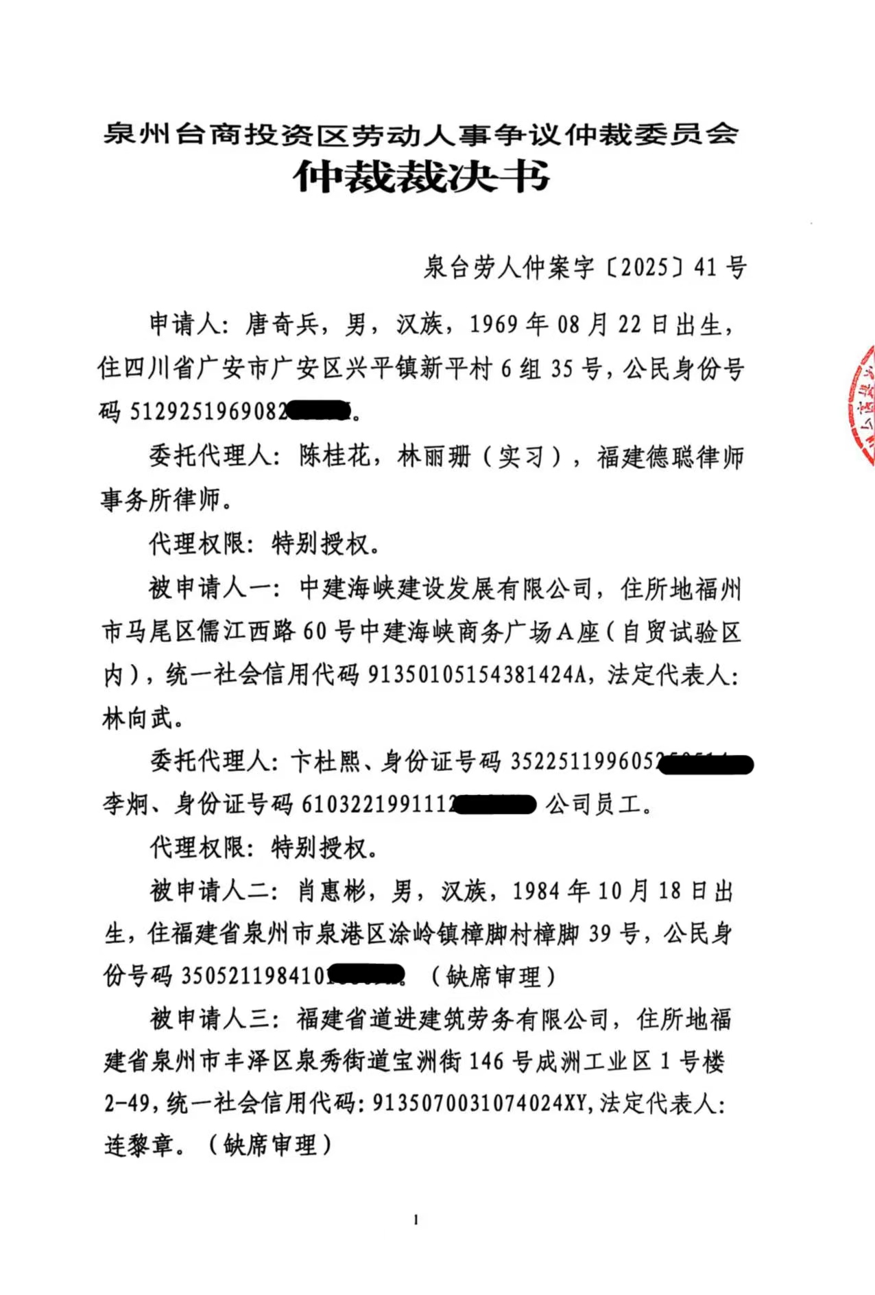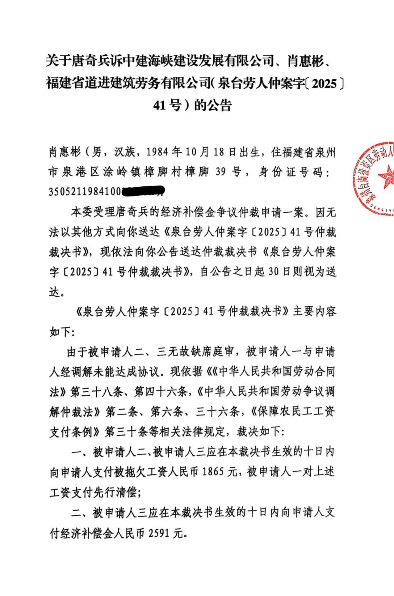 关于唐奇兵诉中建海峡建设发展有限公司、肖惠彬、福建省道进建筑劳务有限公司(泉台劳人仲案字[2025]41号) 仲裁裁决书的公告