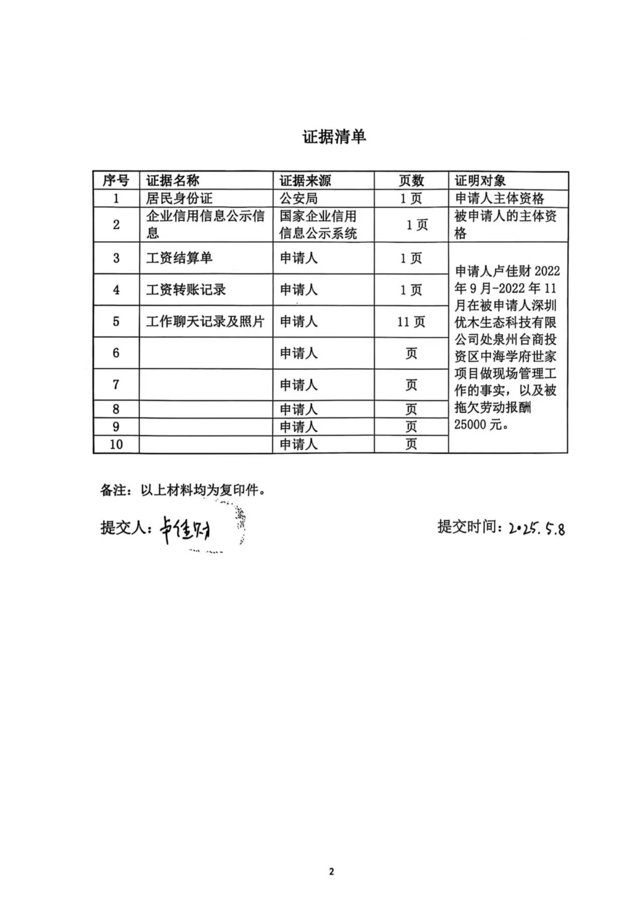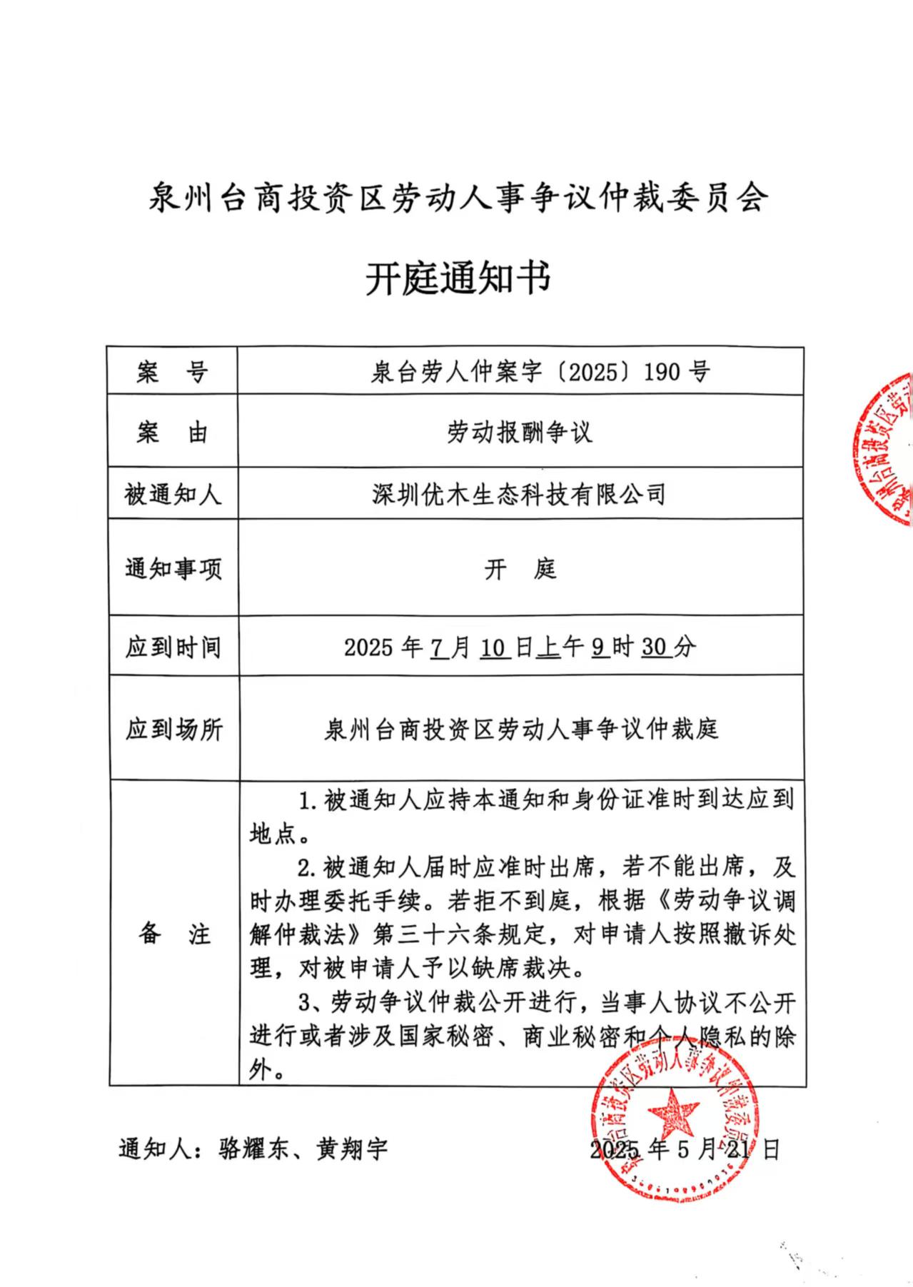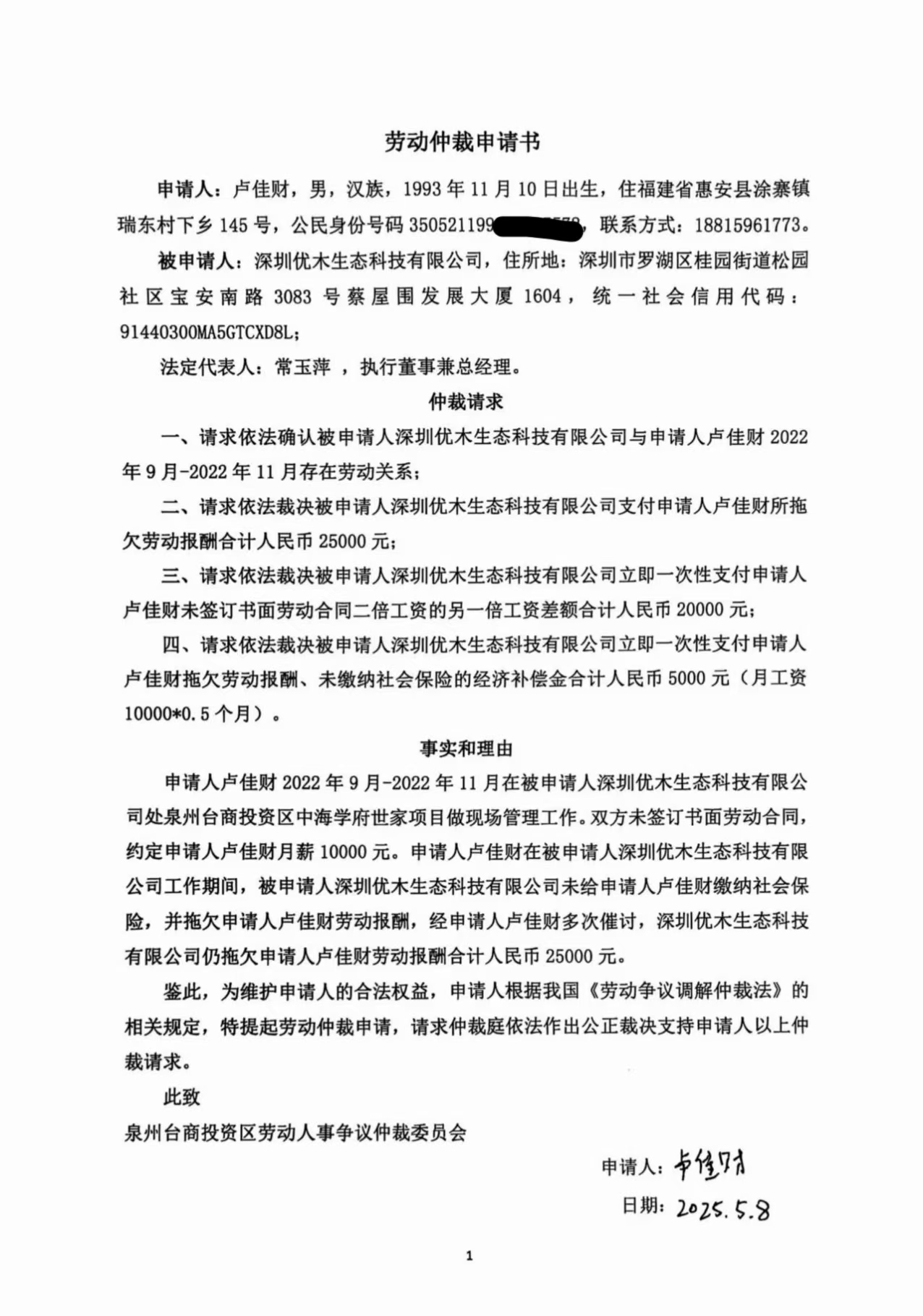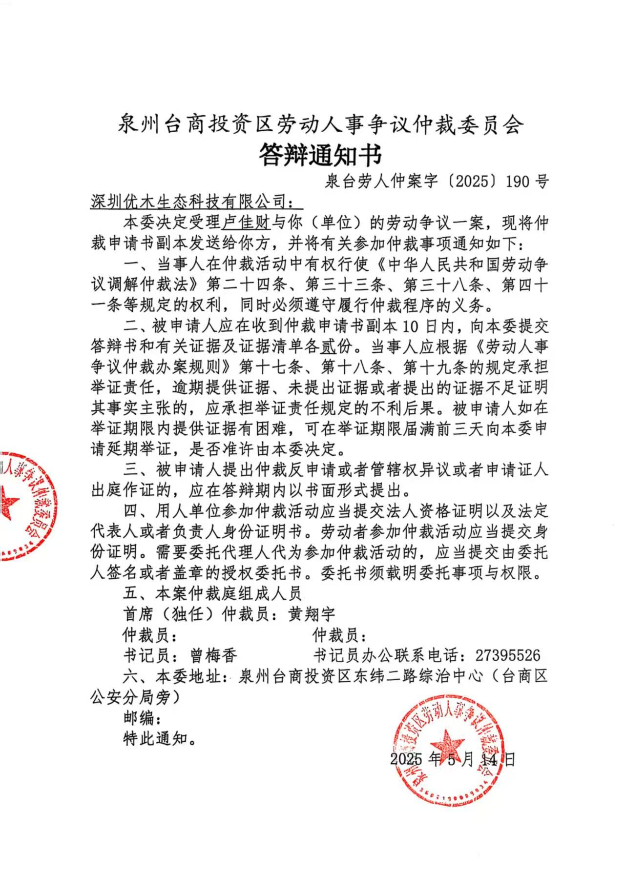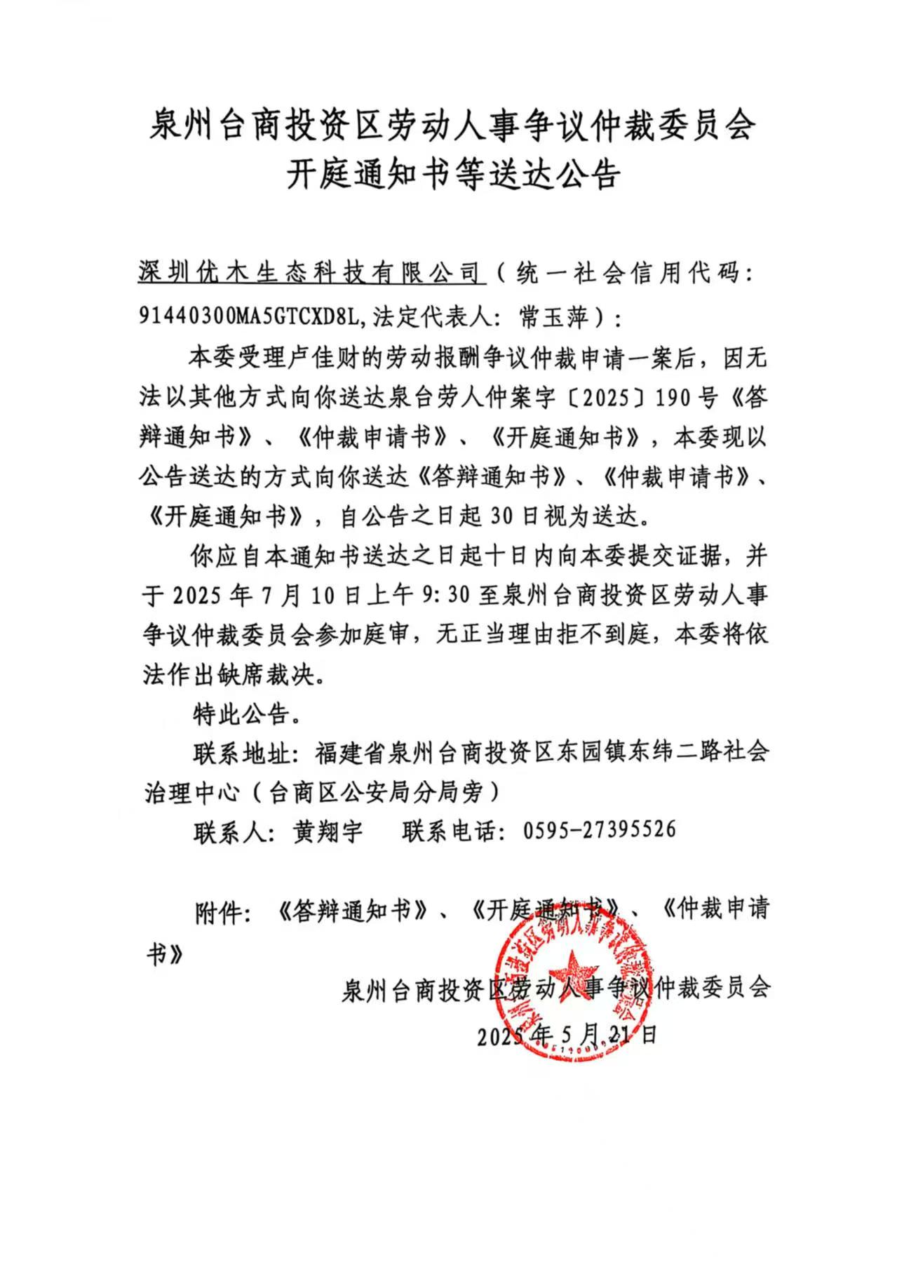 关于卢佳财诉深圳优木生态科技有限公司(泉台劳人仲案字[2025]190号)仲裁文书的公告
