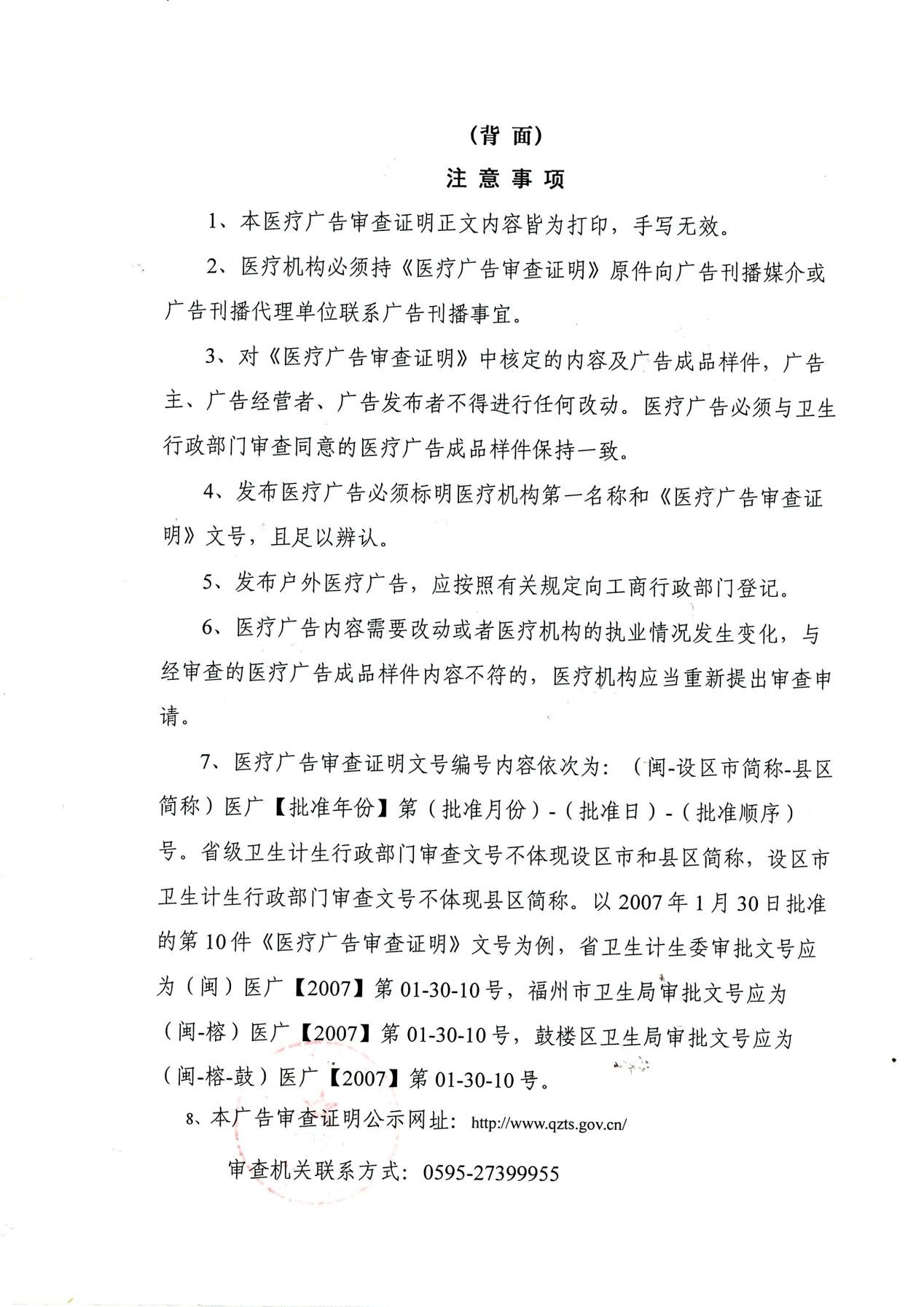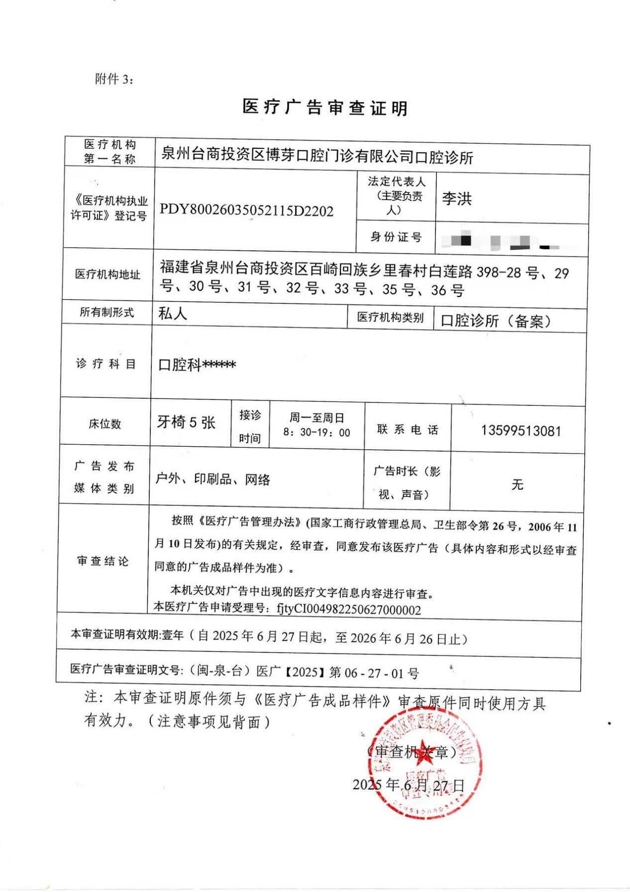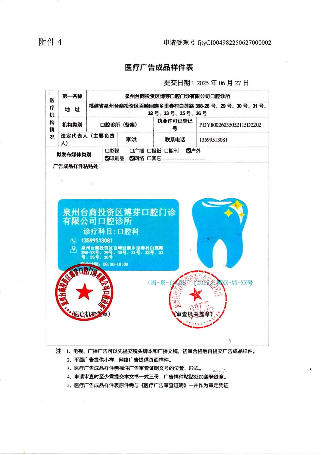 泉州台商投资区博芽口腔门诊有限公司口腔诊所医疗广告审查证明公示