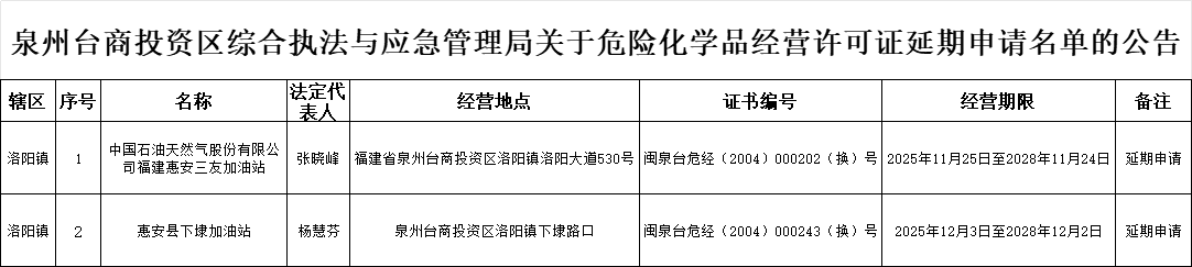 泉州台商投资区综合执法与应急管理局关于危险化学品经营许可证延期申请名单的公告