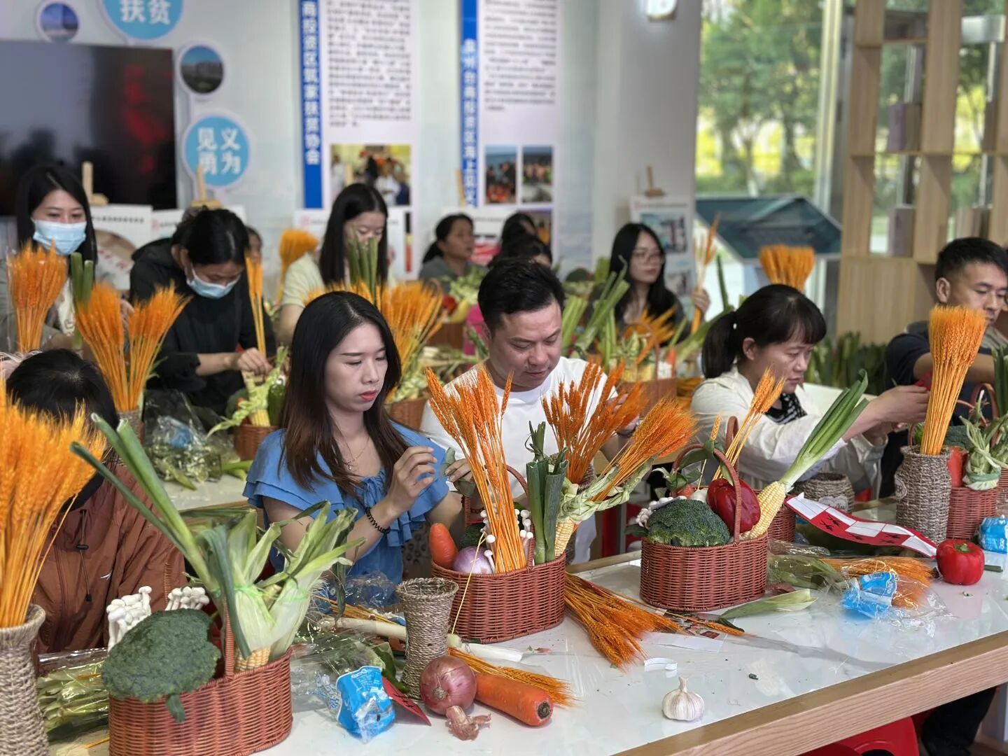 现场设置了蔬菜篮体验区与宣传服务区。蔬菜的清新香气与彩椒的鲜亮色彩交织成一幅温馨画卷,一场别开生面、接地气十足的“创意制作——可食可赏幸福蔬果篮制作活动”热闹非凡。活动现场,翠绿的西蓝花宛如初春的新芽,火红的辣椒似夏日激情的火焰,橙黄的胡萝卜闪耀着丰收的喜悦,紫莹的洋葱则如同夜空中的神秘星辰。加之各式绿叶蔬菜和精致辅材的点缀,细致修剪、巧妙捆绑、匠心包装,这些寻常食材摇身一变,成为替代传统鲜花的创意之选。大家纷纷感慨:“没想到,平时用来做饭的蔬菜瓜果竟然能变成这么漂亮的花篮!以前过节总是想着买礼物或者鲜花,虽然好看但不实用。这个蔬菜花果篮真是太有创意了,既好看又能吃,这才是过日子应有的浪漫情怀!”活动结束后的厨余垃圾,在垃圾分类志愿者们的引导下,大家分门别类放置回收,进一步变废为宝。