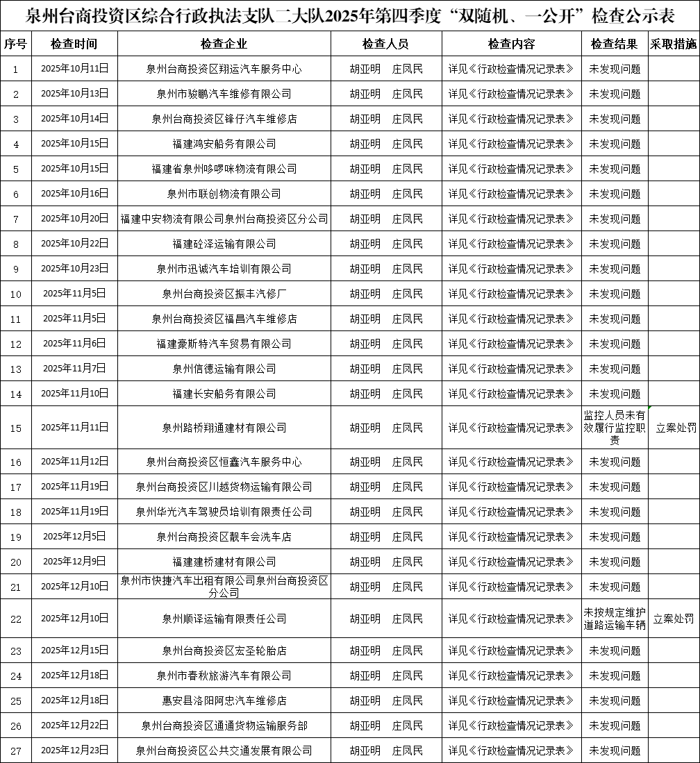 【双随机、一公开】泉州台商投资区综合行政执法支队二大队2025年第四季度“双随机、一公开”检查公示表