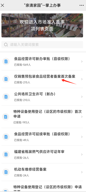 ②选择法人事项,选择市场准入类(若无法人账号需先注册),选择仅销售预包装食品经营者备案首次备案。