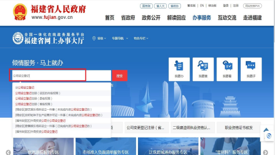 1、登录“福建省网上办事大厅”,搜索栏输入“公司设立登记”,点击搜索,如下图所示: