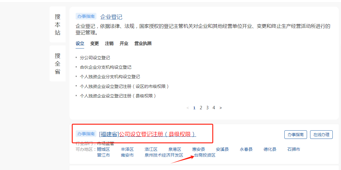 3、进入搜索结果页面后,查找到“公司设立登记注册(县级权限)”,可办地区选择“台商投资区”