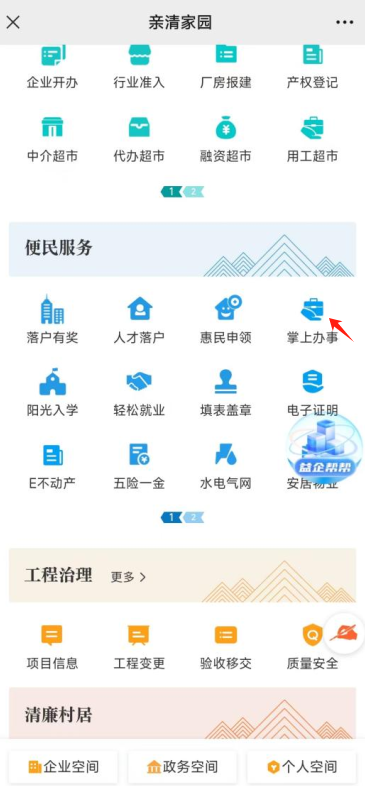 ①在公众号“亲清家园”首页点击便民服务(掌上办事)。