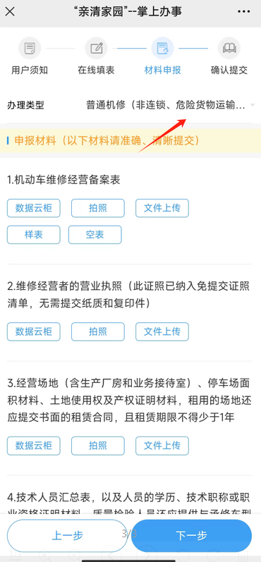 ③根据自己主体资格及经营情况,材料申报页面右上角选择办理类型,按要求填写相关信息上传相应材料。