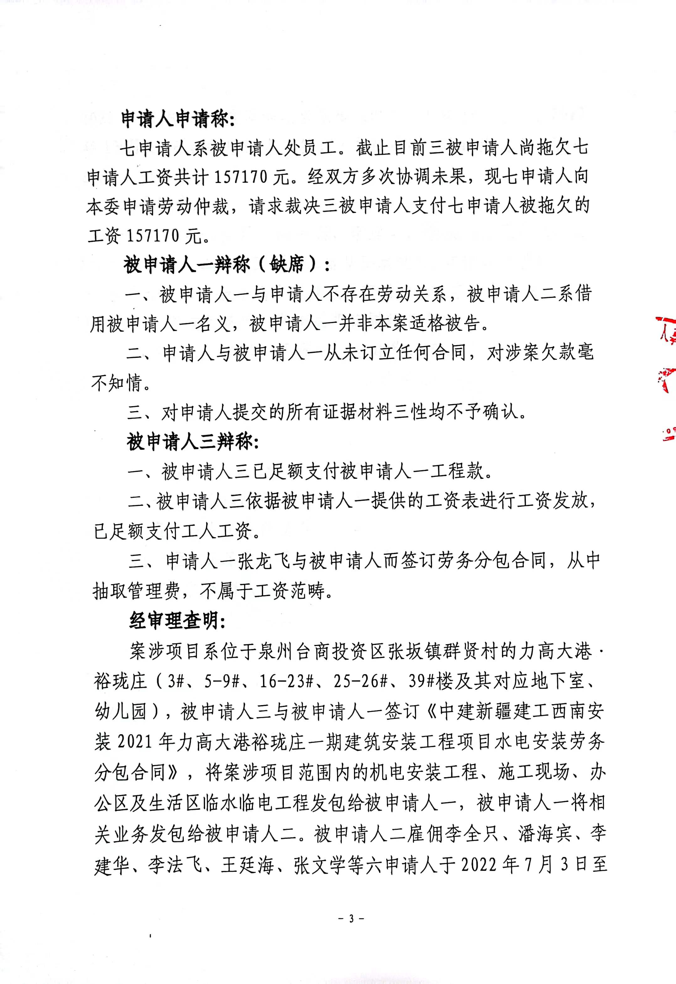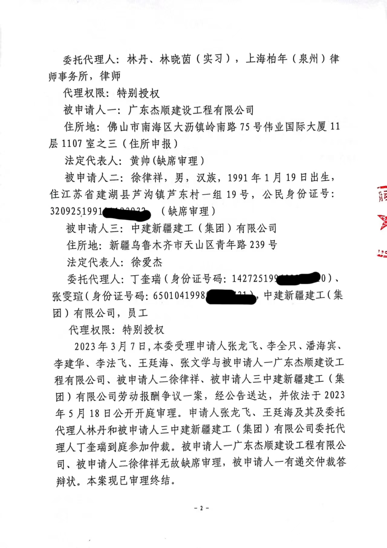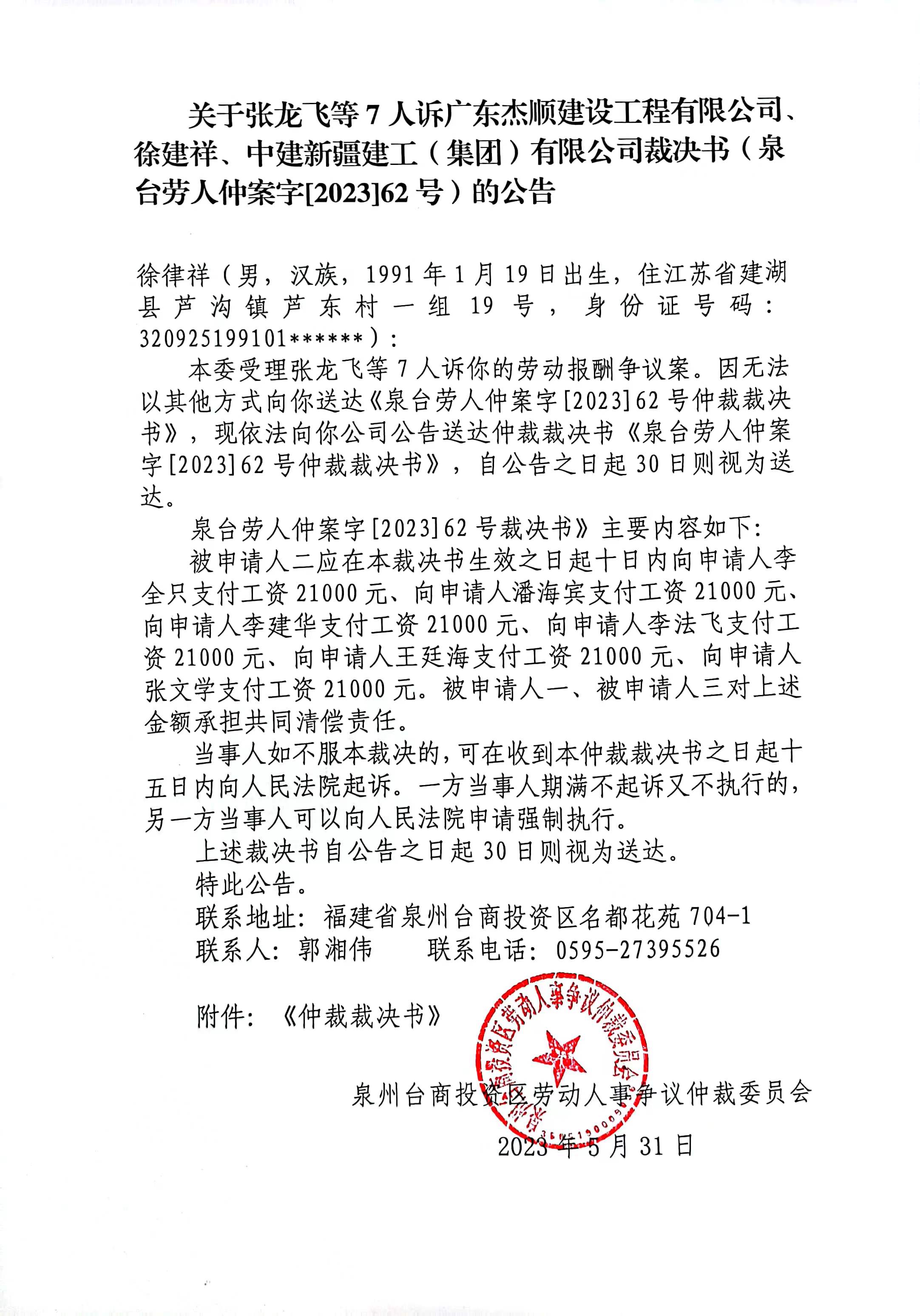 关于张龙飞等7人诉徐建祥、广东杰顺建设工程有限公司、中建新疆建工(集团)有限公司仲裁文书(泉台劳人仲案字[2023]62号)的公告