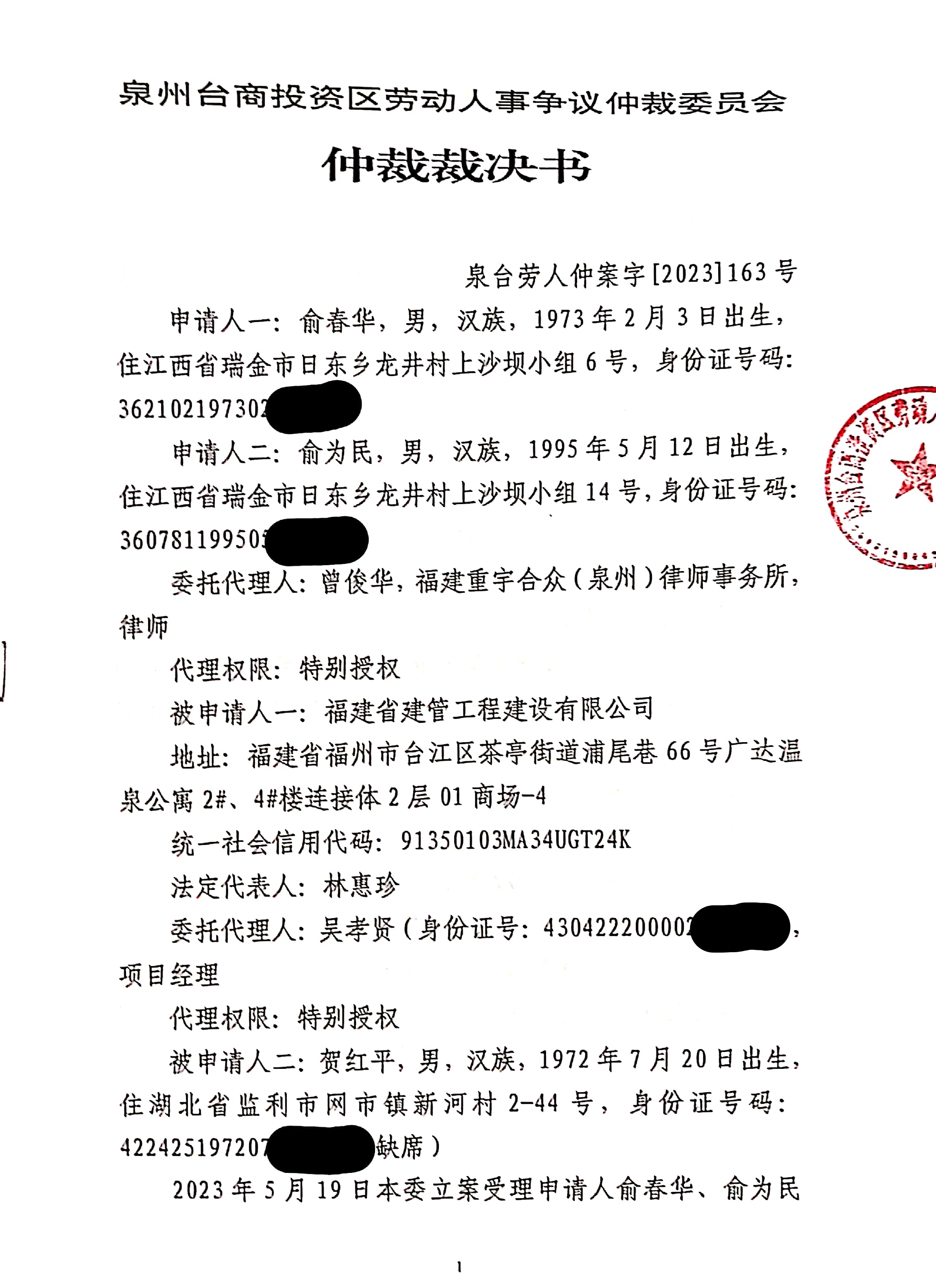 关于俞春华等2人诉福建省建管工程建设有限公司、贺红平的裁决书(泉台劳人仲案字[2023]163号)的公告