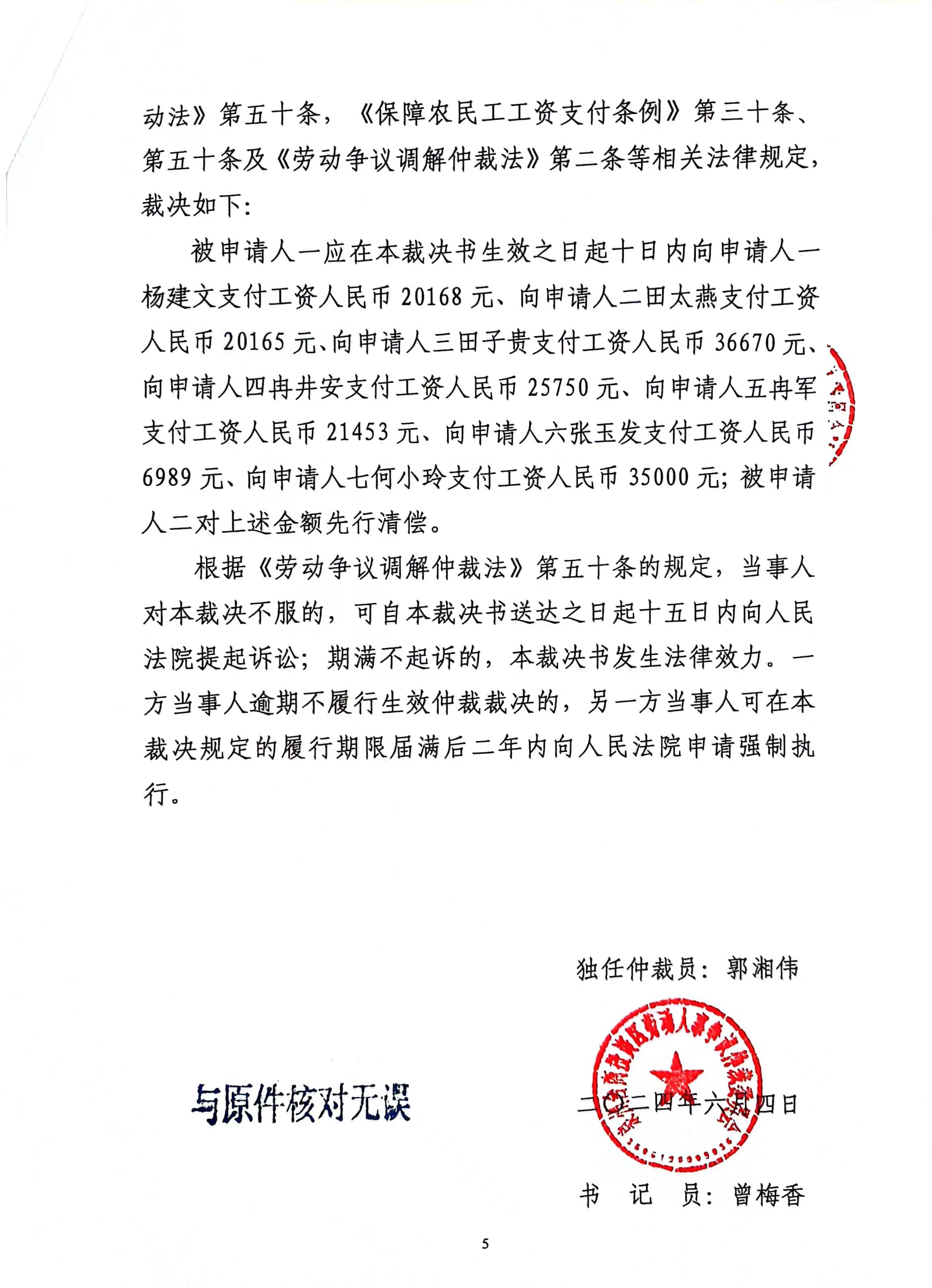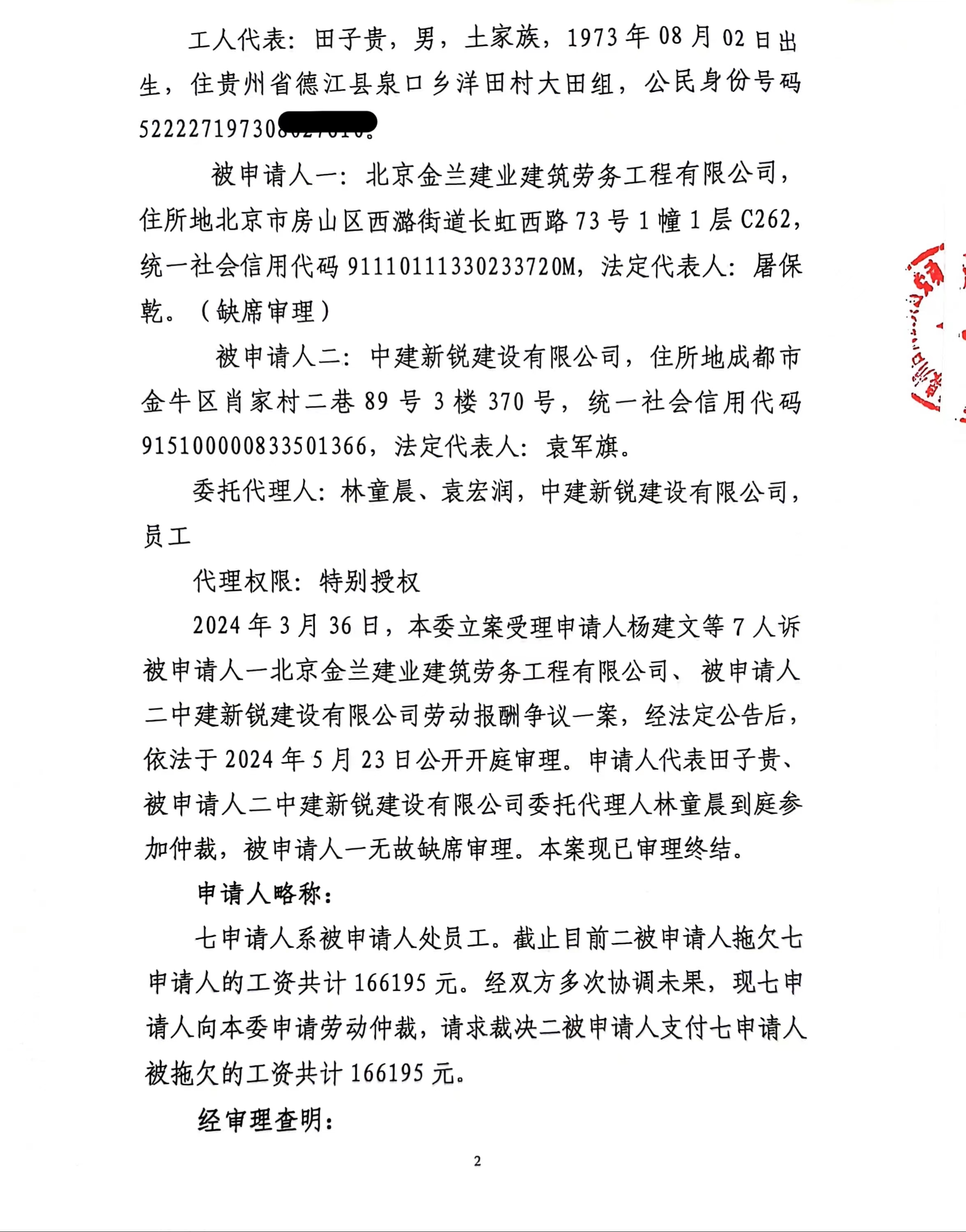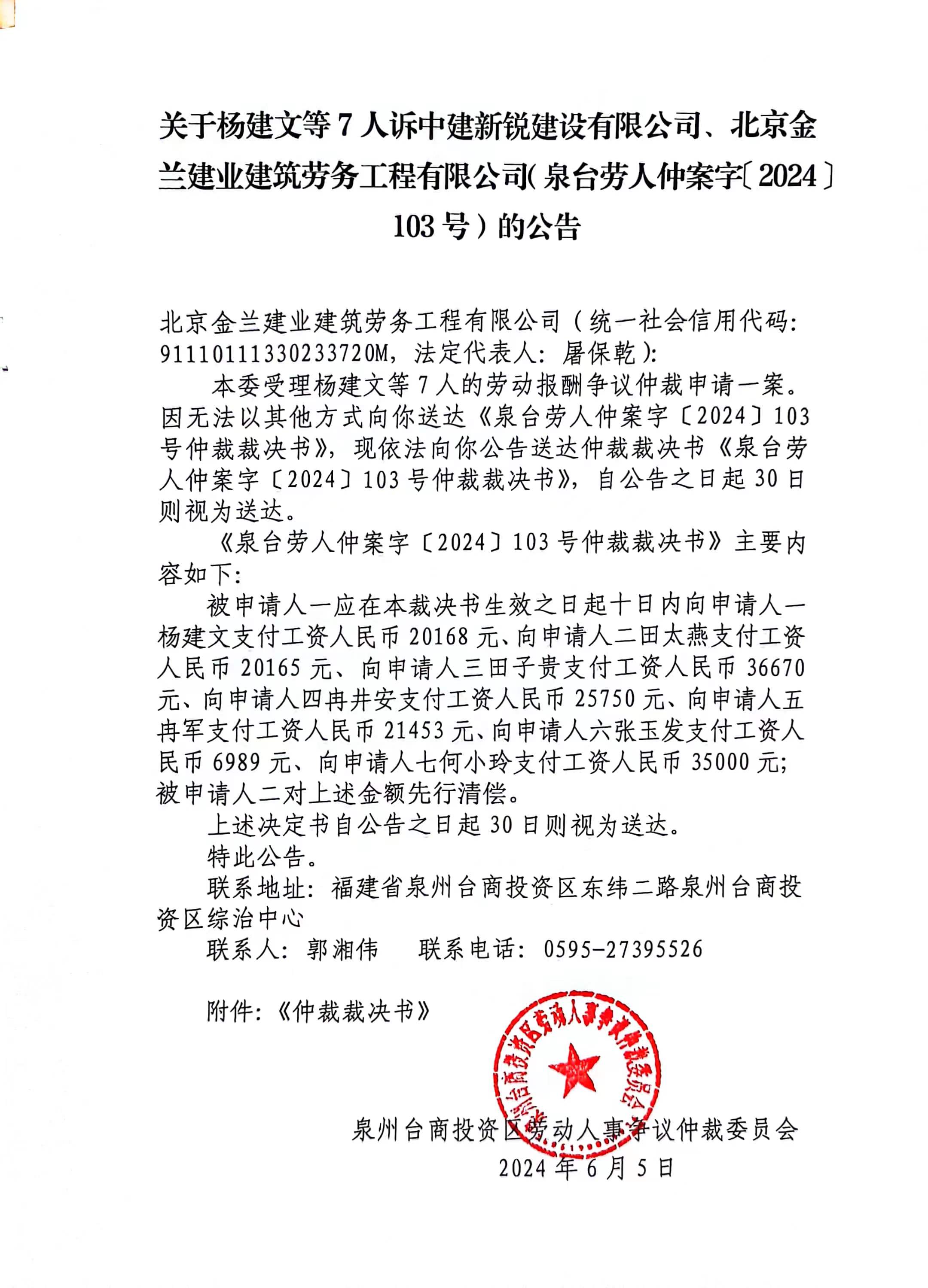 关于杨建文等7人诉中建新锐建设有限公司、北京金兰建业建筑劳务工程有限公司(泉台劳人仲案字[2024]103号)的公告