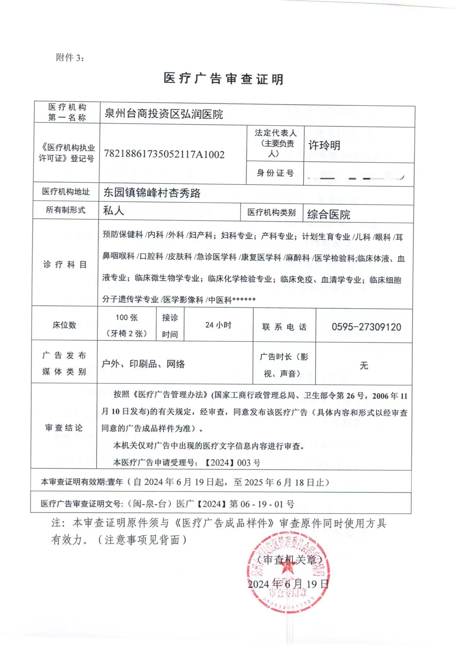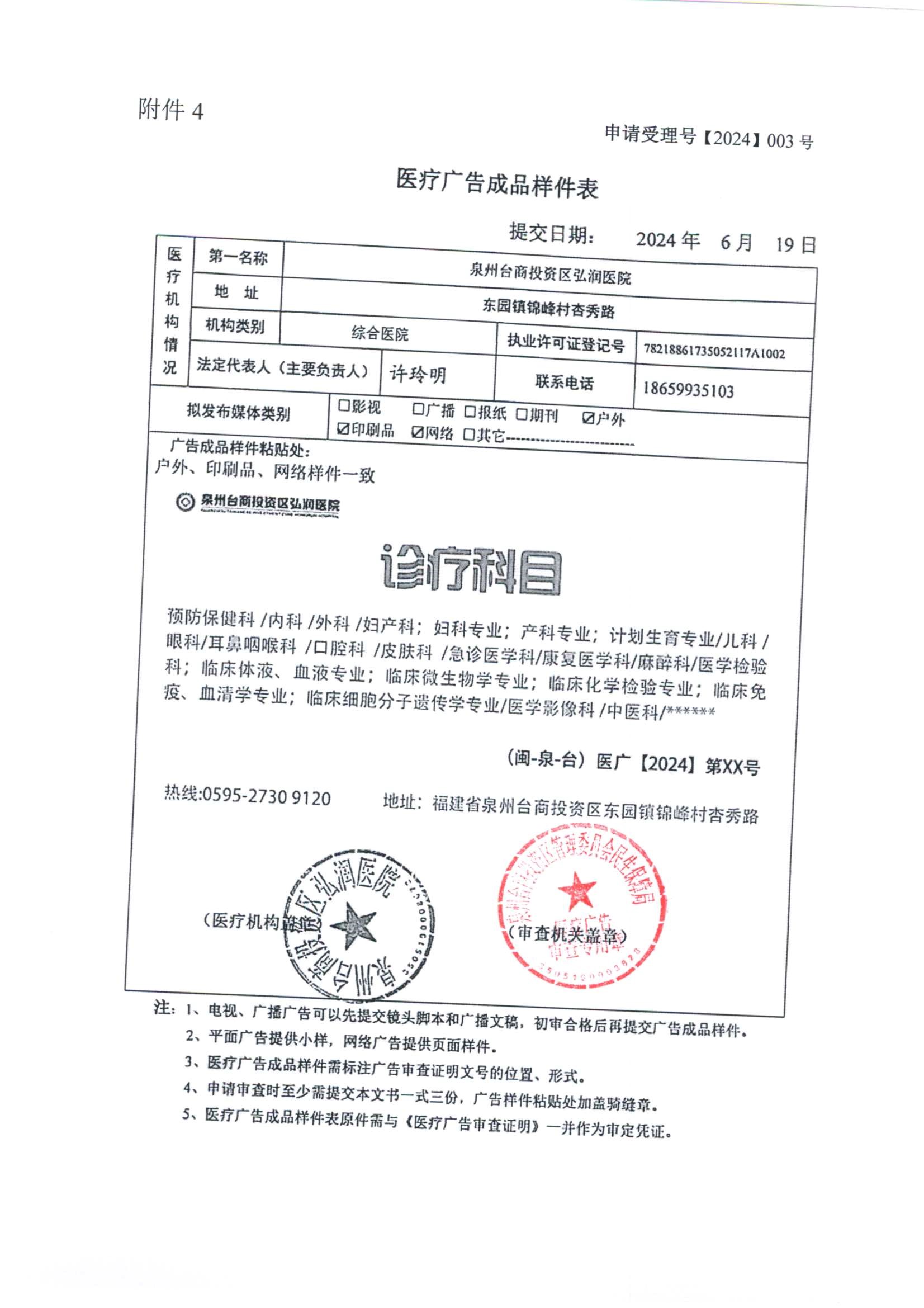 泉州台商投资区弘润医院医疗广告审查证明公示