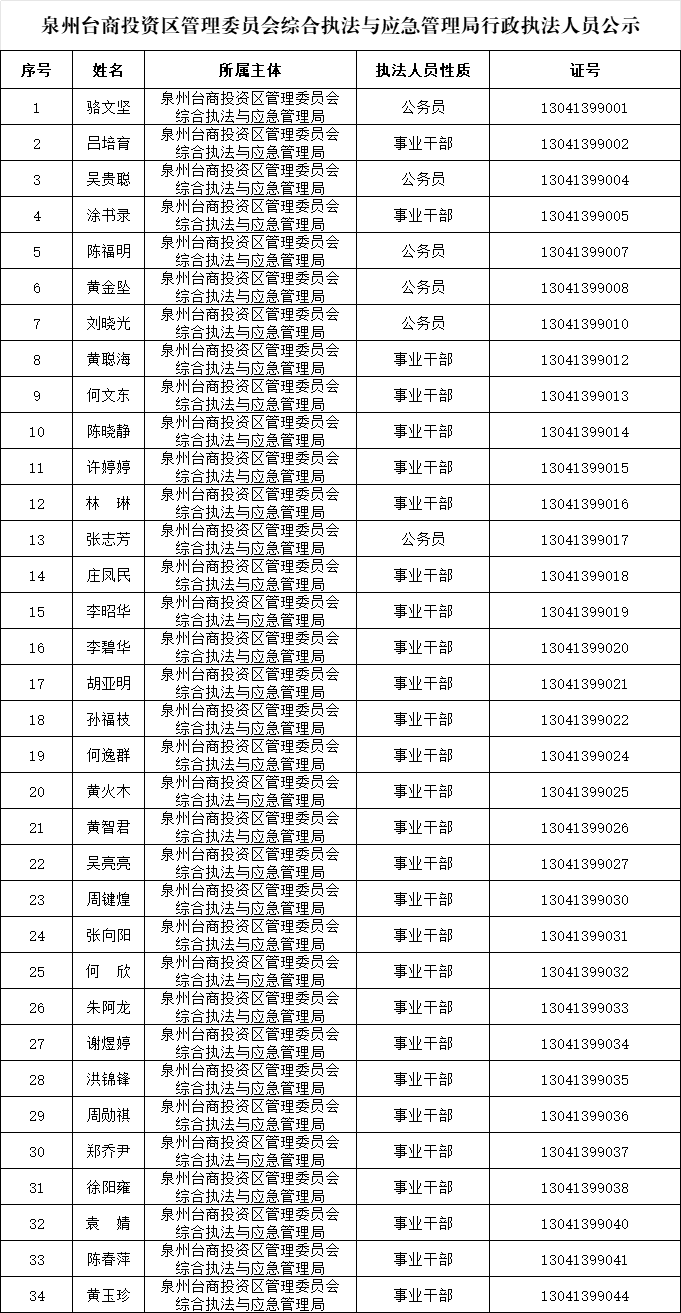 泉州台商投资区管理委员会综合执法与应急管理局行政执法人员公示