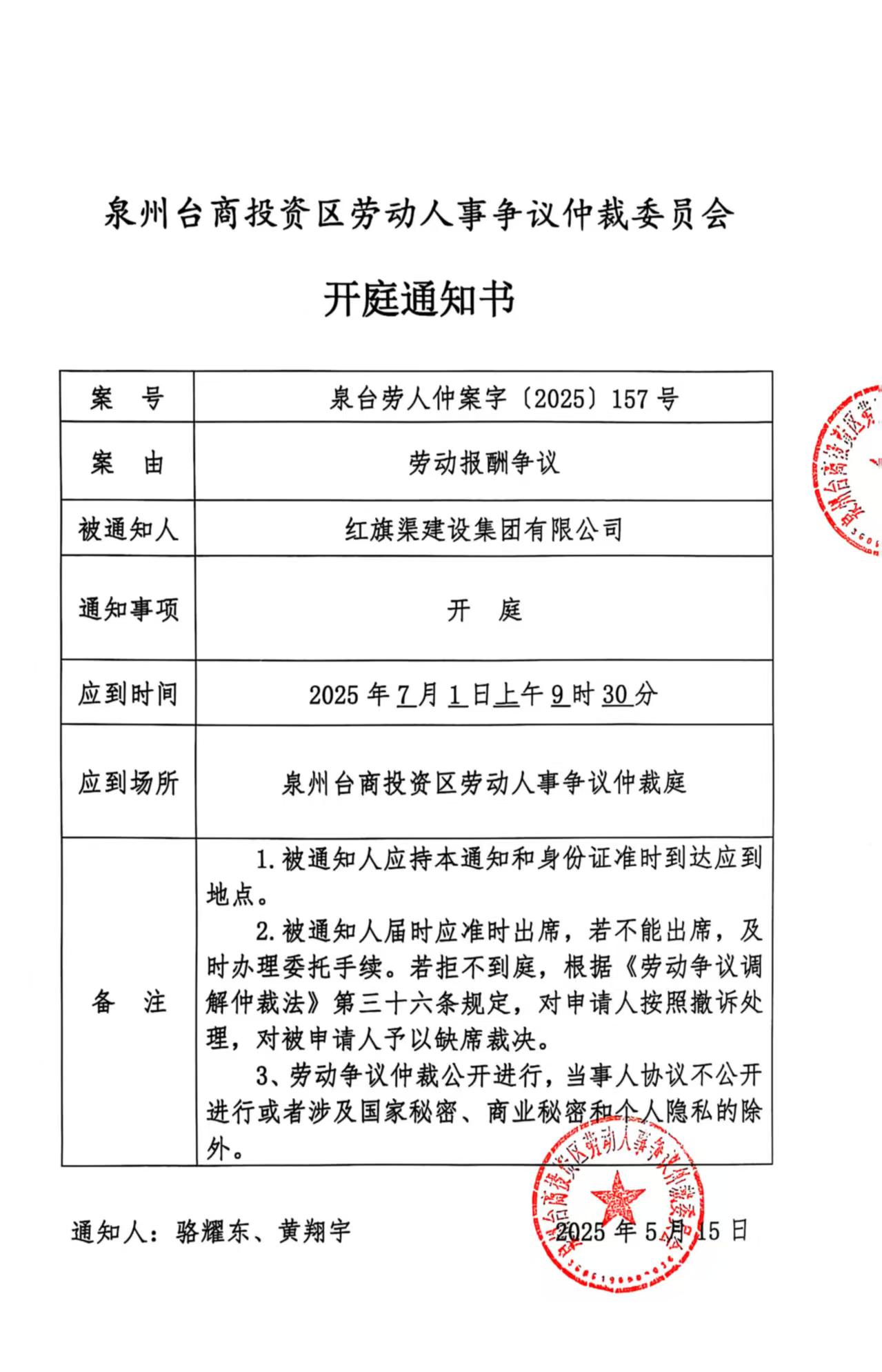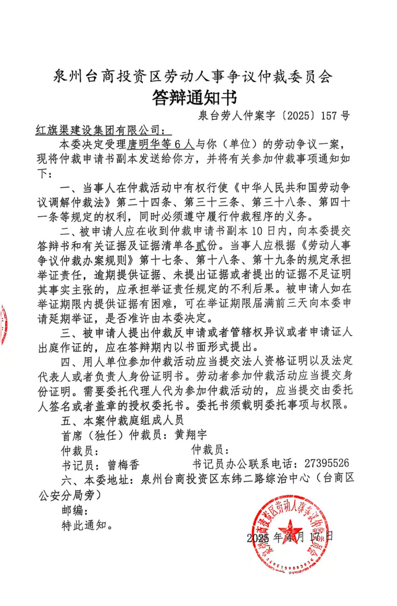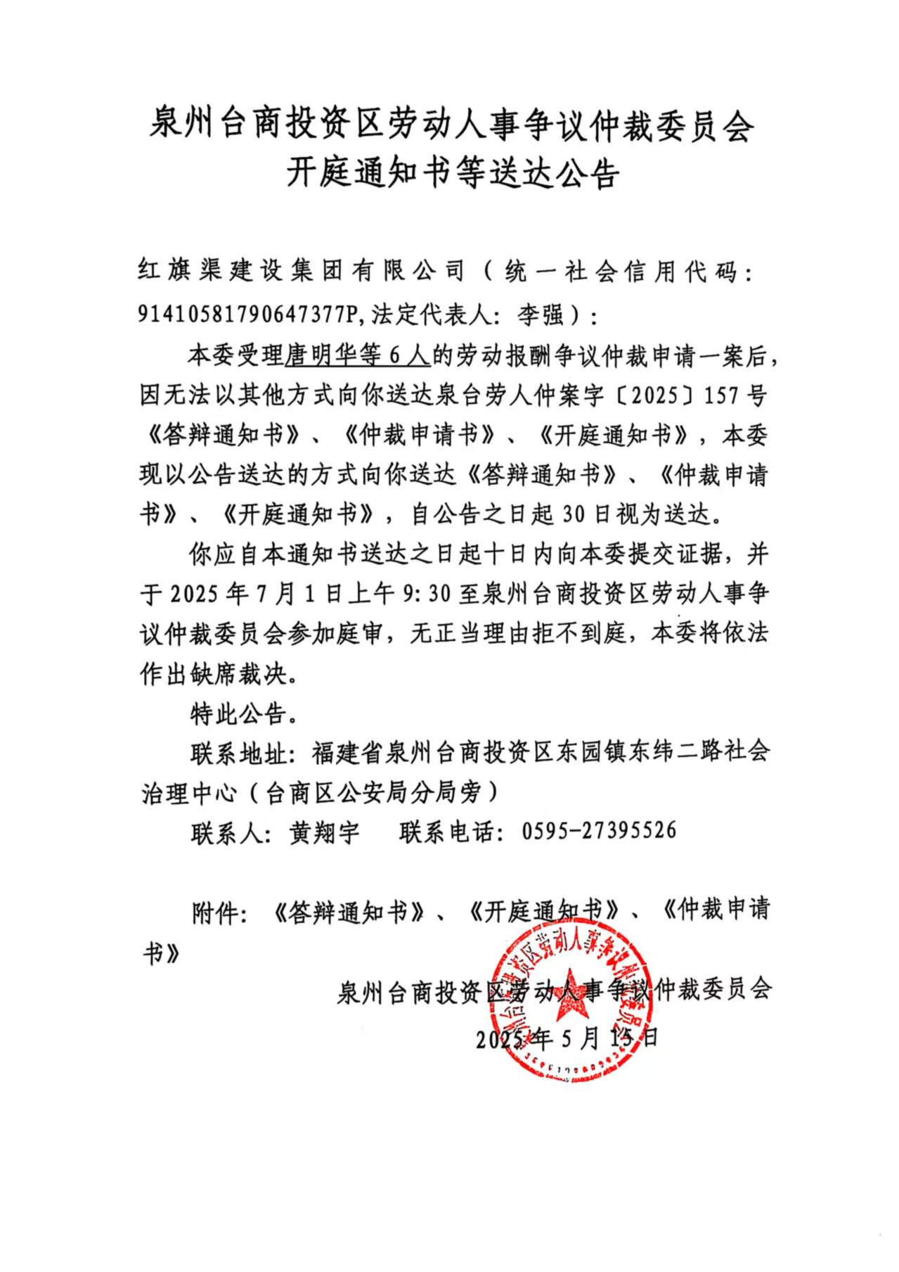 关于唐明华等6人诉红旗渠建设集团有限公司(泉台劳人仲案字[2025]157号)仲裁文书的公告