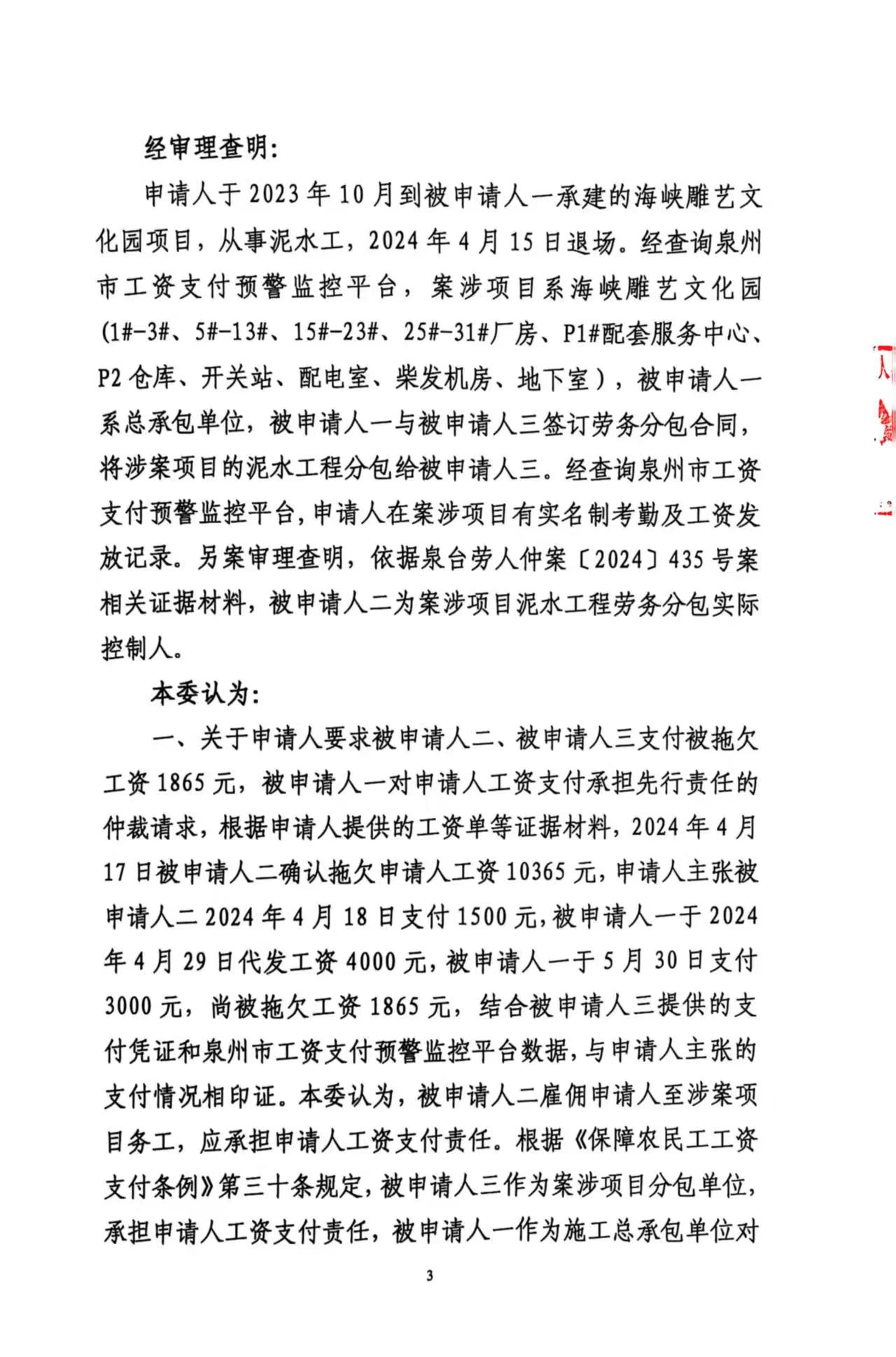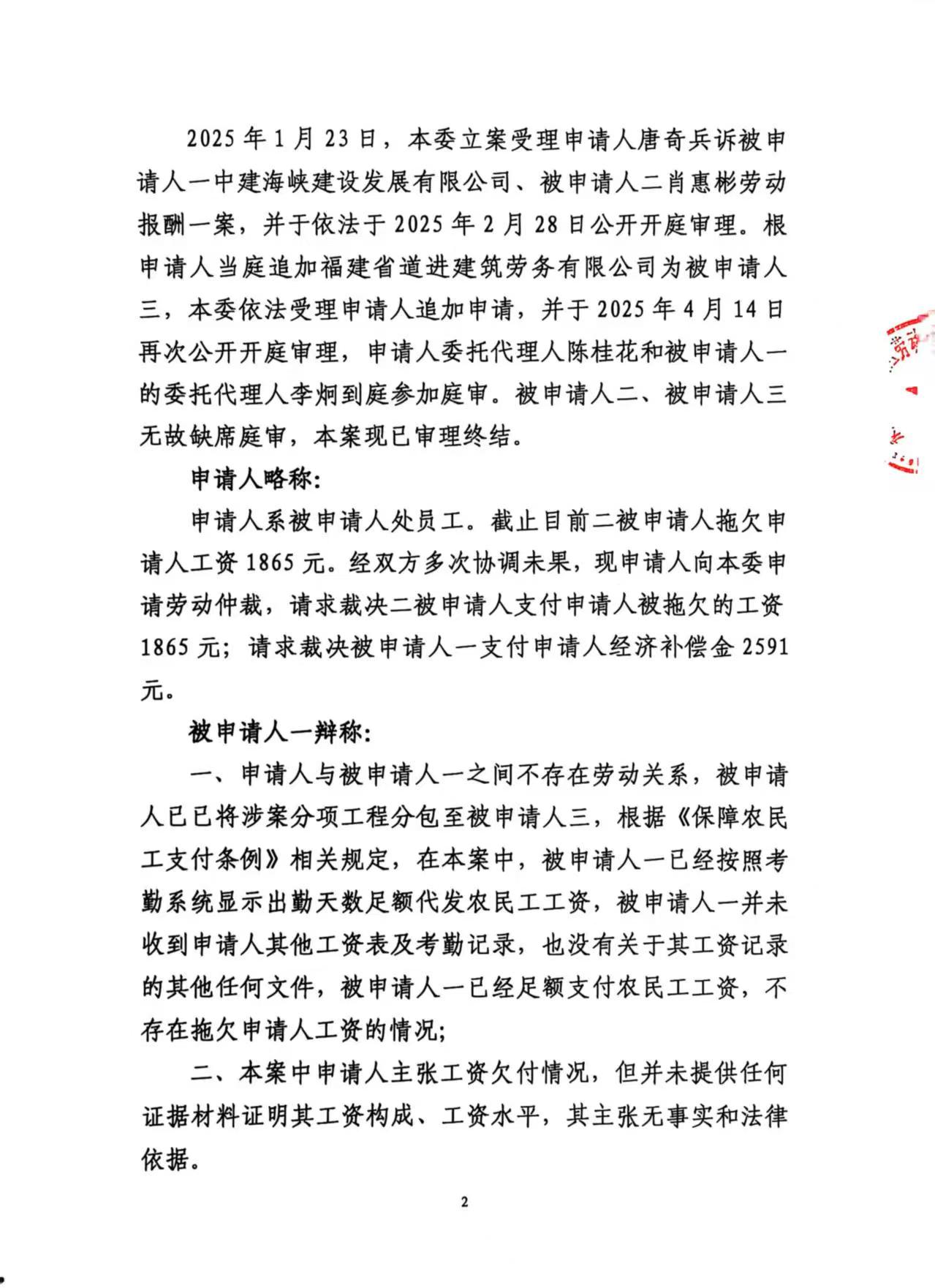 关于唐奇兵诉中建海峡建设发展有限公司、肖惠彬、福建省道进建筑劳务有限公司(泉台劳人仲案字[2025]41号) 仲裁裁决书的公告