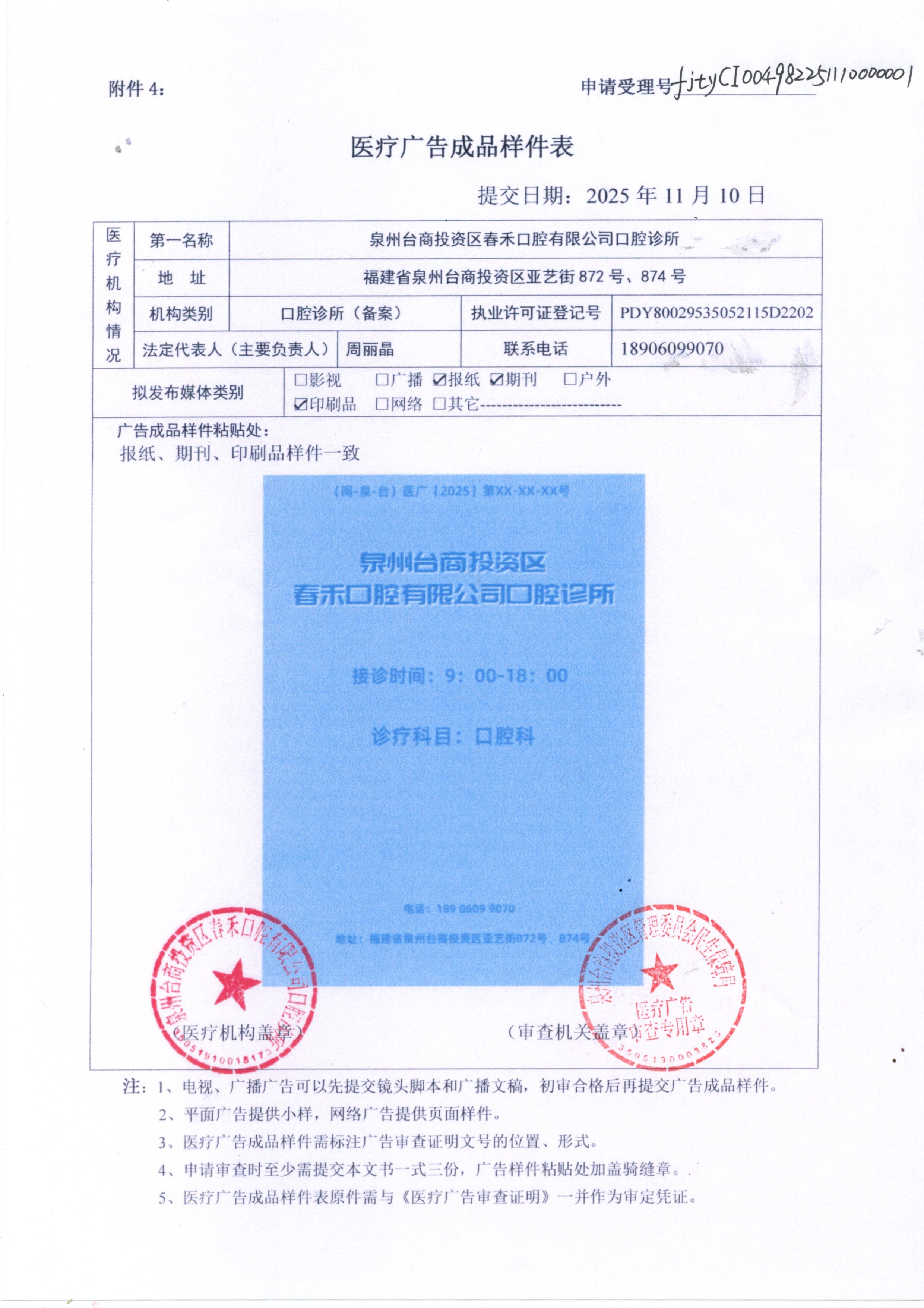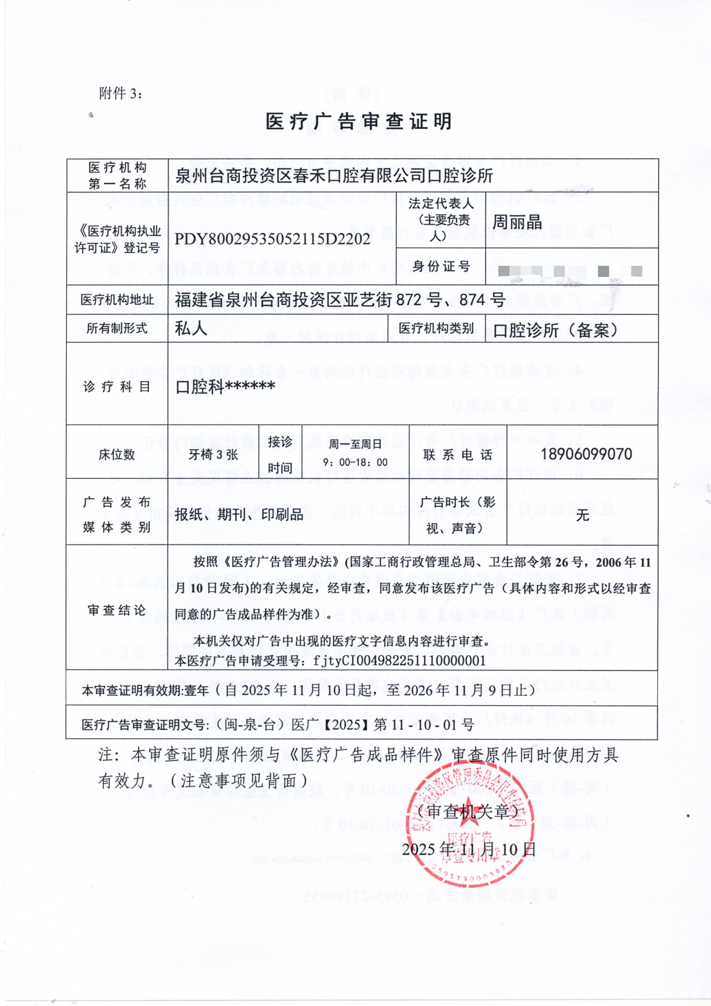 泉州台商投资区春禾口腔有限公司口腔诊所医疗广告审查证明公示