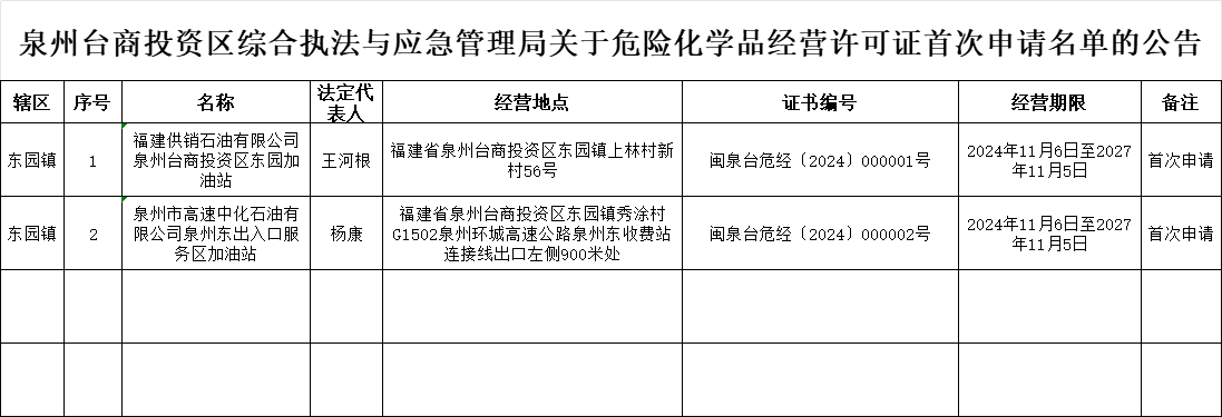 【安全生产】泉州台商投资区综合执法与应急管理局关于危险化学品经营许可证首次申请名单的公告