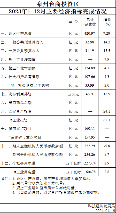 泉州台商投资区2023年1-12月主要经济指标完成情况