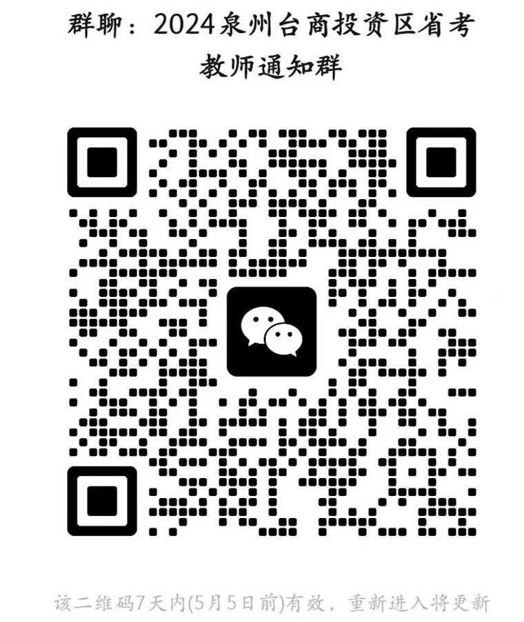 5.请入围考生扫描加入2024年泉州台商投资区省考教师通知群,群内昵称以“招聘岗位+姓名(名次)”命名,如“小学语文张三6”,本通知未尽事宜由泉州台商投资区教师招聘工作领导小组负责解释。咨询电话:0595-27398853。监督电话:0595-27398851。