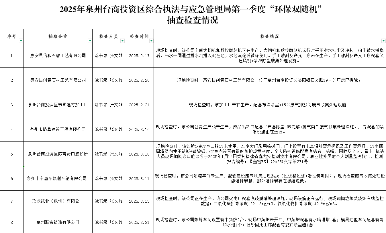 【双随机、一公开】2025年泉州台商投资区综合执法与应急管理局第一季度“环保双随机”抽查检查情况