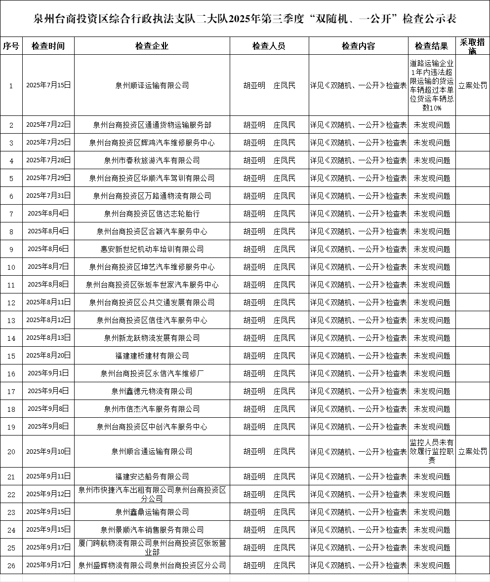 【双随机、一公开】泉州台商投资区综合行政执法支队二大队2025年第三季度“双随机、一公开”检查公示表