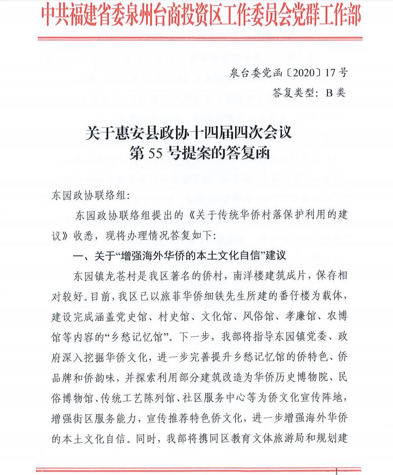 关于惠安县政协第十四届四次会议第55号提案的答复函