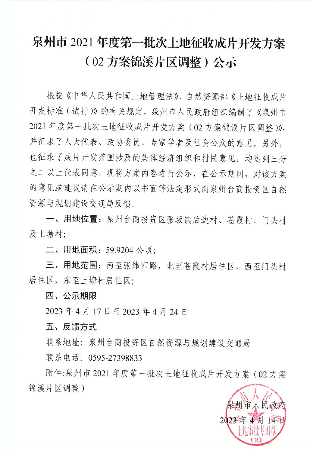 泉州市2021年度第一批次土地征收成片开发方案(02方案锦溪片区调整)公示