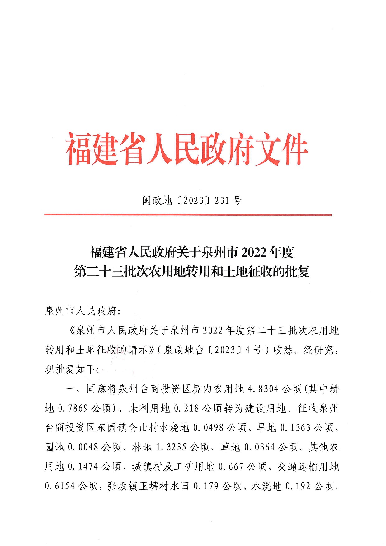 泉州市2022年度第二十三批次建设用地批复