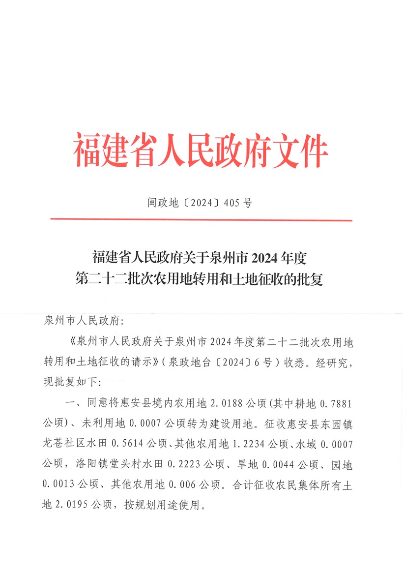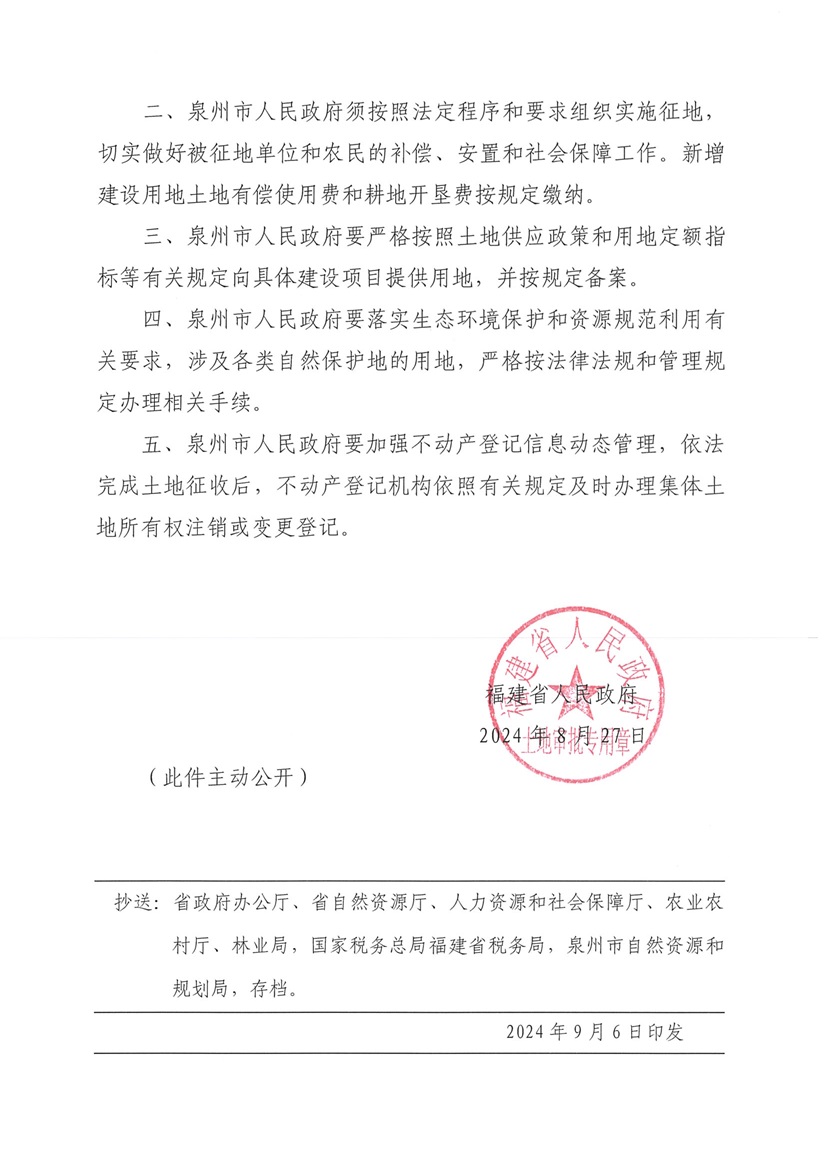 泉州市2024年第二十二批次农用地转用和土地征收的批复