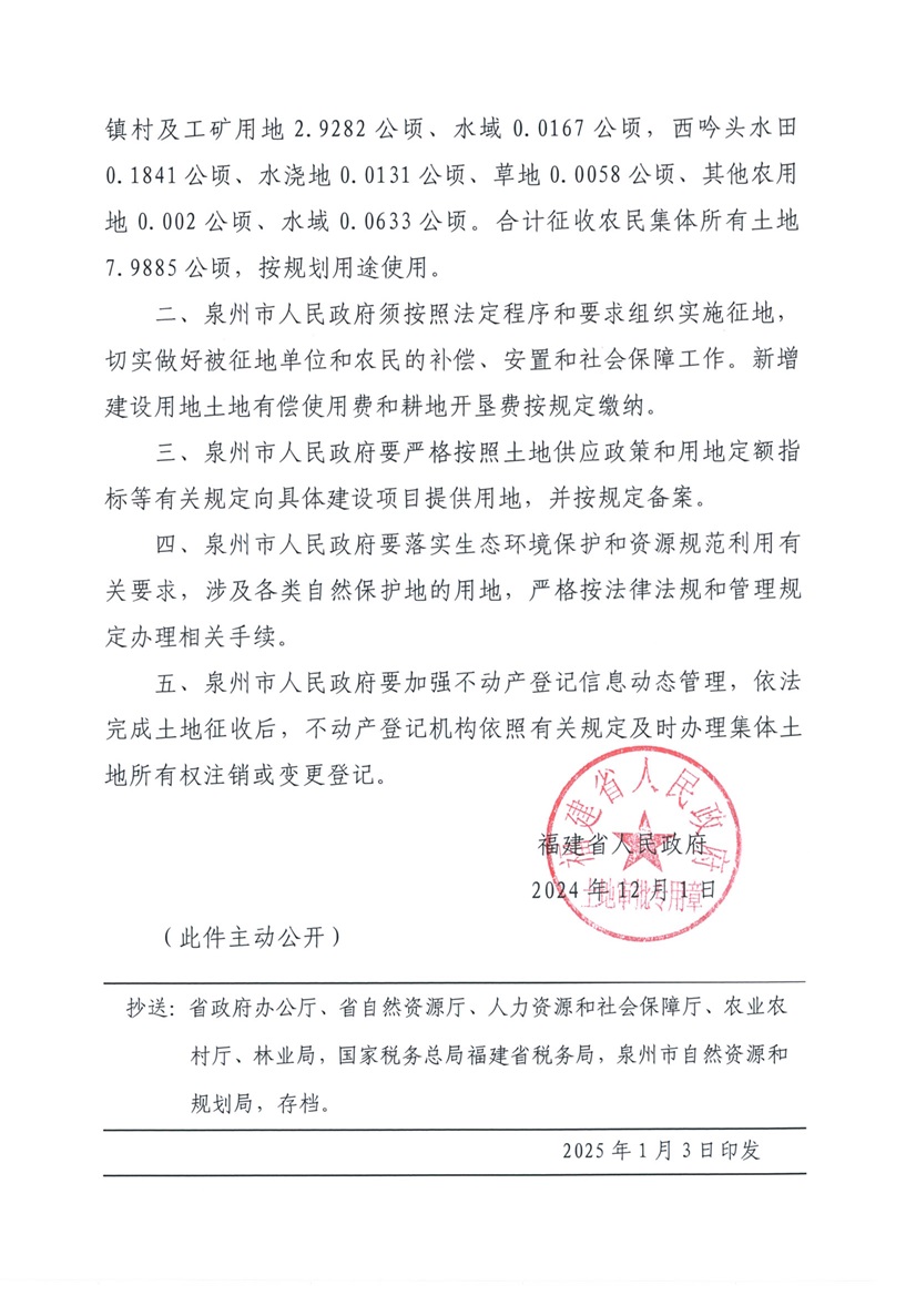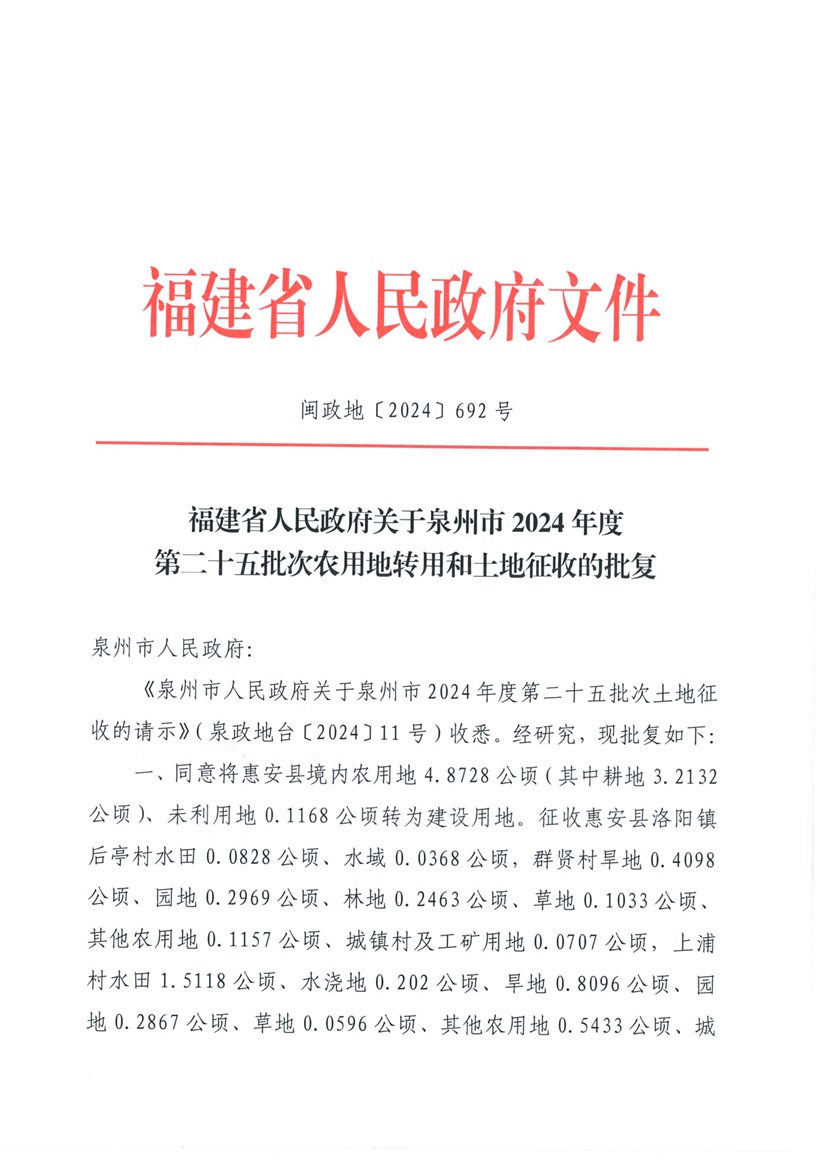 泉州市2024年第二十五批次农用地转用和土地征收的批复