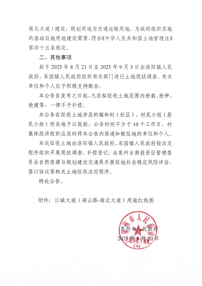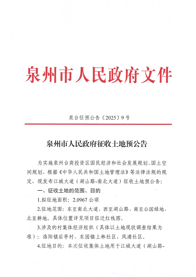 泉州市人民政府征收土地预公告(江城大道(湖山路—南北大道))