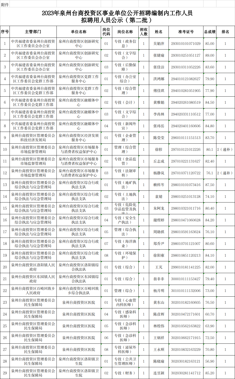 根据事业单位公开招聘工作人员有关规定以及《2023年泉州市事业单位公开招聘编制内工作人员公告》规定的条件和程序,在公开报名、考试、体检及考核合格的基础上,拟聘用吴娟萍等29名同志为泉州台商投资区事业单位工作人员,现予公示(名单附后)。