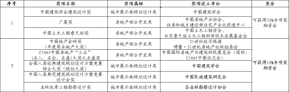 (三)项目获奖情况(额外奖励)。考评节点为房地产项目交付满24个月。项目建筑设计方面获得国家、部级、省级公有性质的行业评审单位表彰情况。