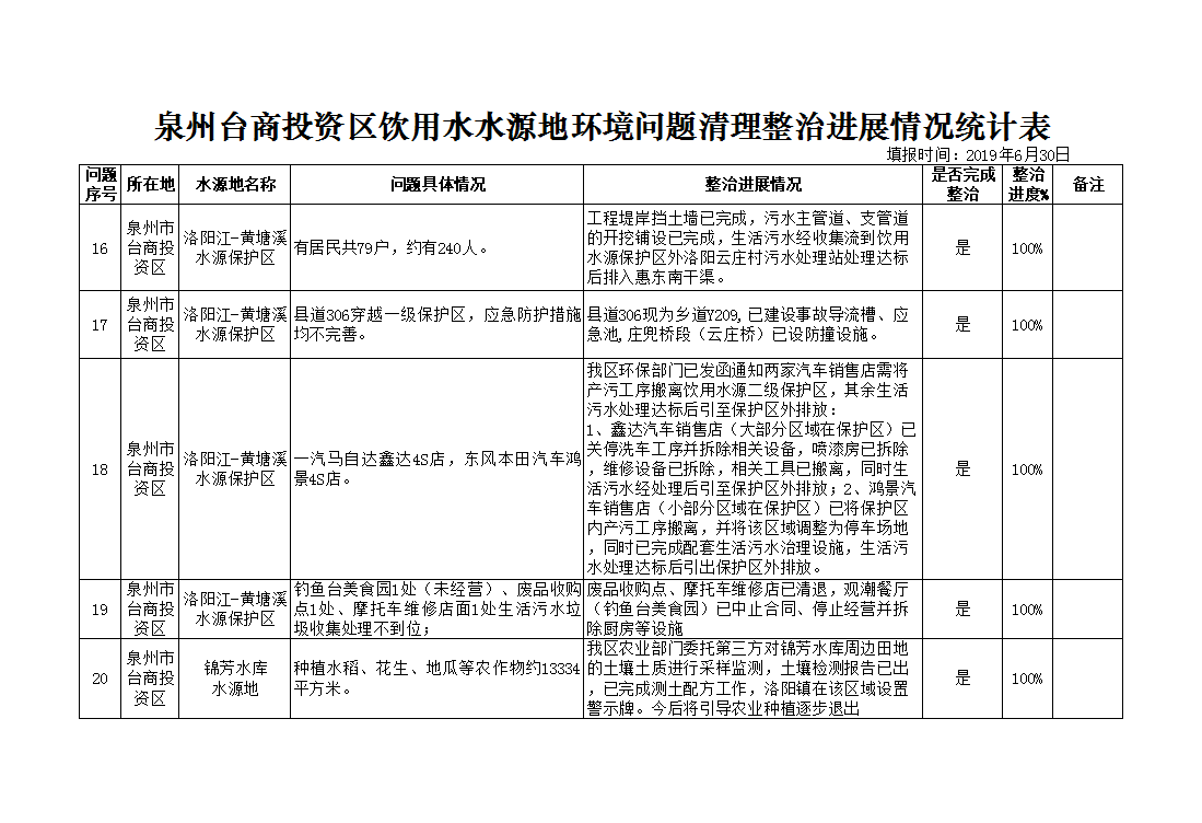泉州台商投资区水源地整治进度汇总表-2019年6月