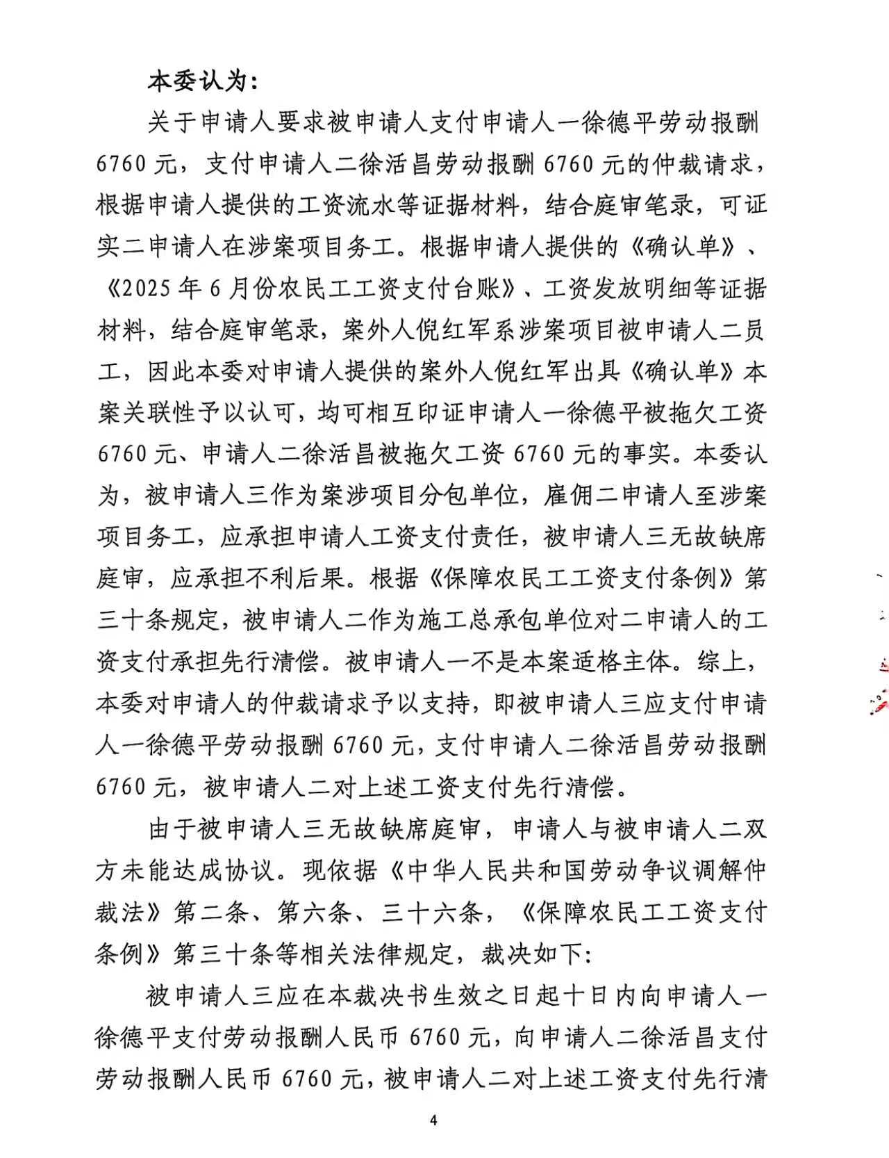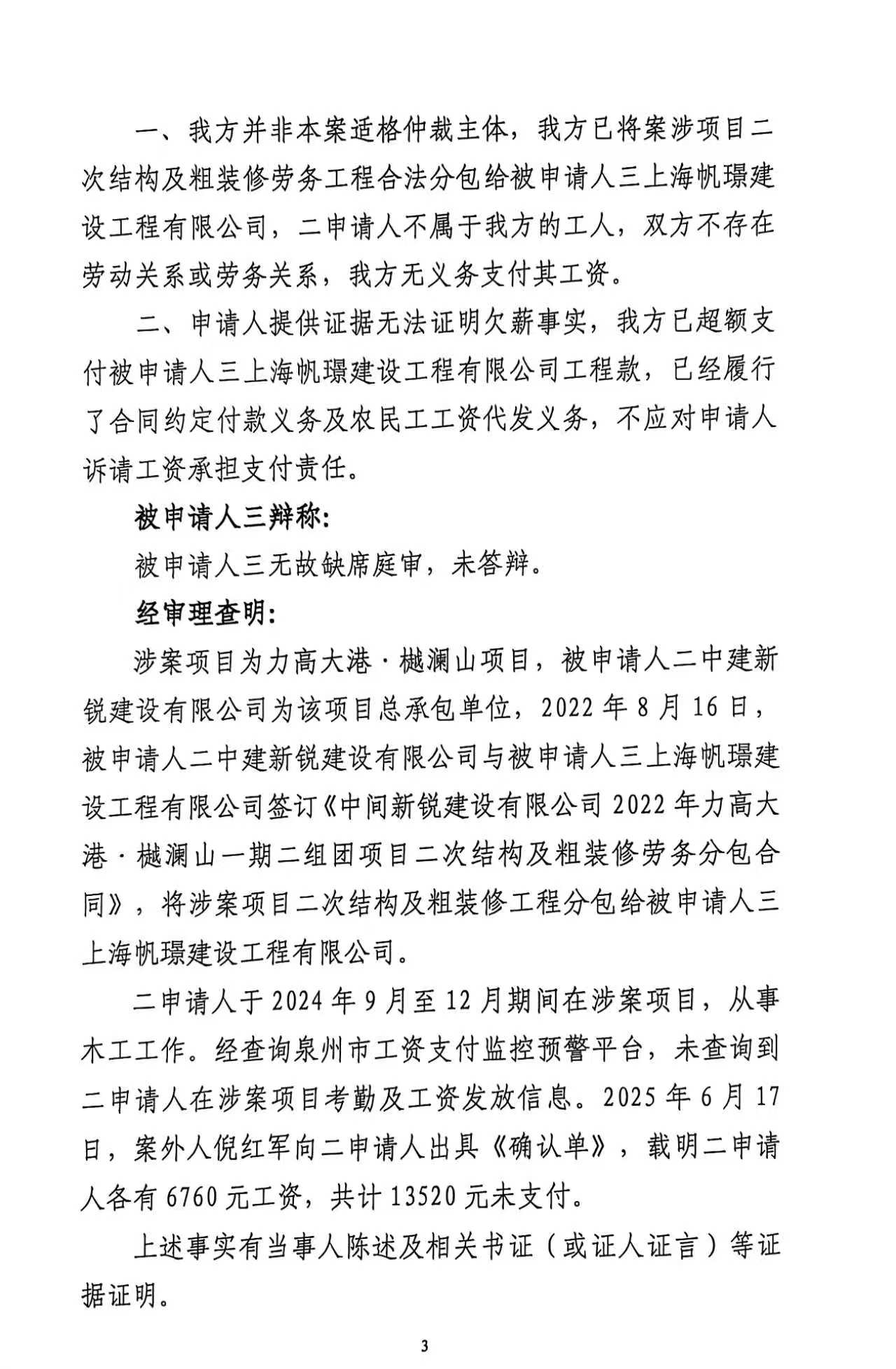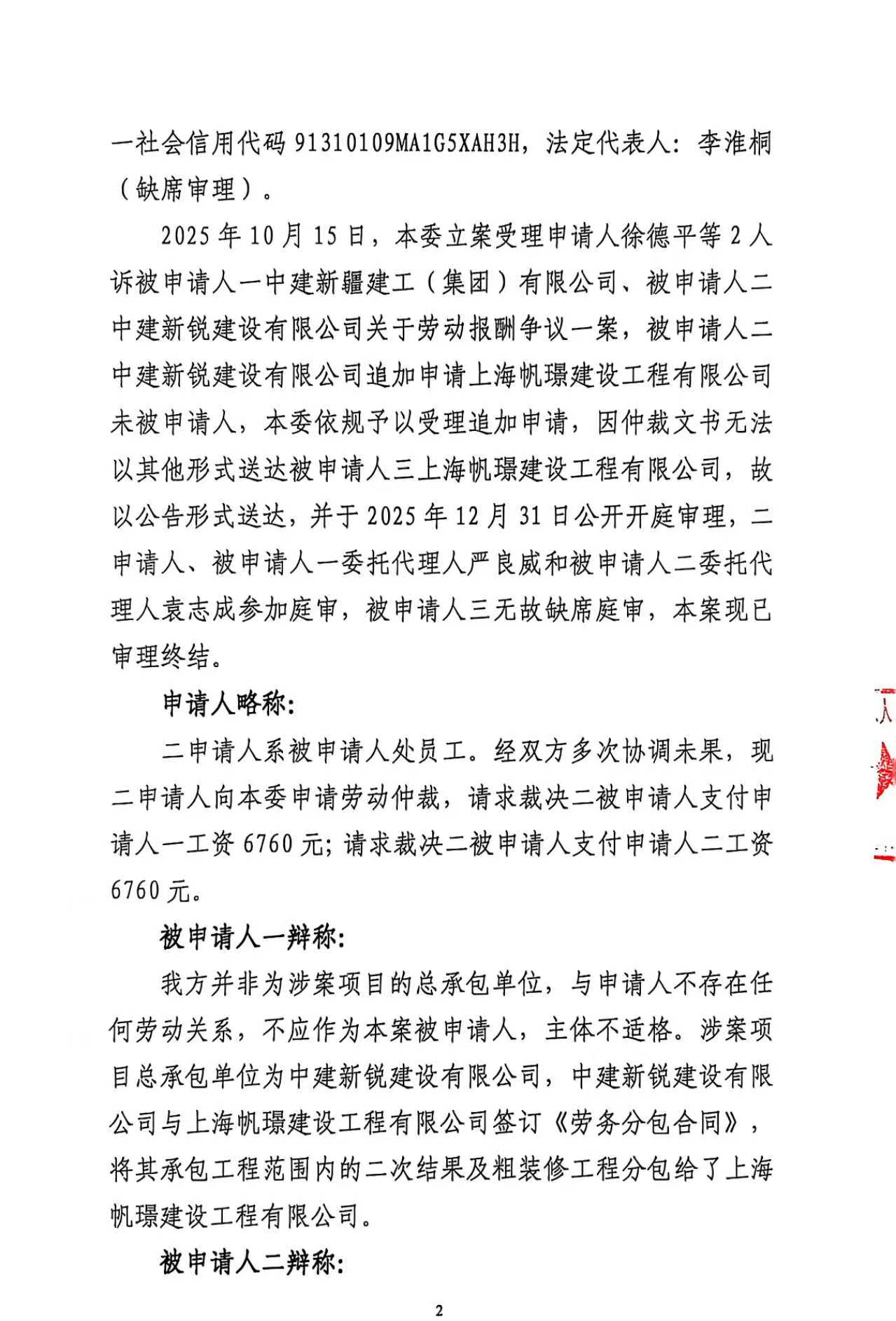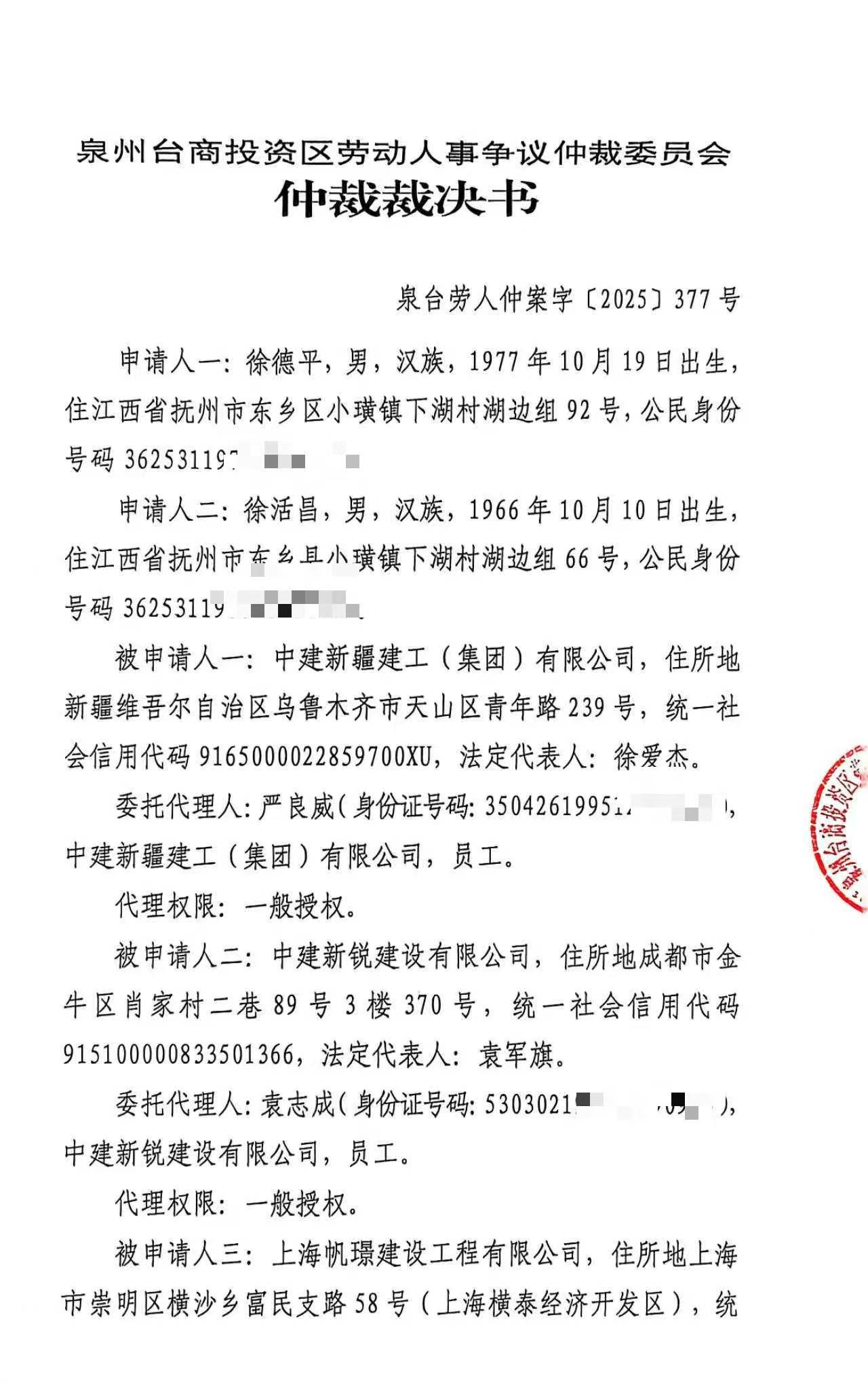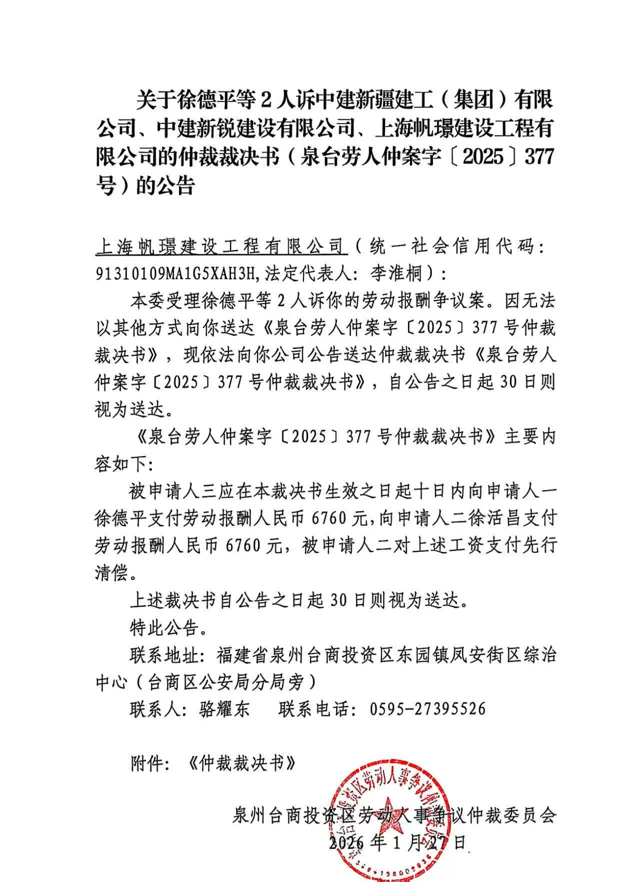 关于徐德平等2人诉中建新疆建工(集团)有限公司、中建新锐建设有限公司、上海帆璟建设工程有限公司(泉台劳人仲案字〔2025〕377号)仲裁裁决书的公告