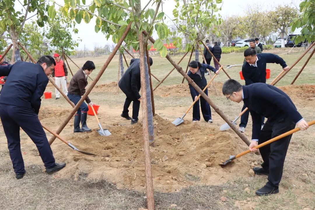 植树现场一派繁忙景象,大家热情高涨、分工协作,挥锹铲土、扶苗定植、培土压实、提水浇灌,每一道工序都细致认真,合力栽下一棵棵新苗,为玉沙湾公园增添了片片新绿,让春日的园区更显生机盎然。