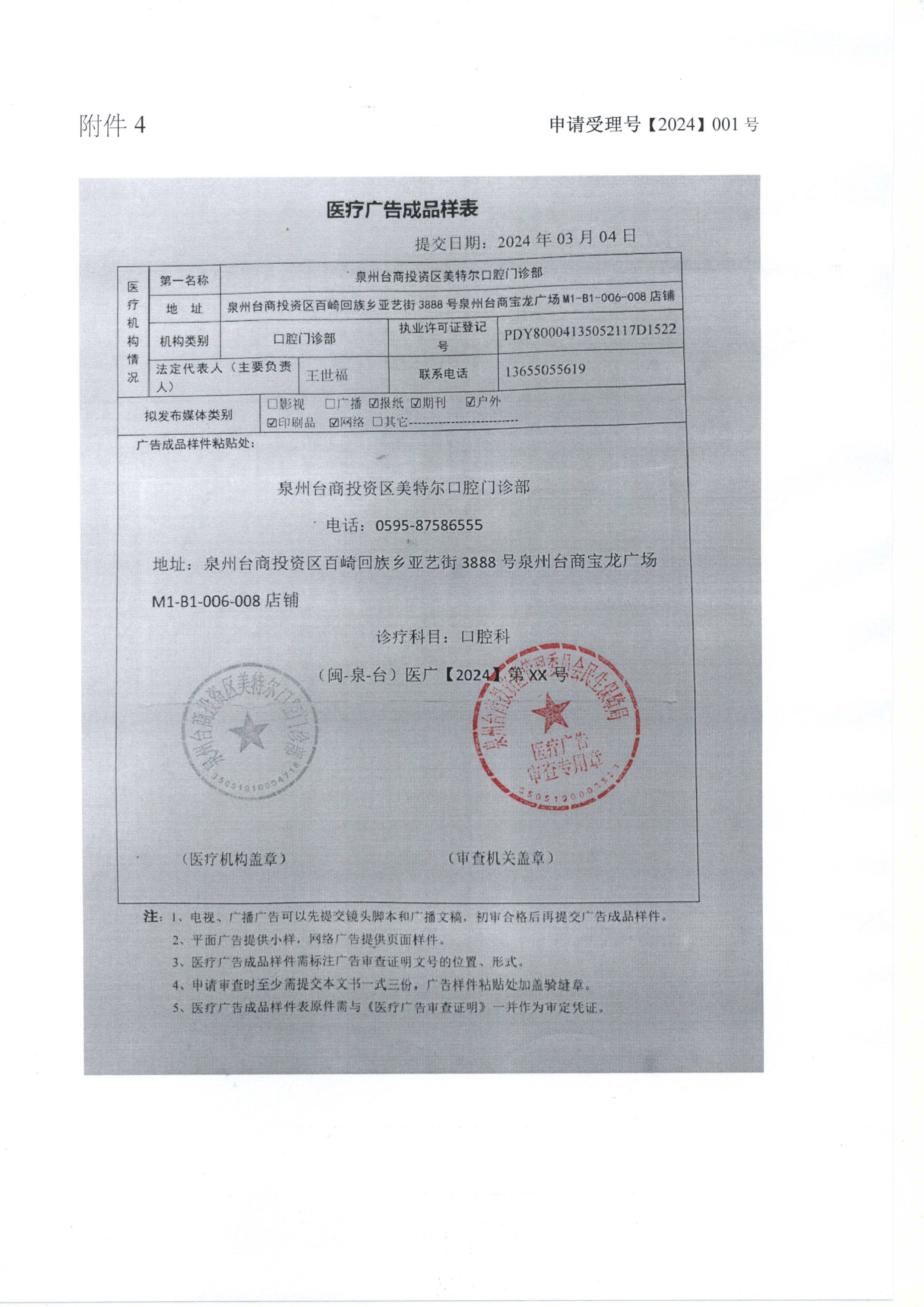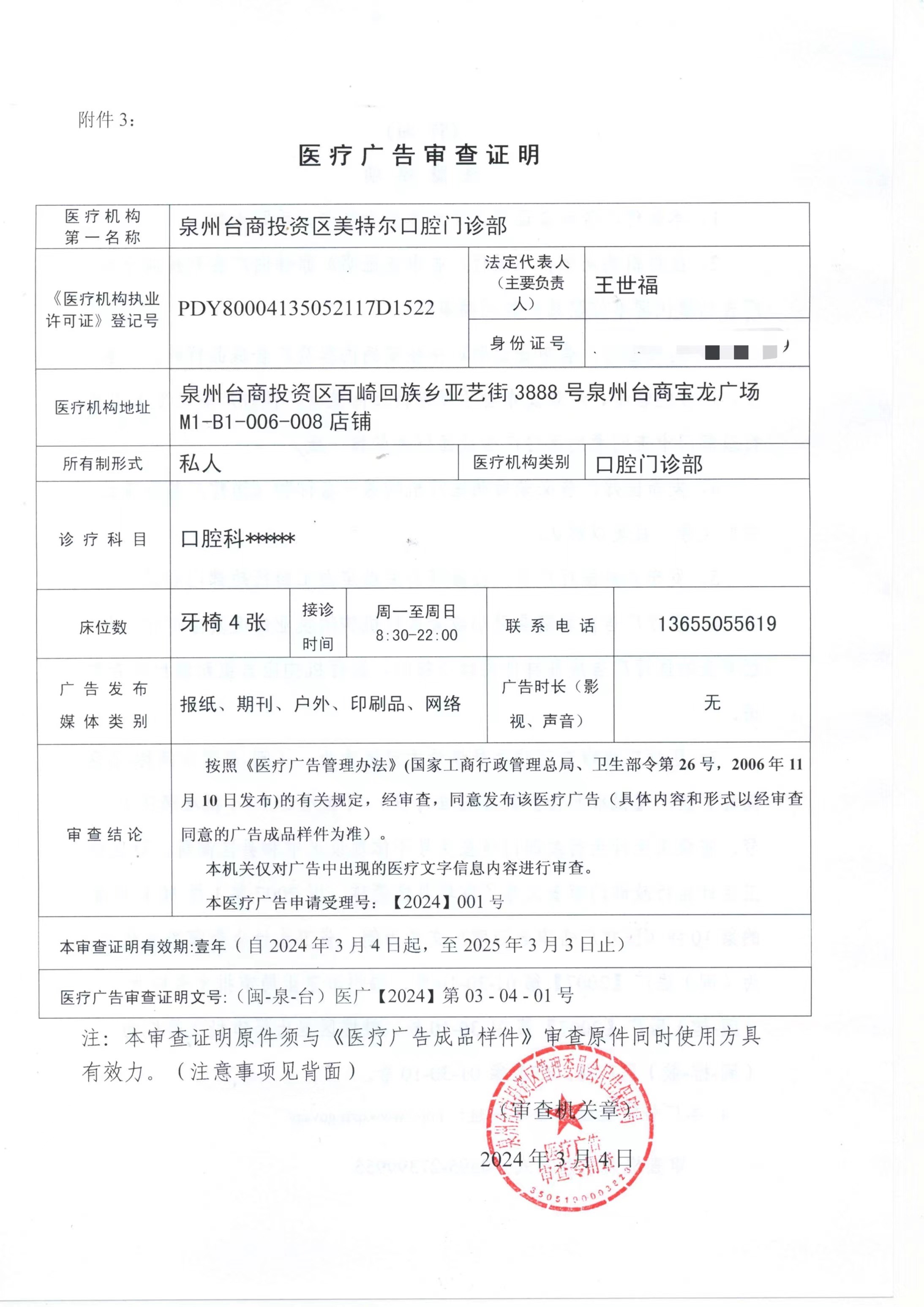 泉州台商投资区美特尔口腔门诊部医疗广告审查证明公示