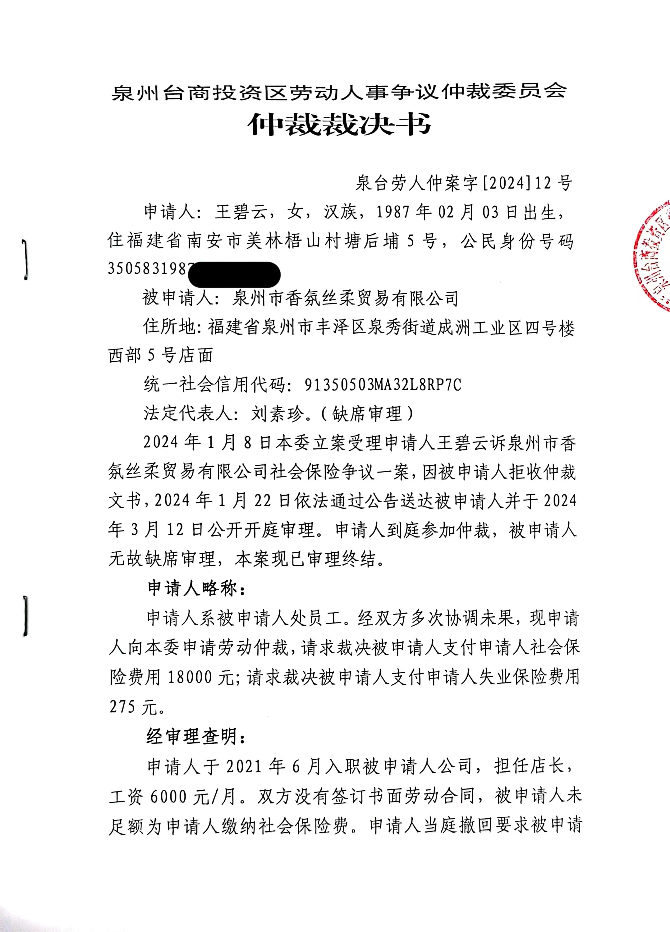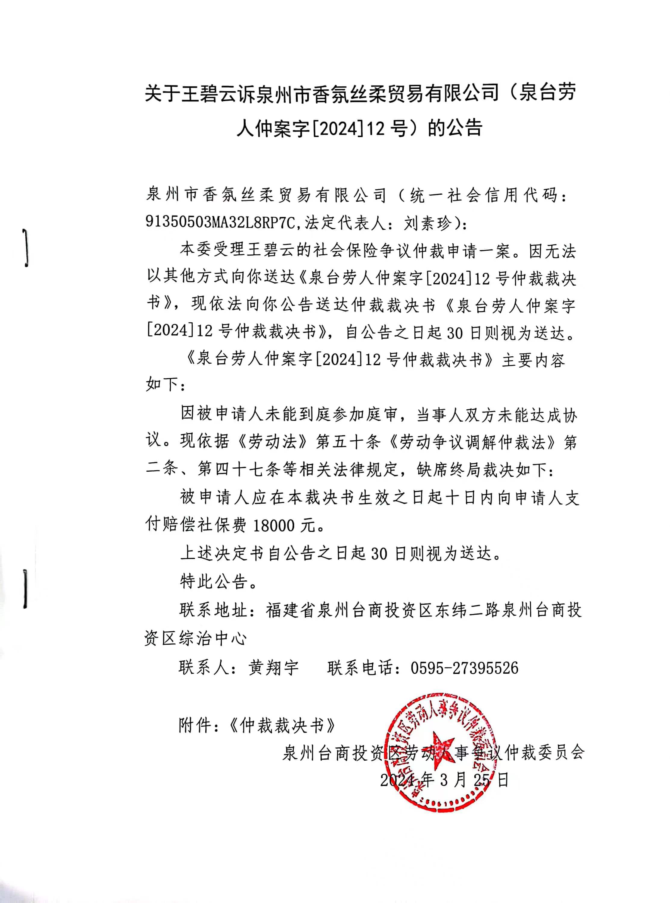 关于王碧云诉泉州市香氛丝柔贸易有限公司(泉台劳人仲案字[2024]12号)的公告