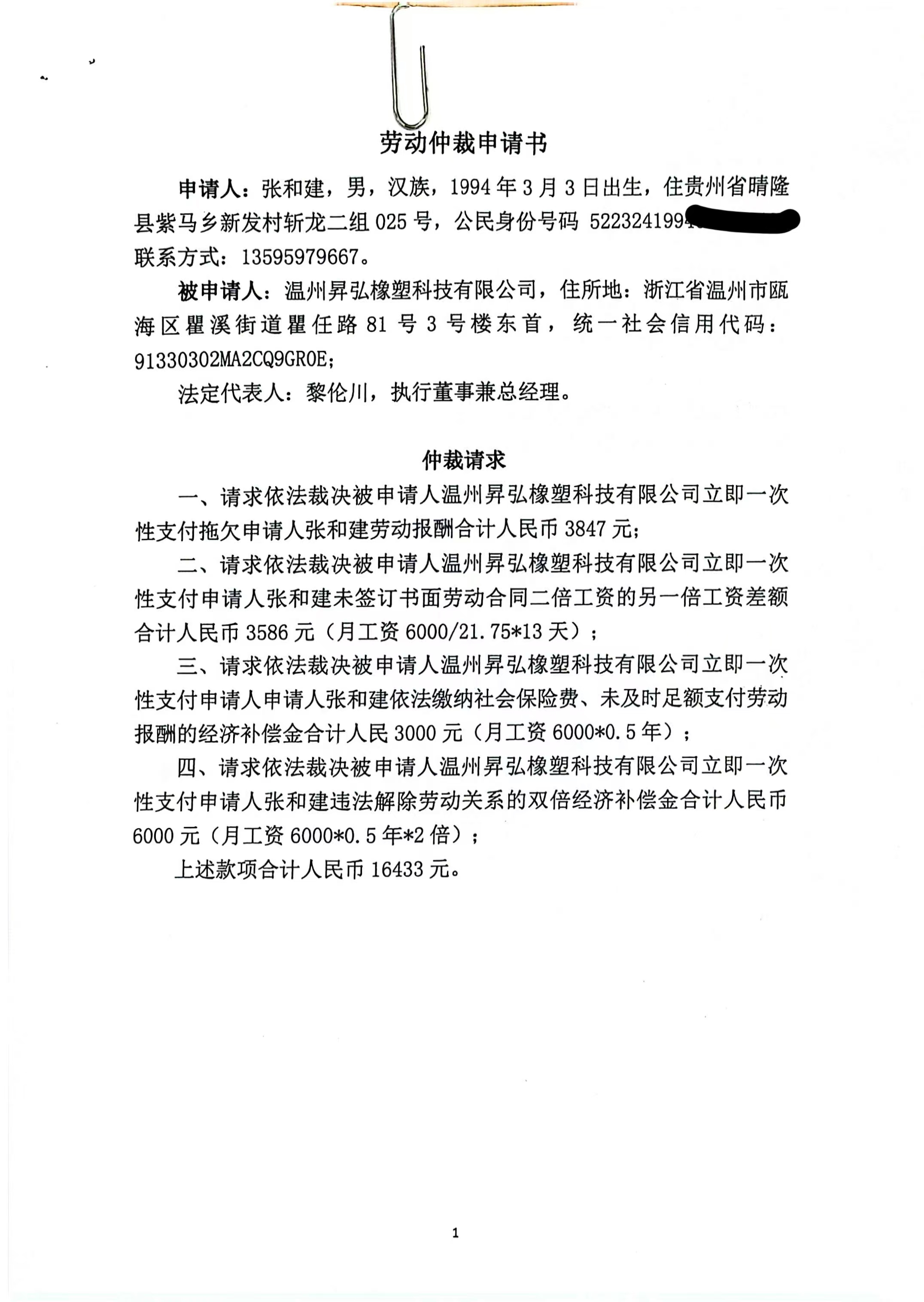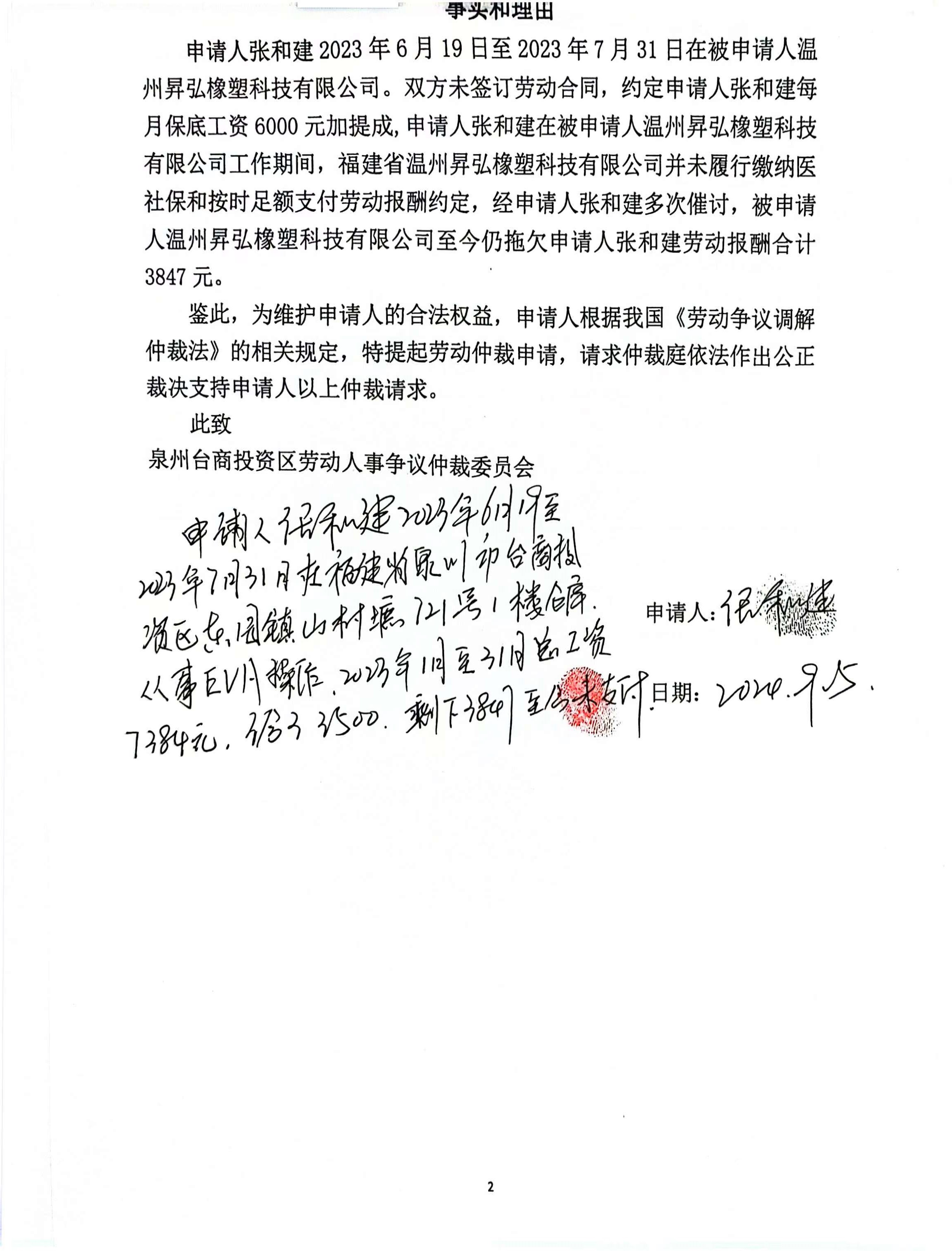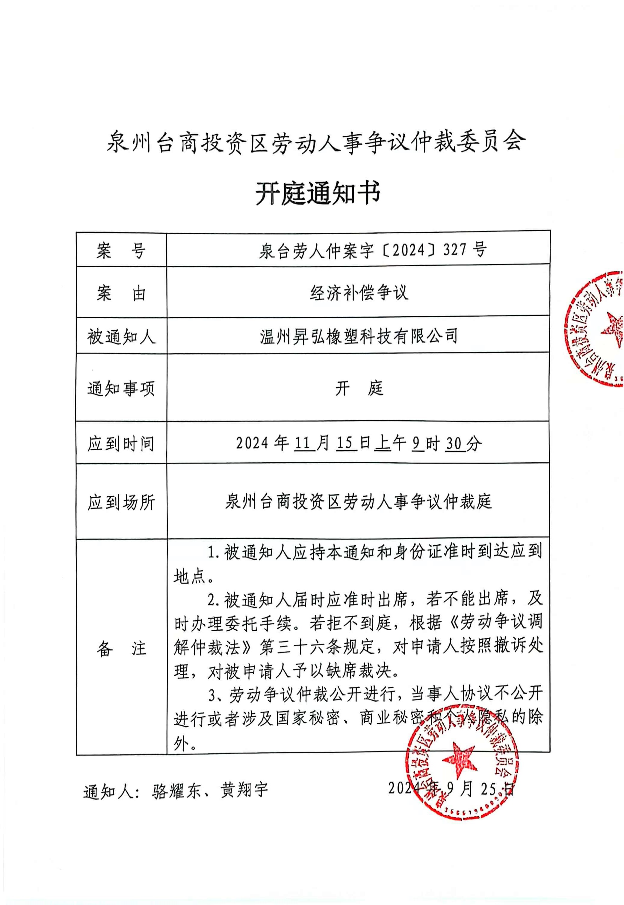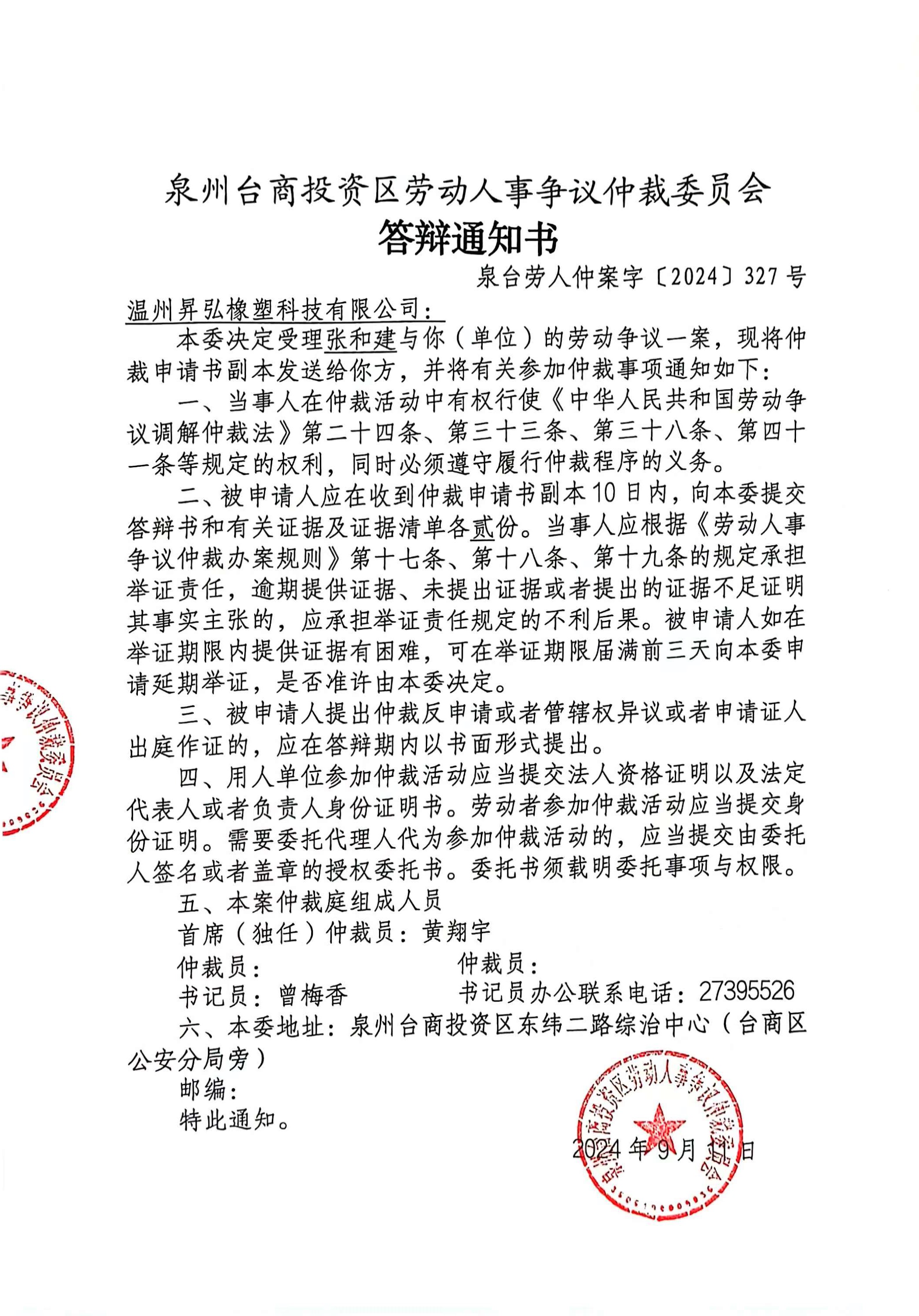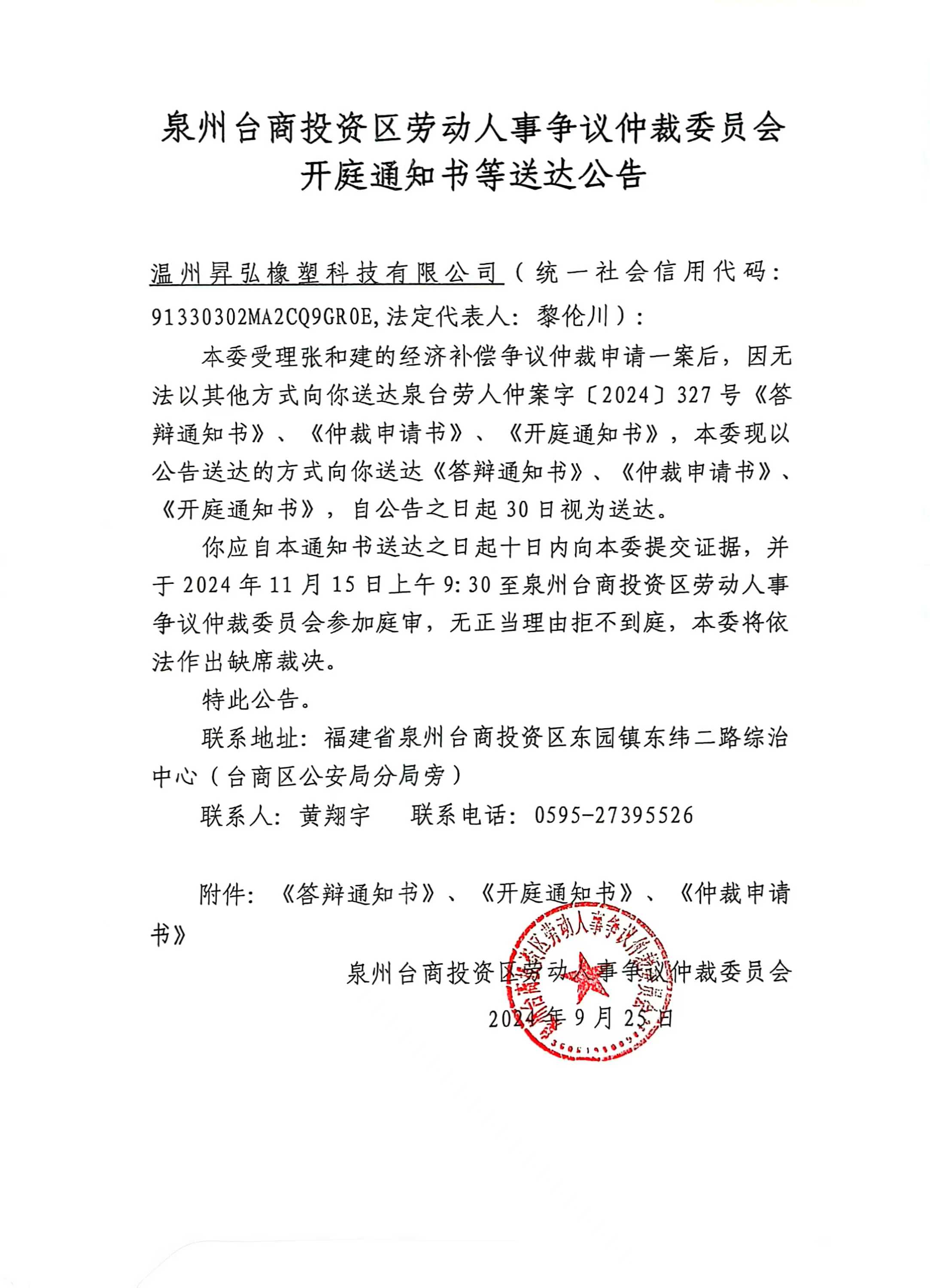 关于张和建诉温州昇宏橡塑科技有限公司(泉台劳人仲案字[2024]327号)开庭通知书等文书的公告