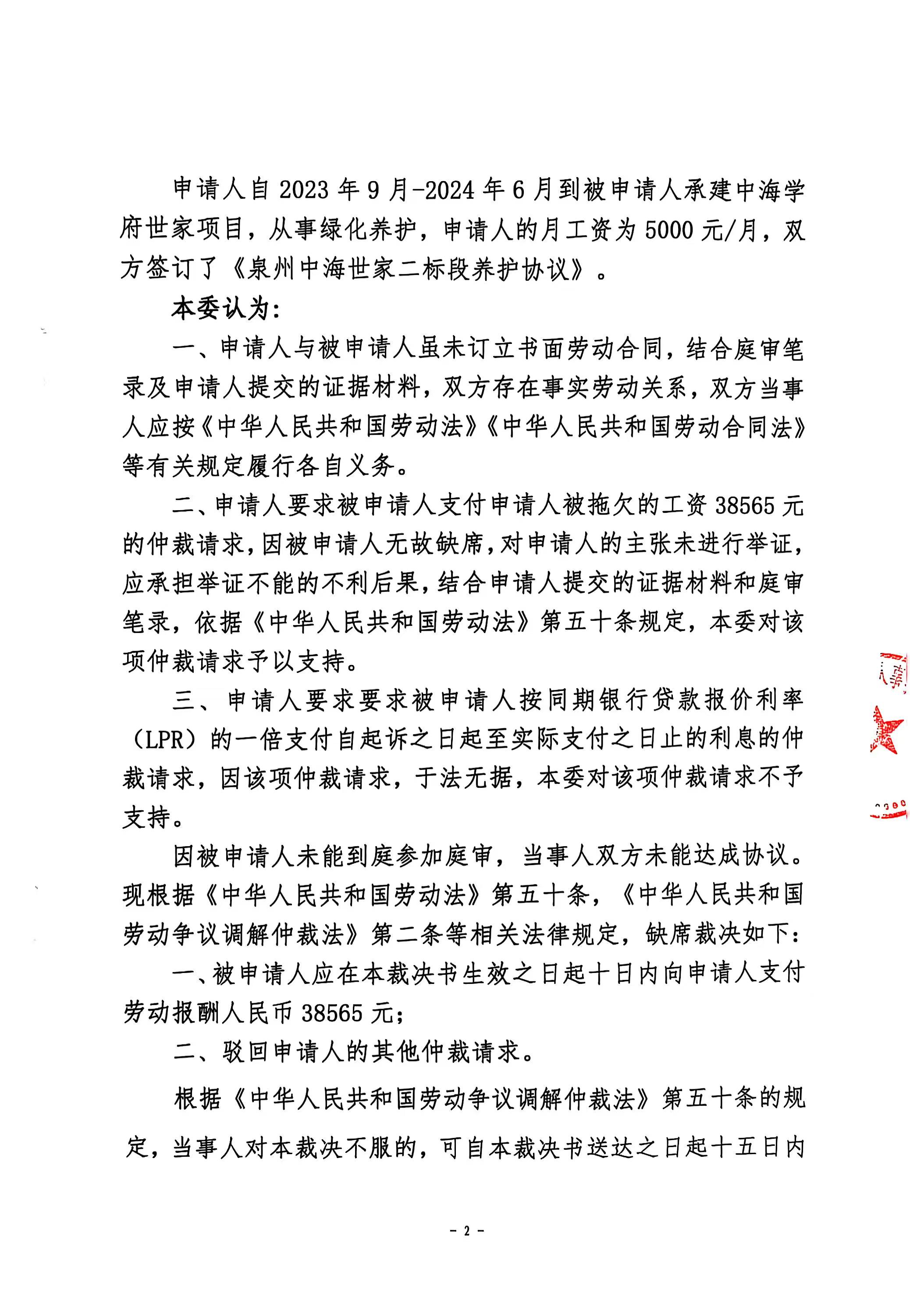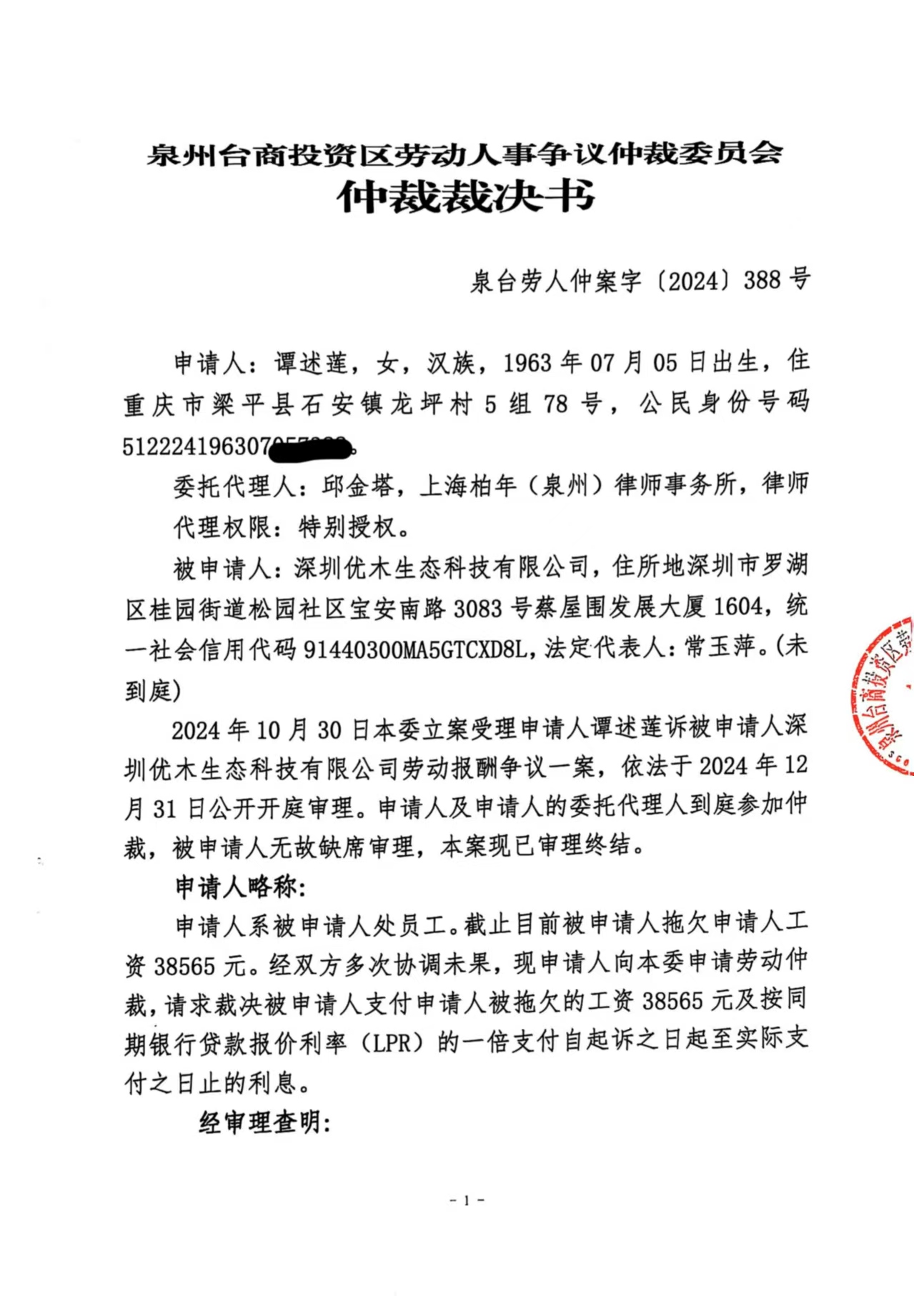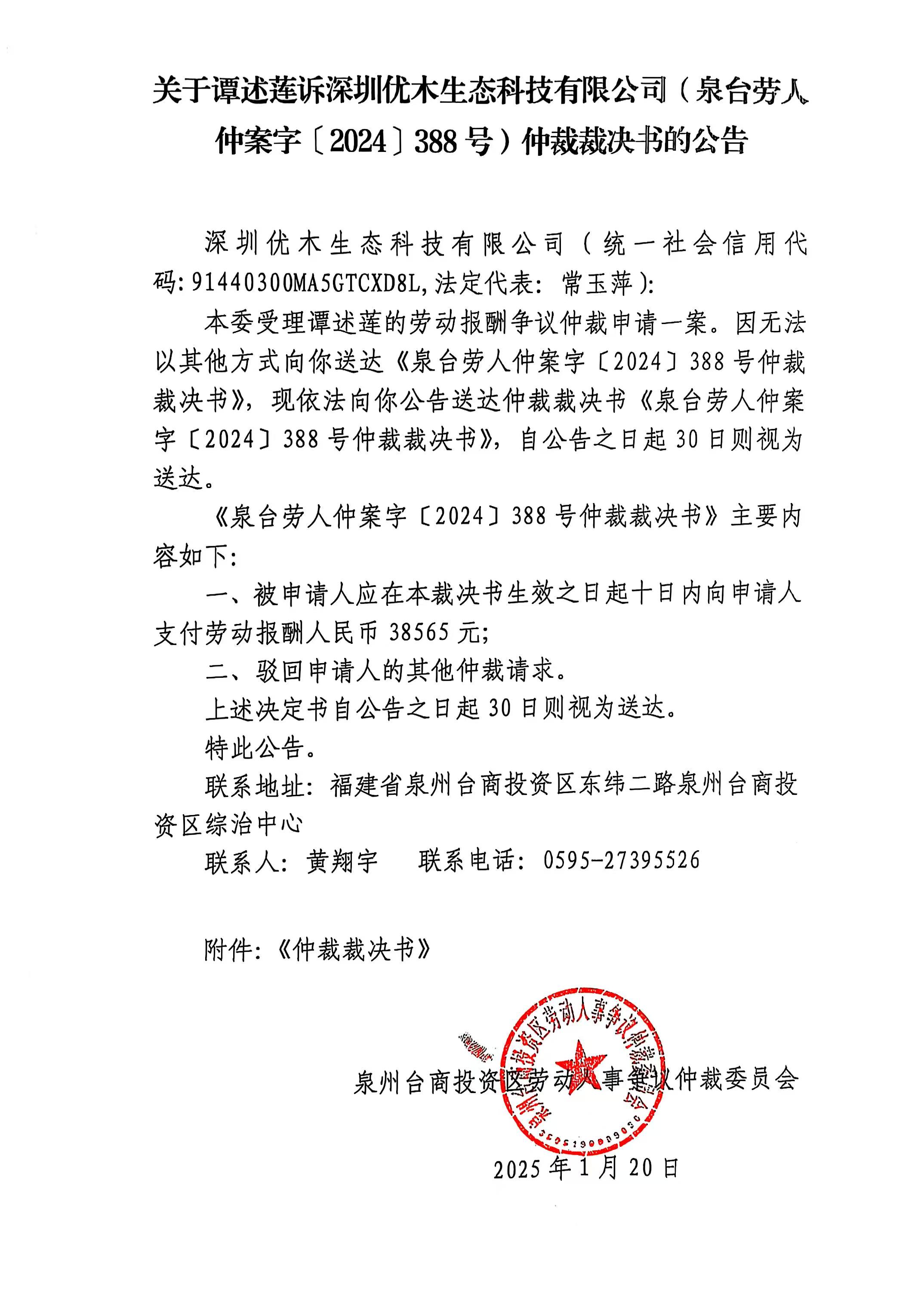 关于谭述莲诉深圳优木生态科技有限公司(泉台劳人仲案字[2024]388号)仲裁裁决书文书的公告