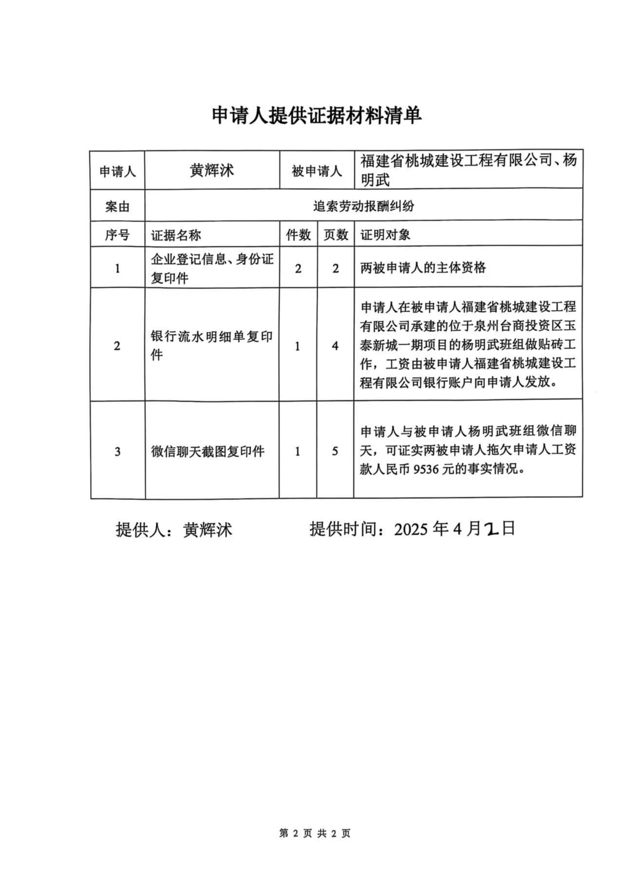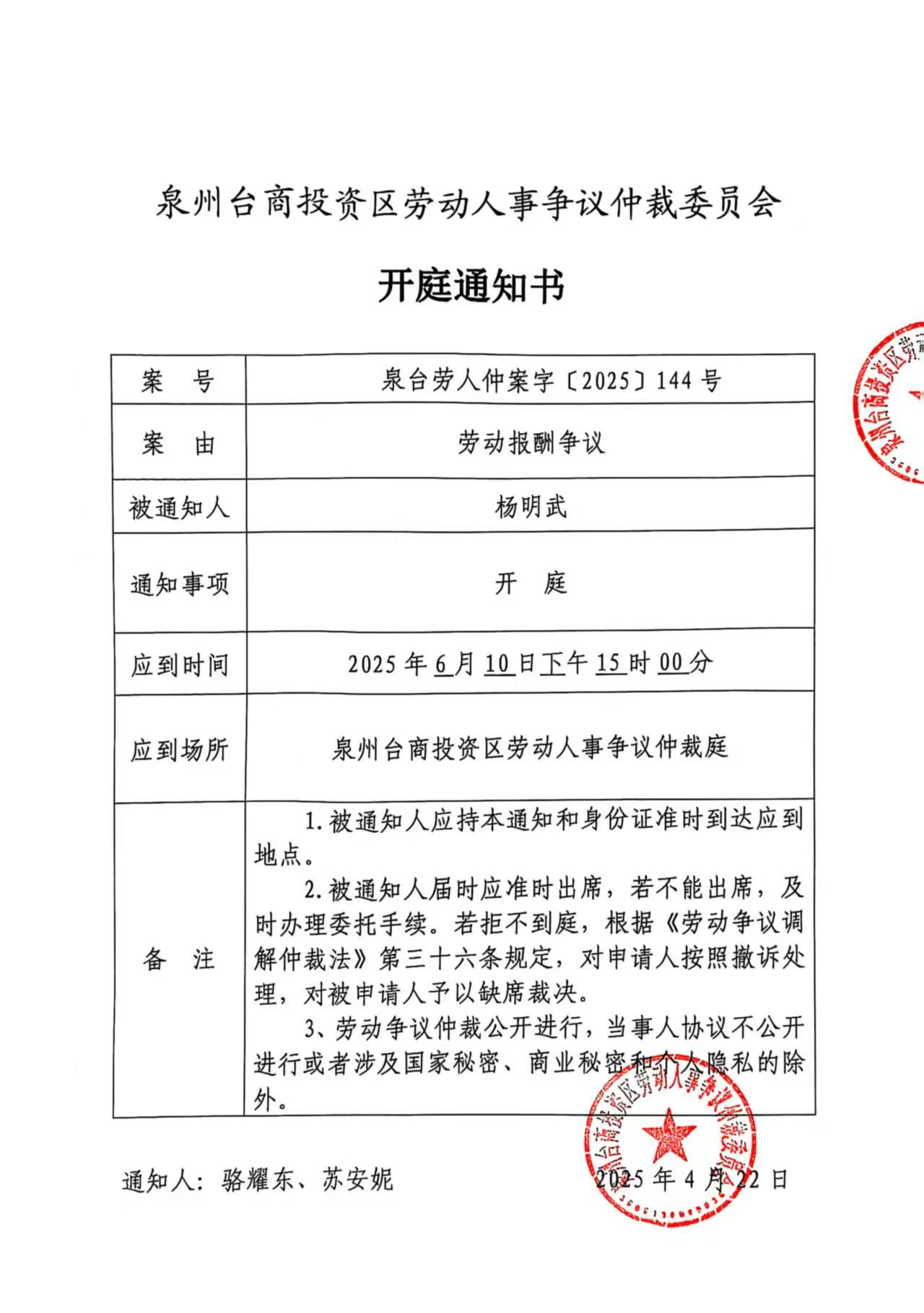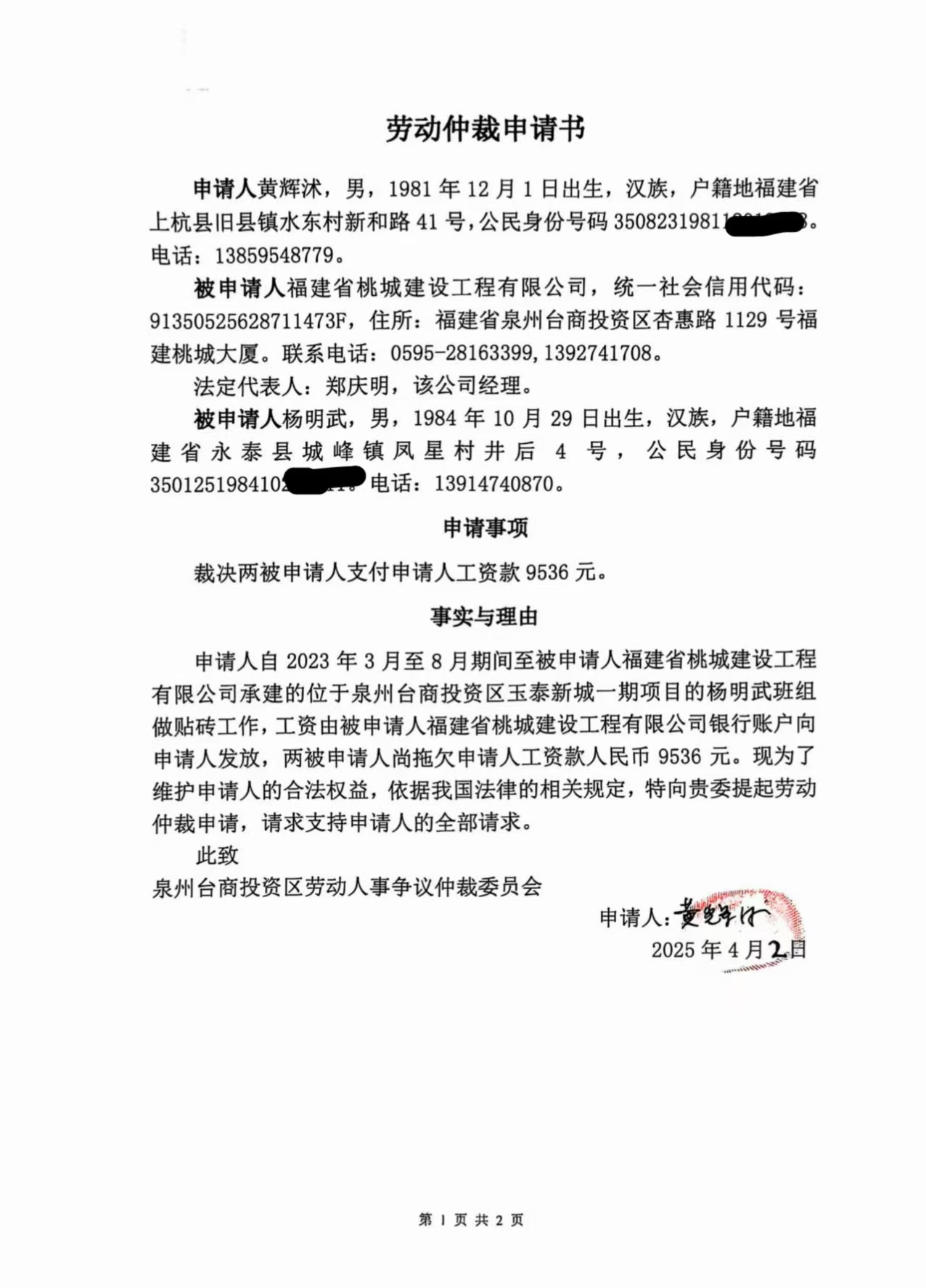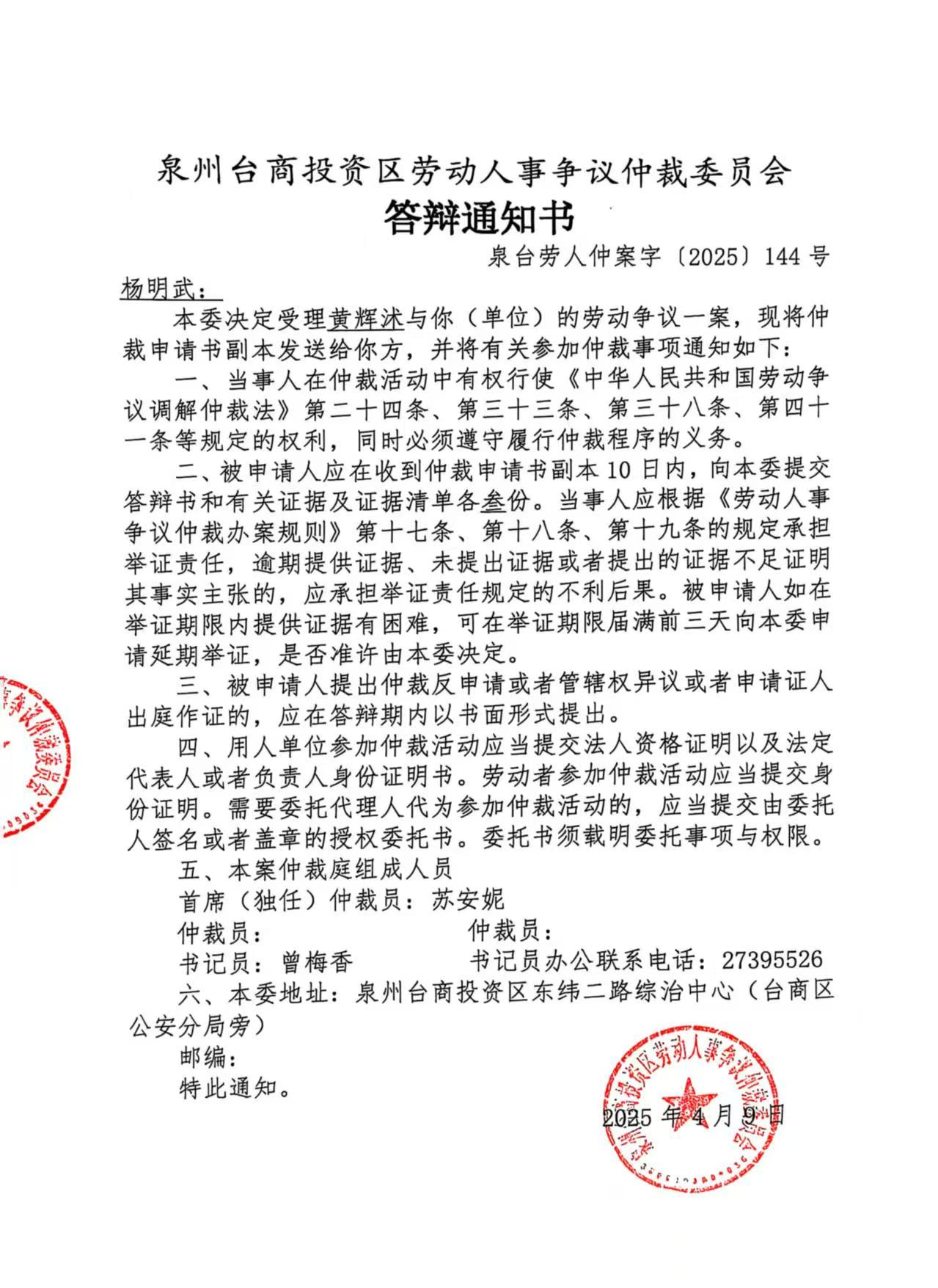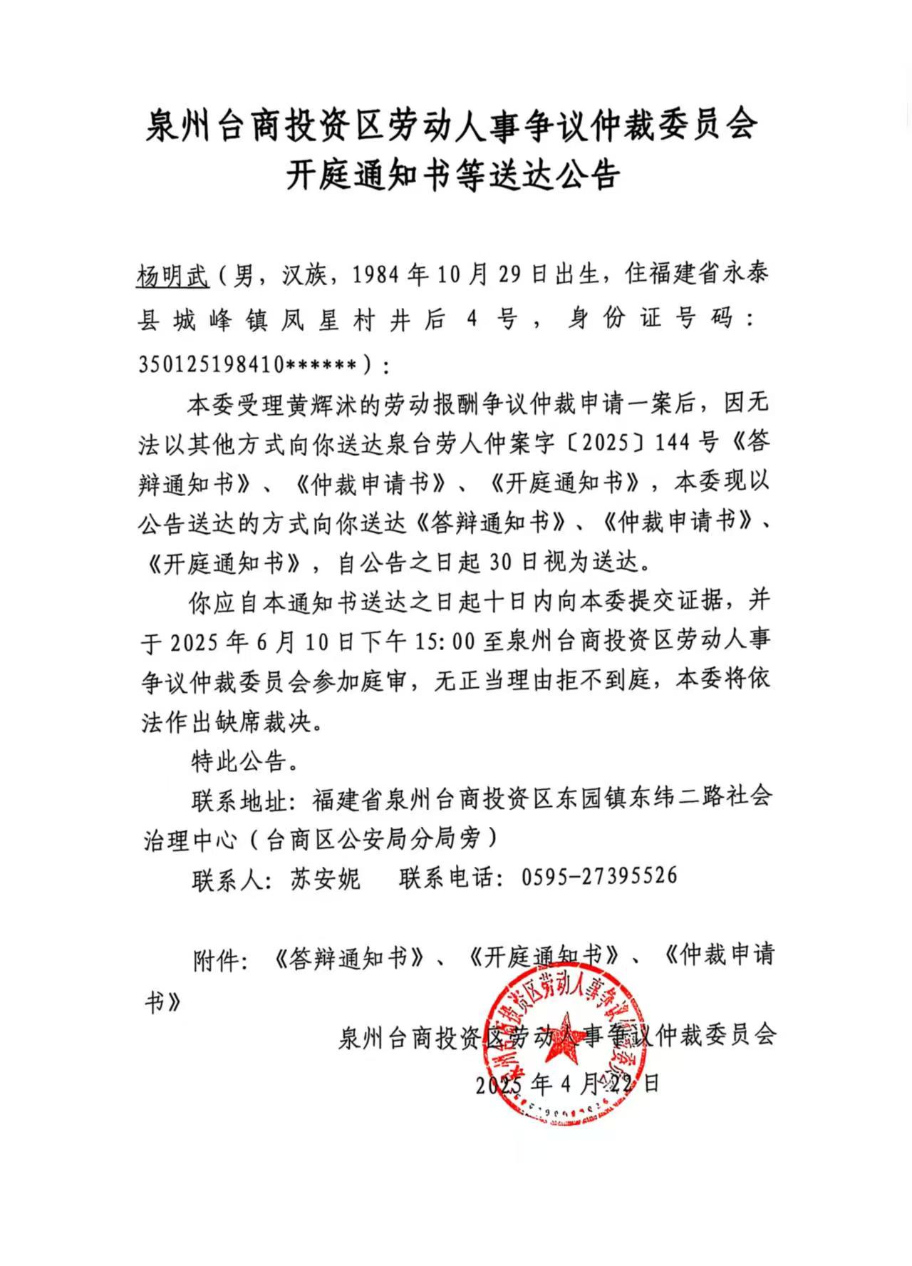 关于黄辉沐诉福建省桃城建设工程有限公司、杨明武(泉台劳人仲案字[2025]144号)仲裁文书的公告