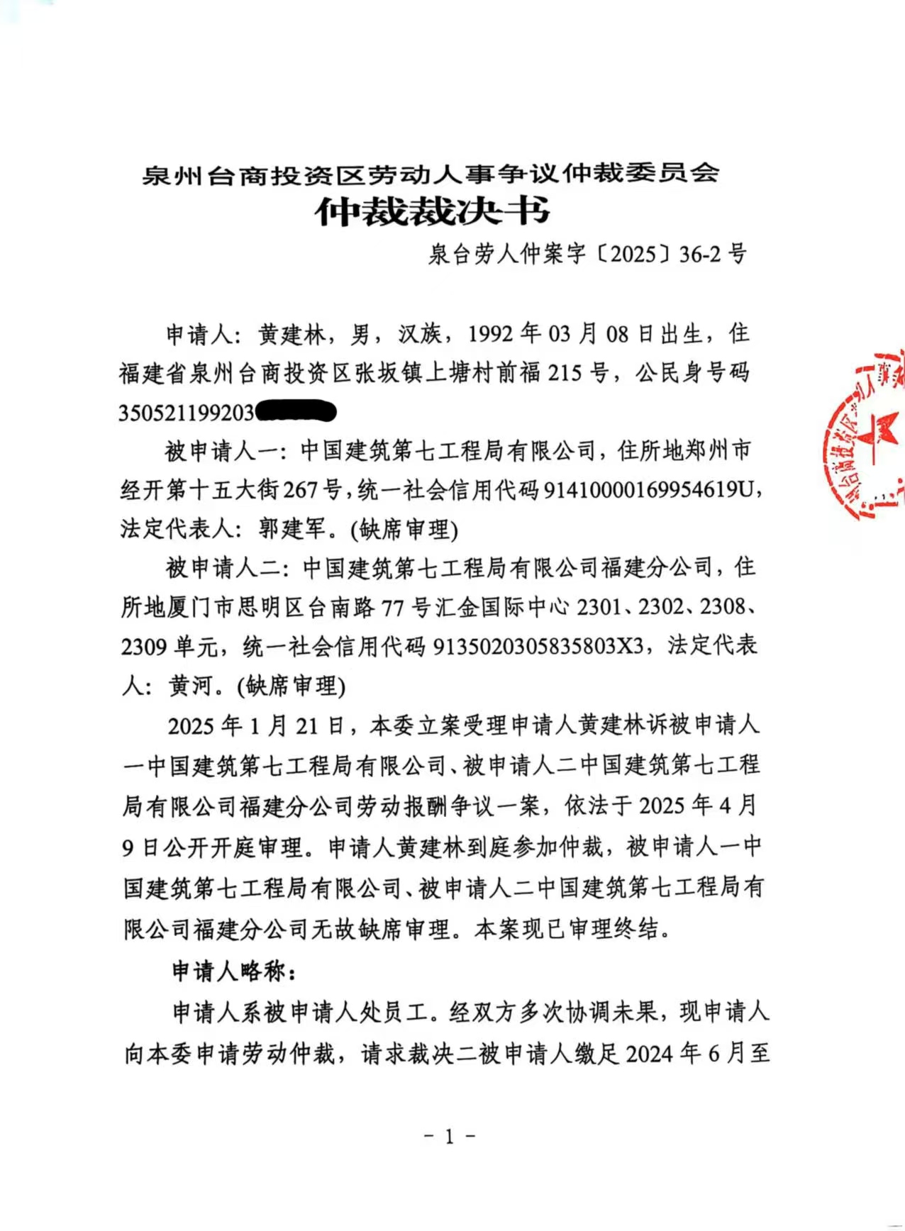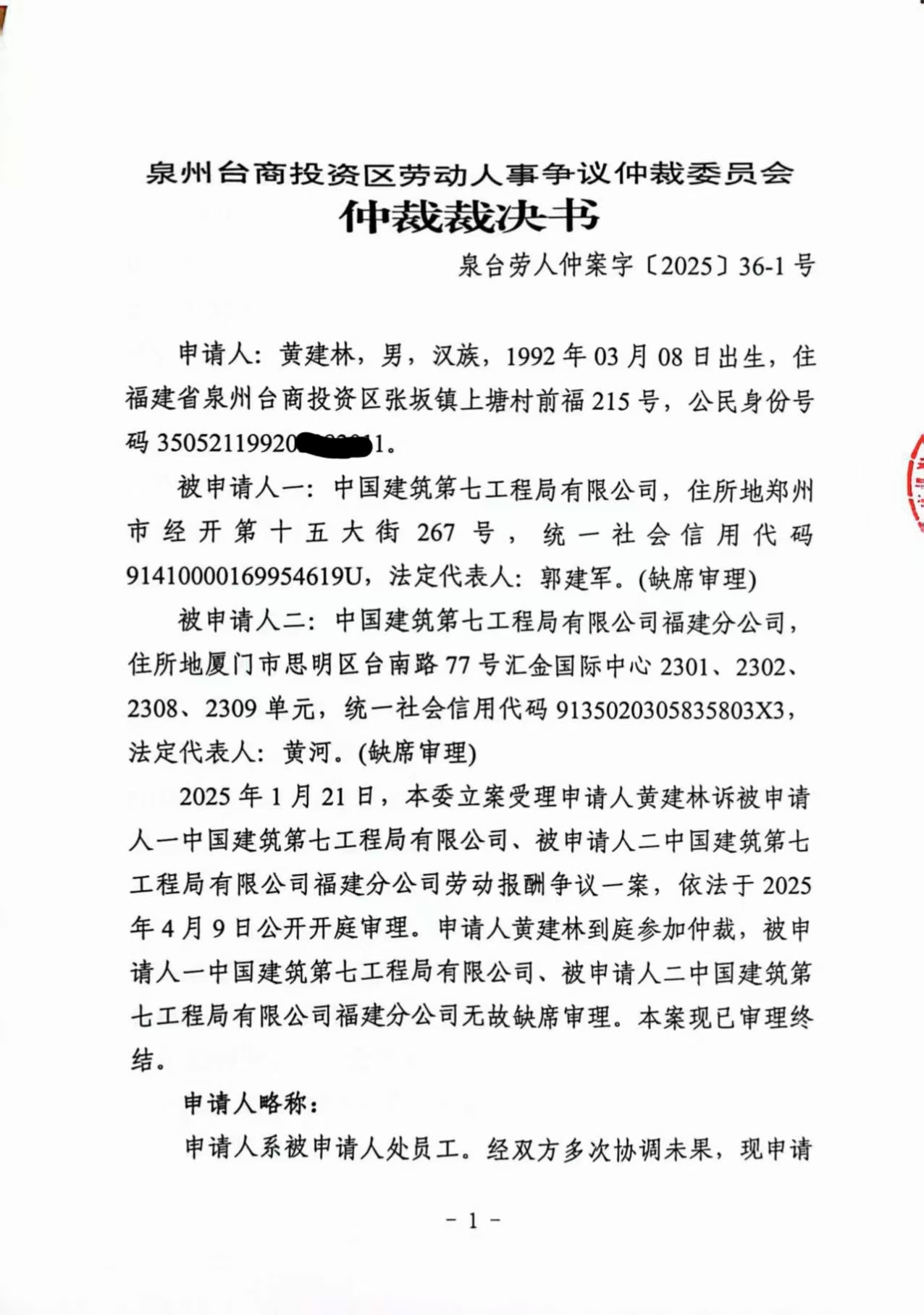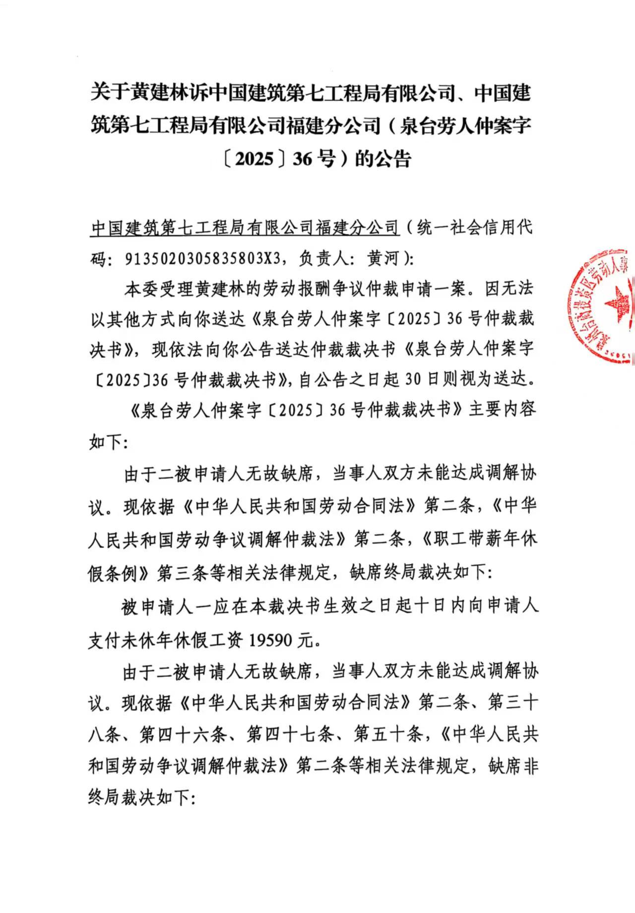 关于黄建林诉中国建筑第七工程局有限公司、中国建筑第七工程局有限公司福建分公司(泉台劳人仲案字[2025]36号)裁决书的公告