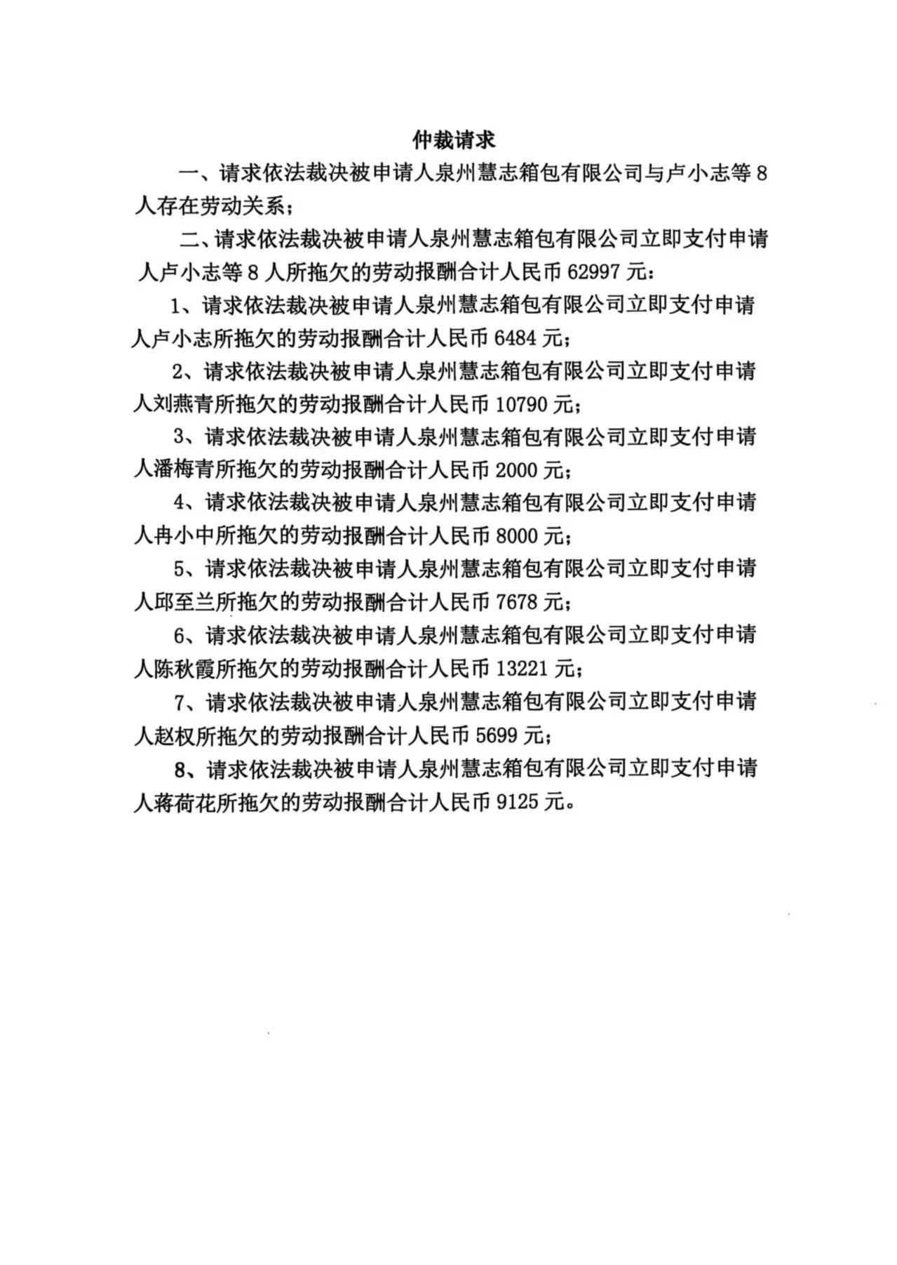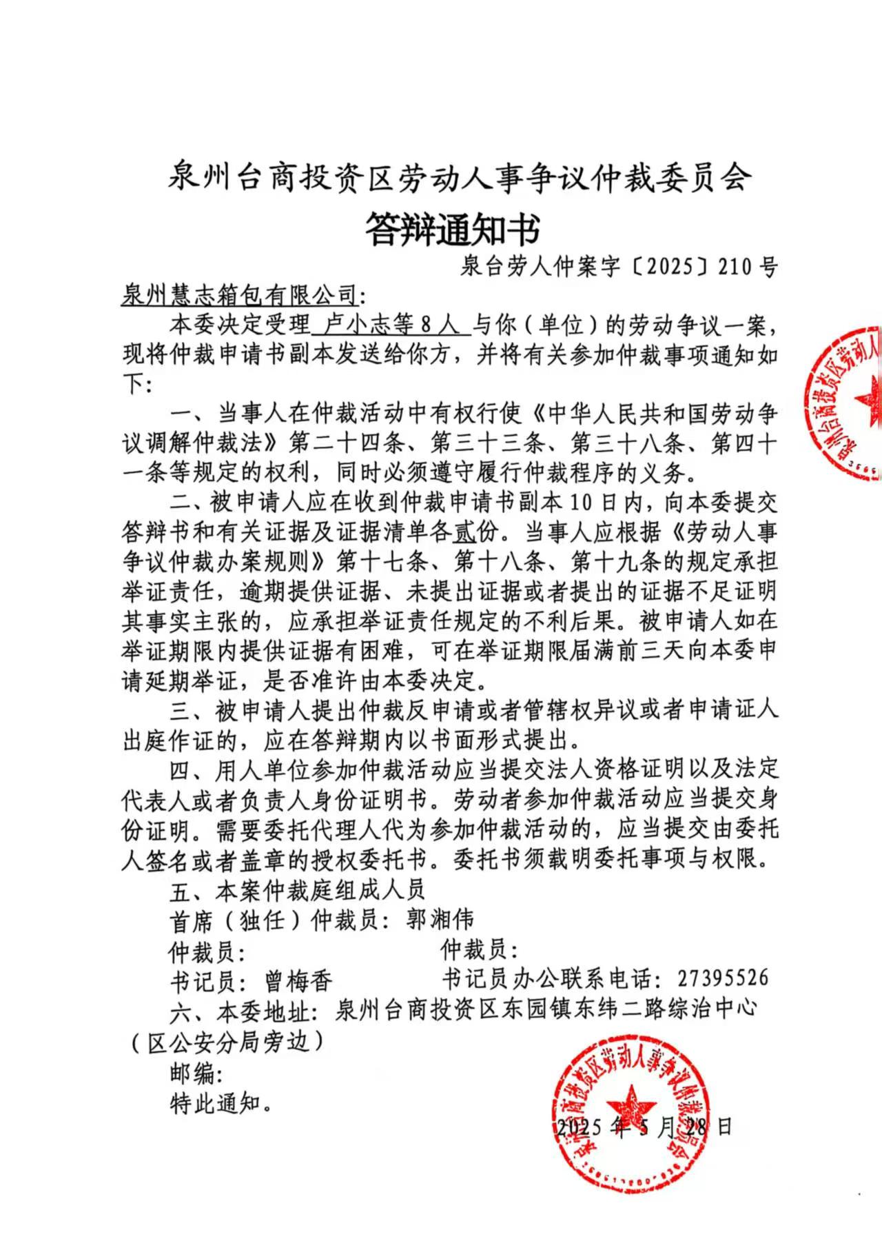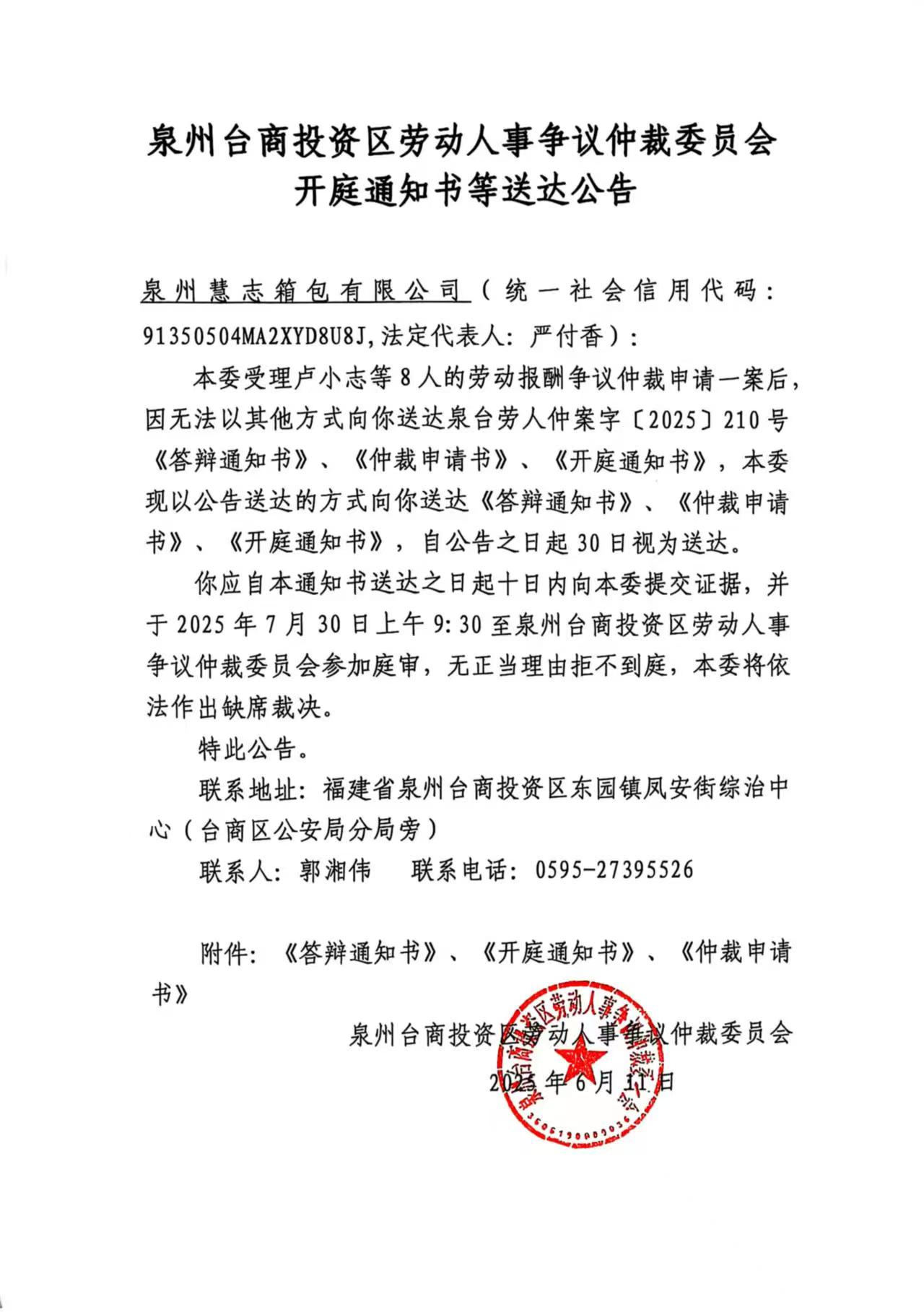 关于卢小志等8人诉泉州慧志箱包有限公司(泉台劳人仲案字[2025]210号)仲裁文书的公告