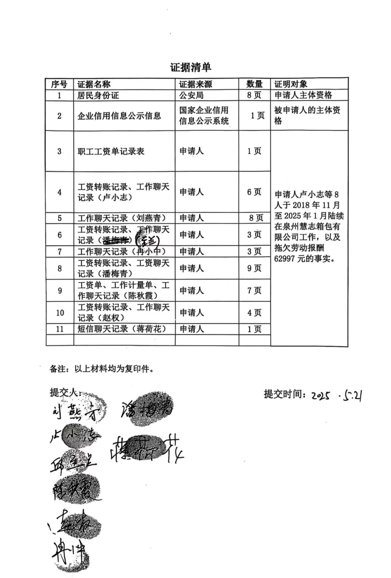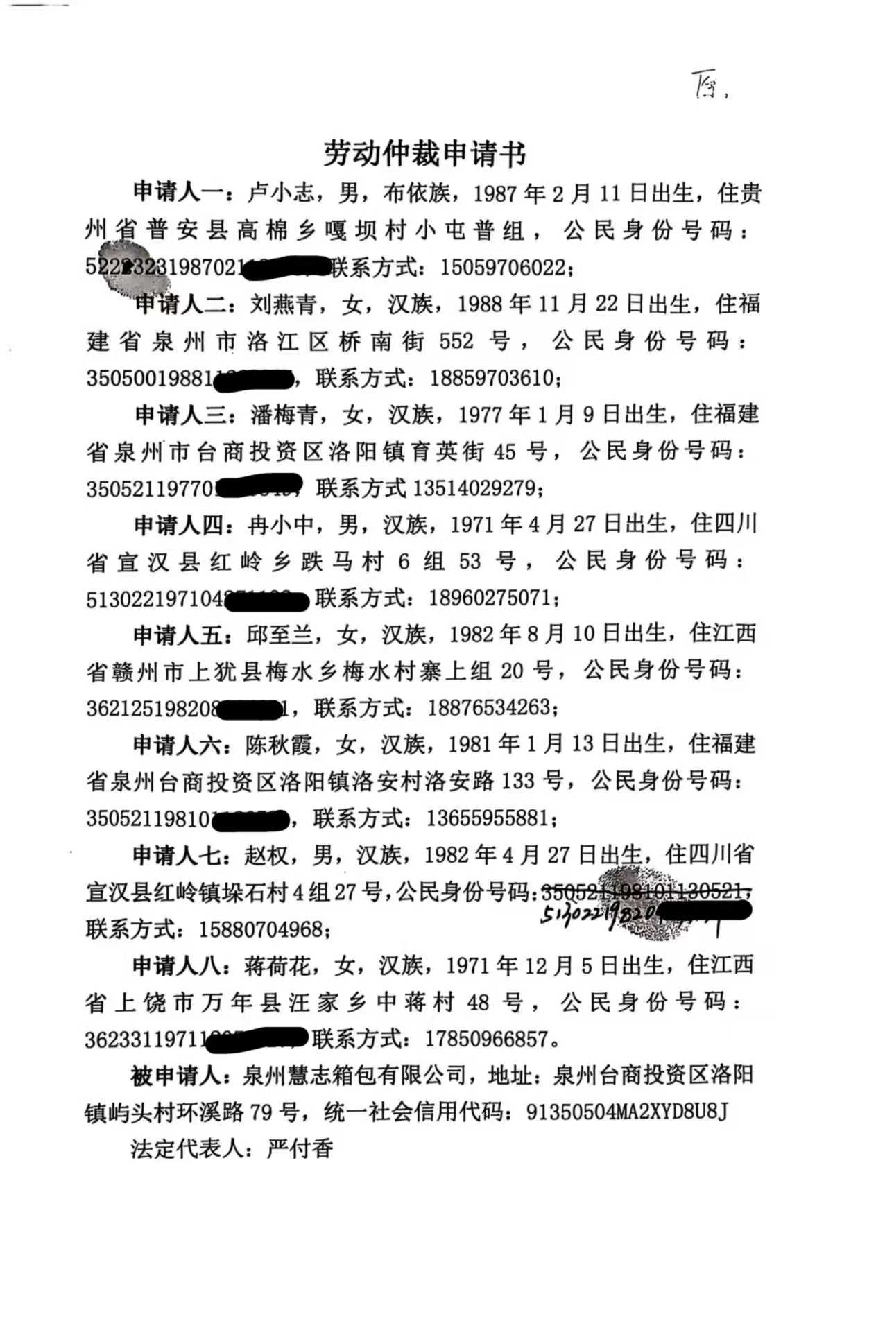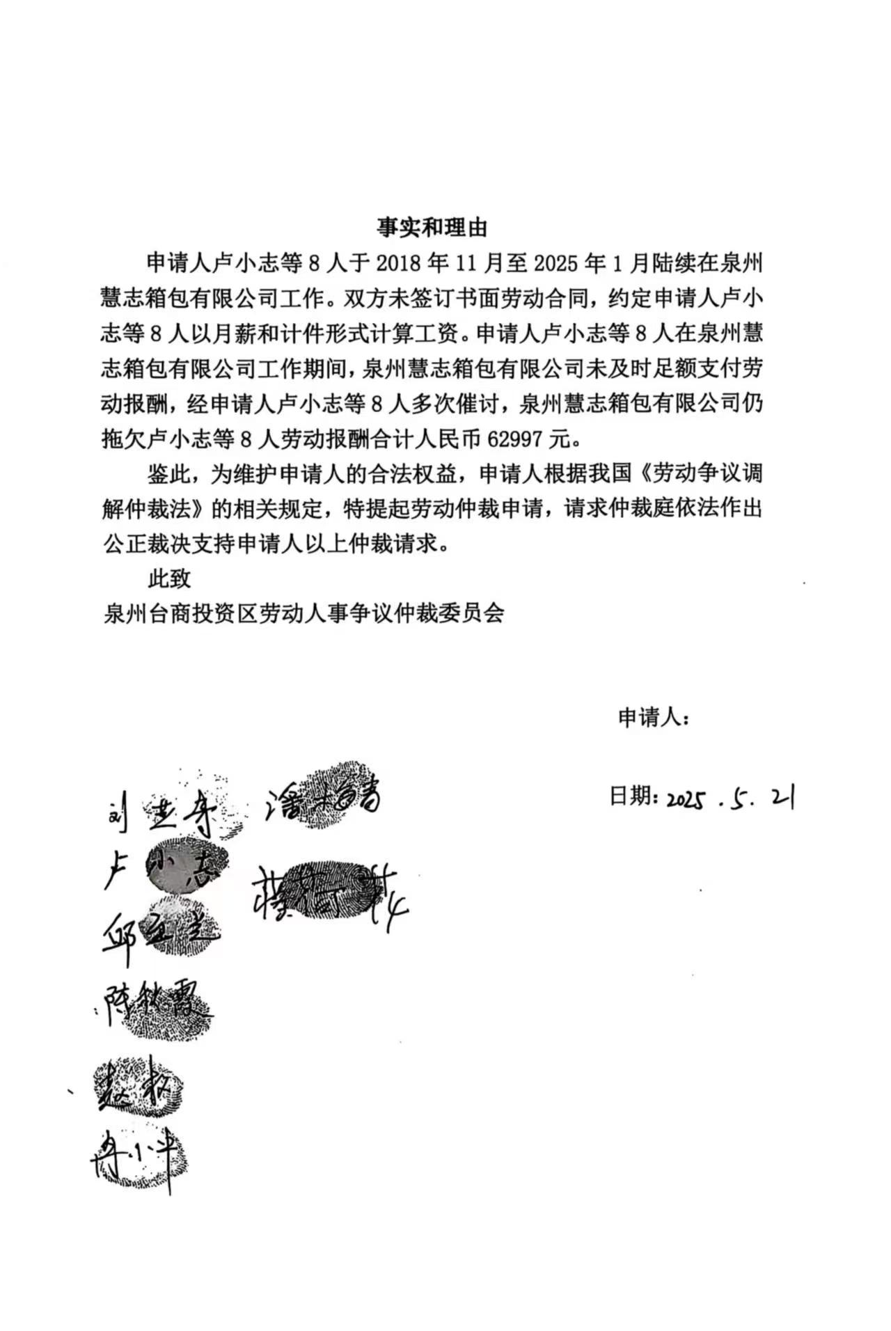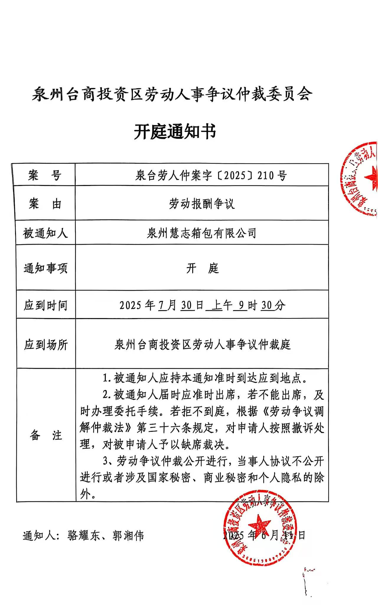 关于卢小志等8人诉泉州慧志箱包有限公司(泉台劳人仲案字[2025]210号)仲裁文书的公告