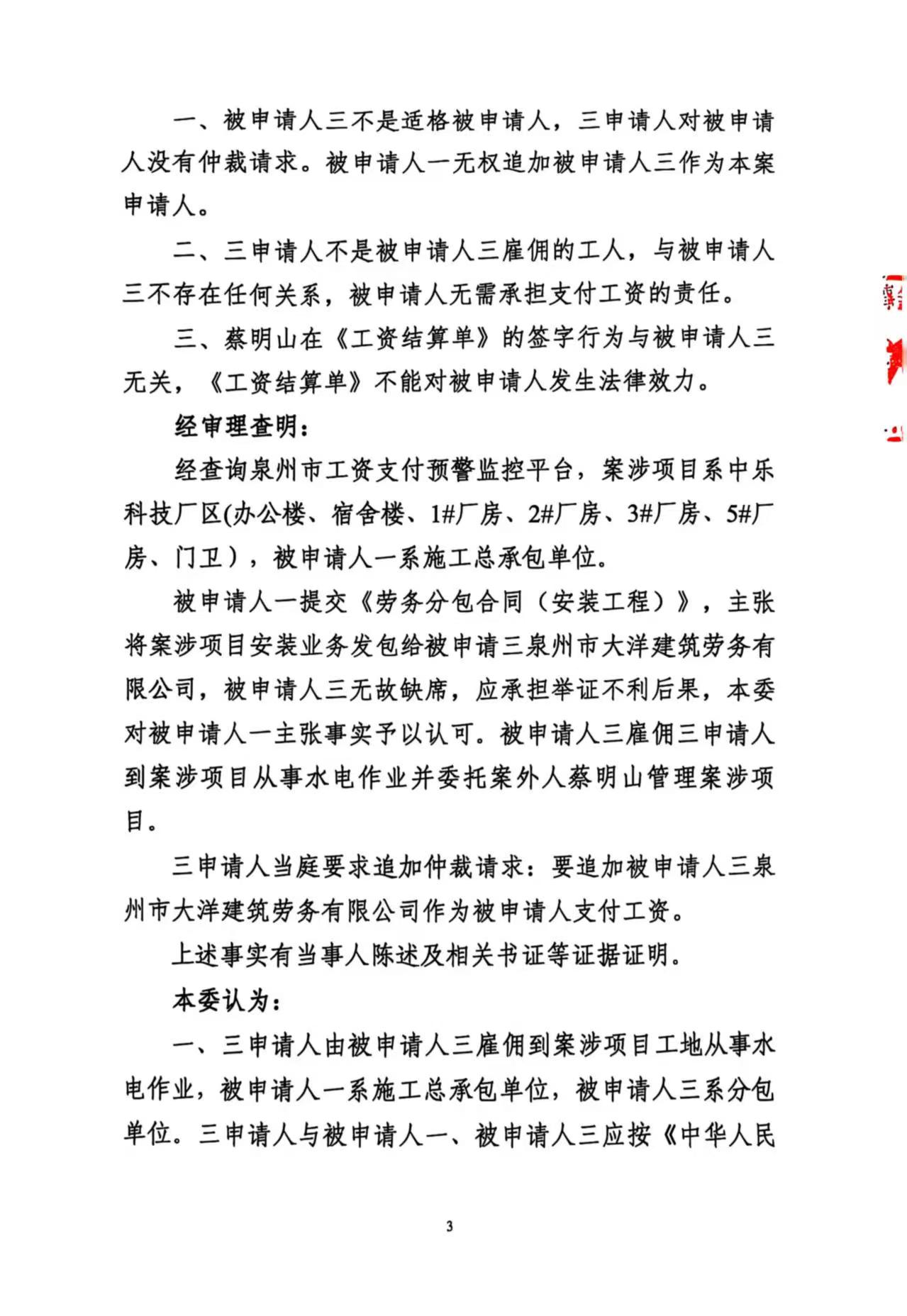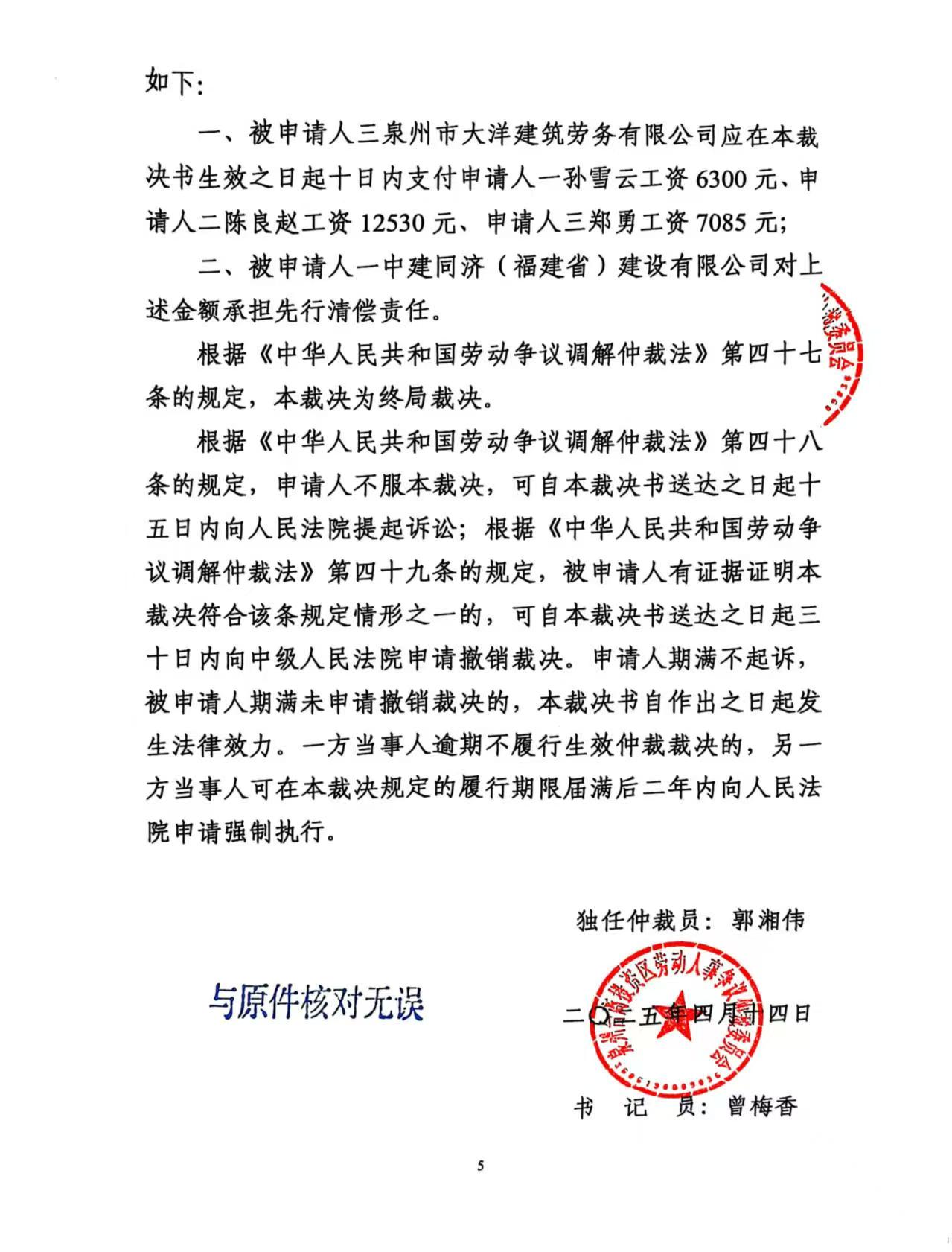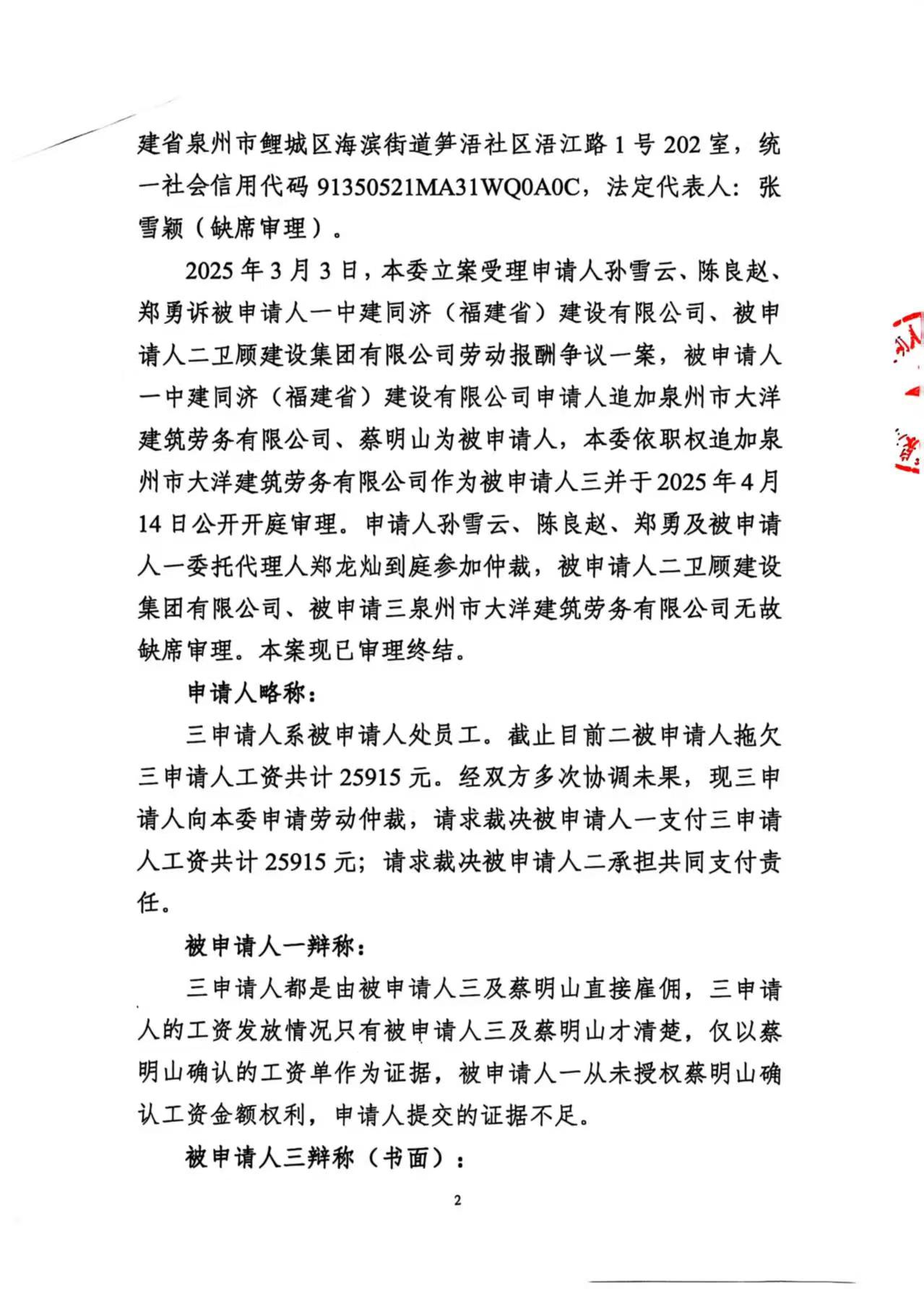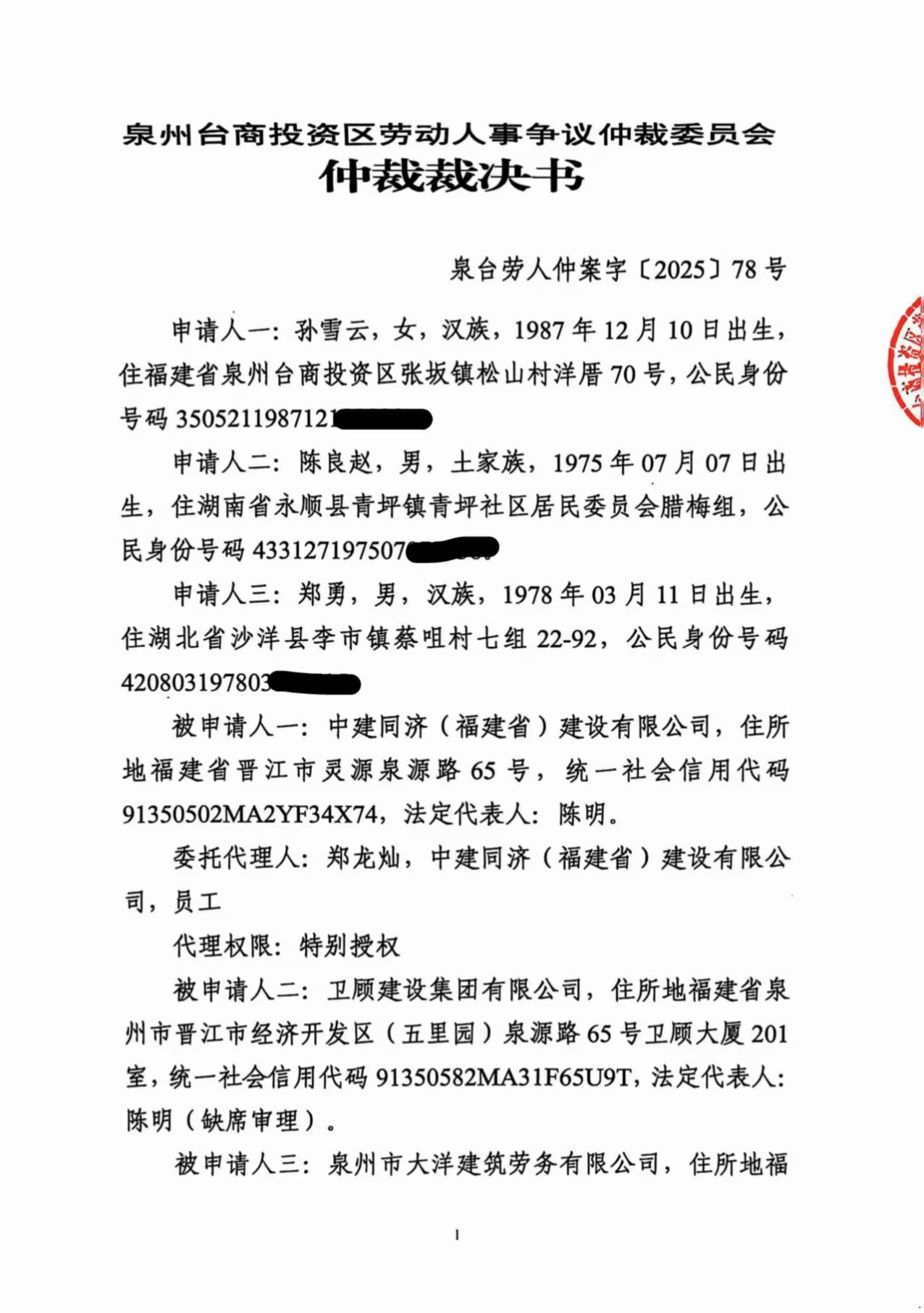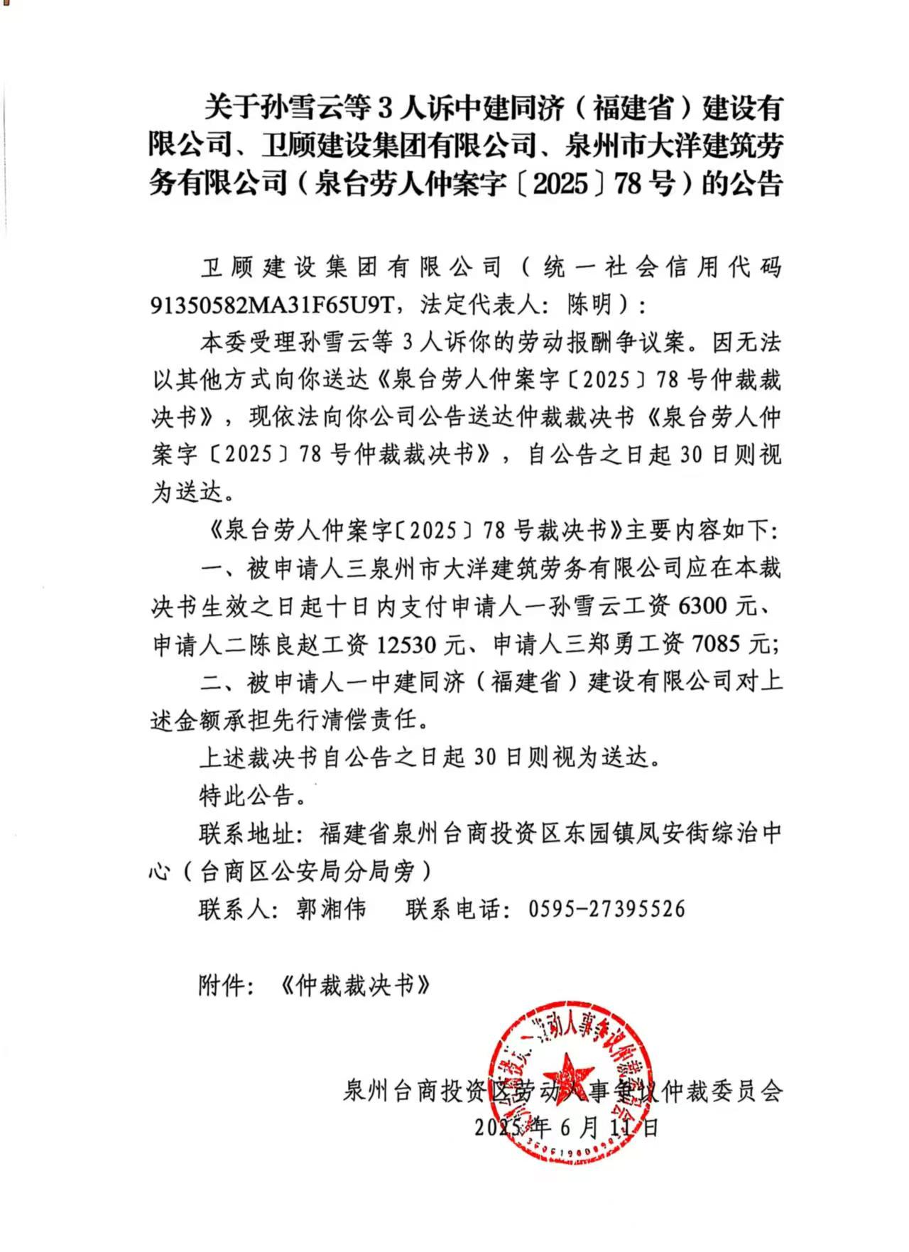 关于孙雪云等3人诉中建同济(福建省)建设有限公司、卫顾建设集团有限公司、泉州市大洋建筑劳务有限公司(泉台劳人仲案字[2025]78号)仲裁裁决书的公告